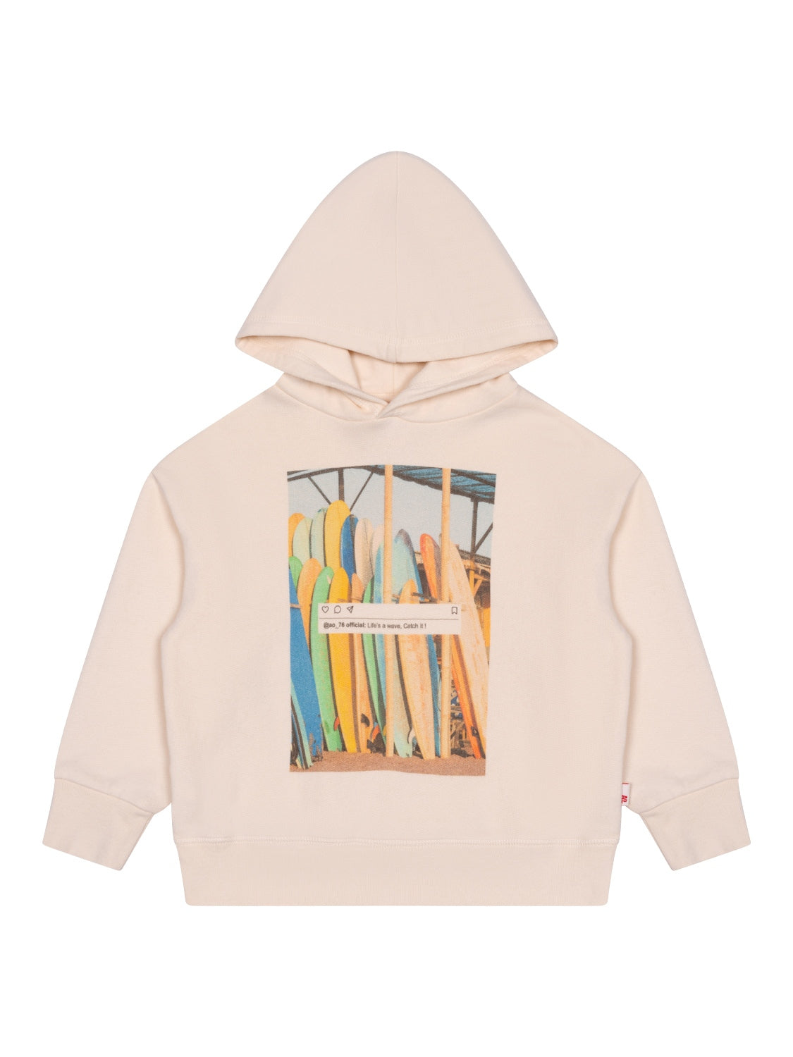 Der Arthur Hoodie Surfboards in Hellgelb von AO76 wird aus wunderbar weicher Baumwolle mit recyceltem Anteil hergestellt und verspricht dank der weich angerauten Fleeceinnenseite einen kuscheligen Tragekomfort. Ein origineller,farbenprächtiger Surfboards-Foto-Print mit Logo auf der Vorderseite wird zum besonderen Eyecatcher. Des Weiteren verfügt der Sweater über eine Kapuze, lange Ärmel, eine normale Passform sowie gerippte Abschlüsse an Bündchen und Saum. An der Seite werden von dem charakteristischen Logo-Etikett labeltypische Akzente gesetzt.