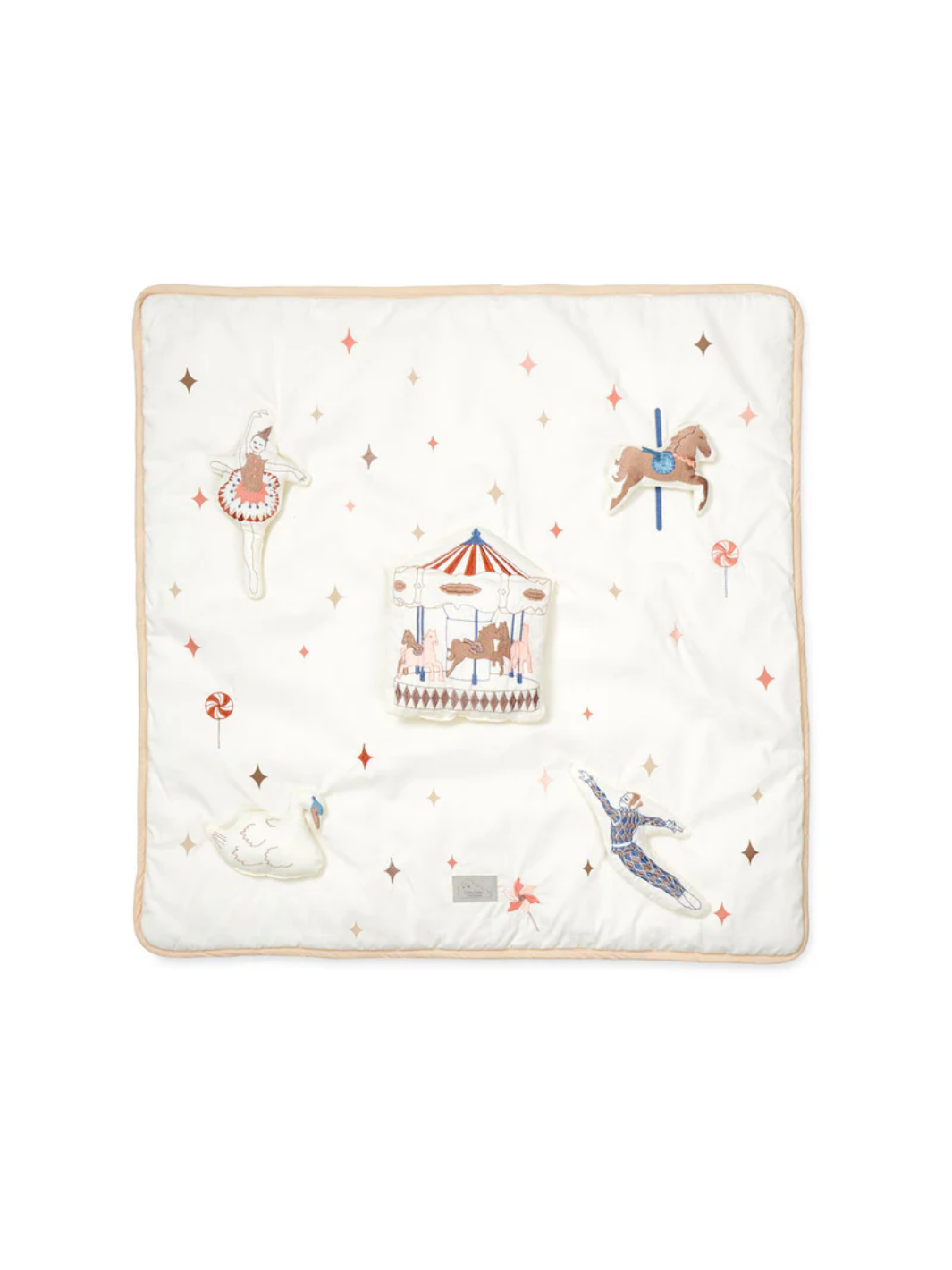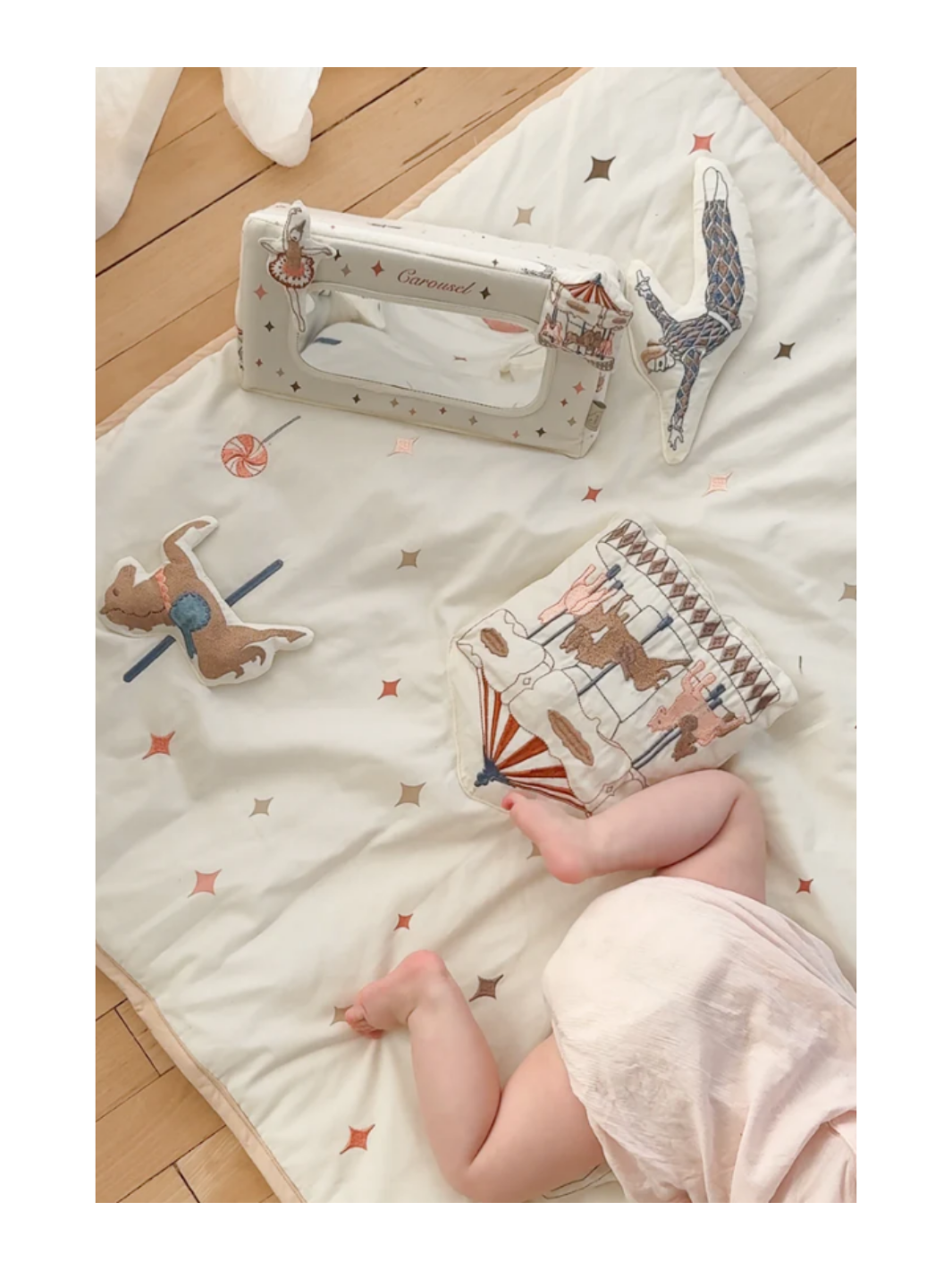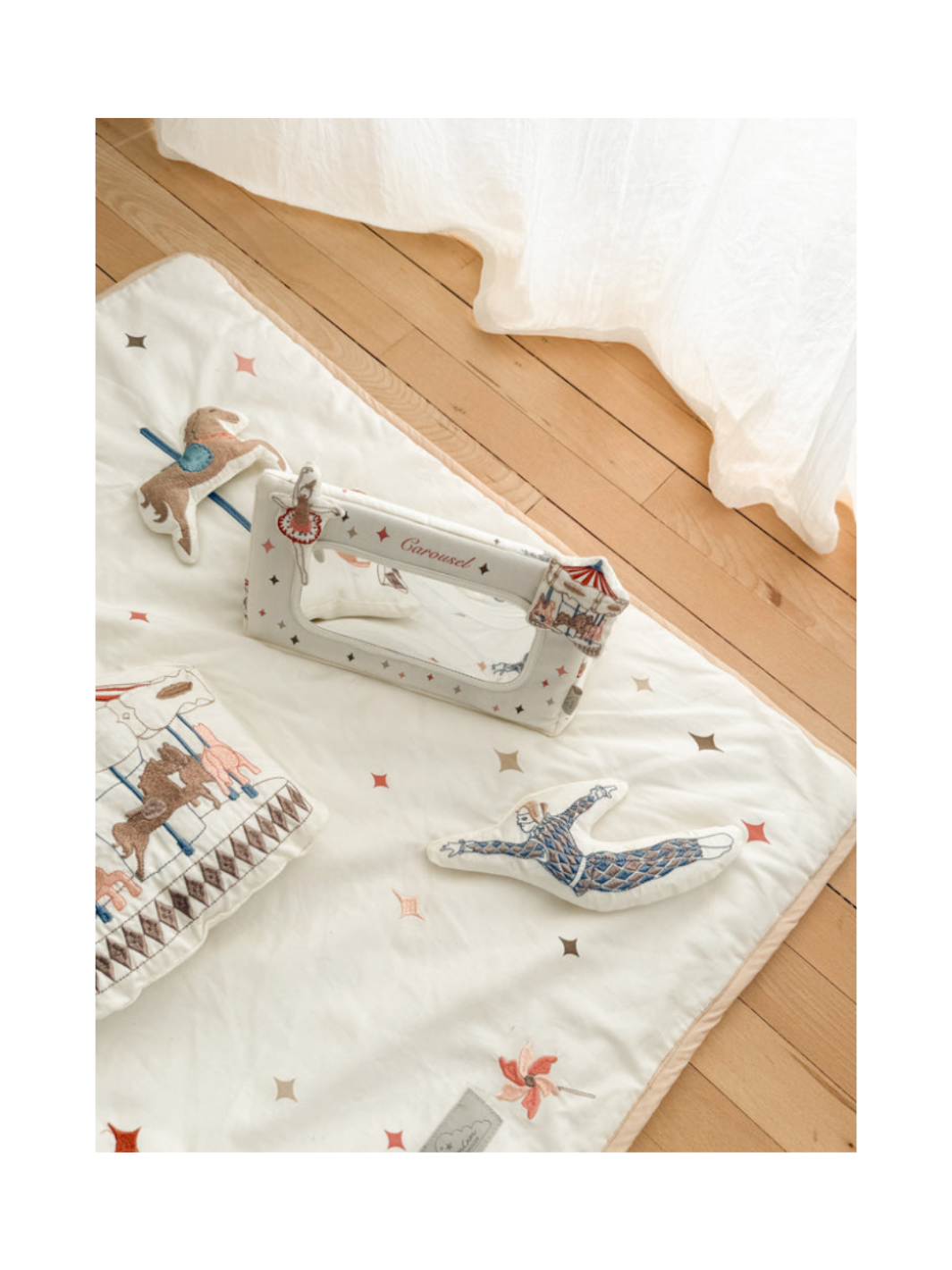 Diese ist ohne Frage die süßeste Activity-Spielmatte. Das verspielte Karussell-Design mit raffinierten Stickereien und Applikationen, die von der Magie eines Vintage-Vergnügungsparks inspiriert sind, in Kombination mit lustigen Funktionen wie einem Quietscher, einem Spiegel und Knisterpapier, sorgt für endlosen Spielspaß und fördert gleichzeitig die sensorische Entwicklung und Motorik der Kleinsten. Die Spielmatte ist in anmutigen Farben gestaltet und fügt sich mühelos in das Familienheim ein, wo sie dem Wohnzimmer oder Kinderzimmer einen gemütlichen Charme verleiht.