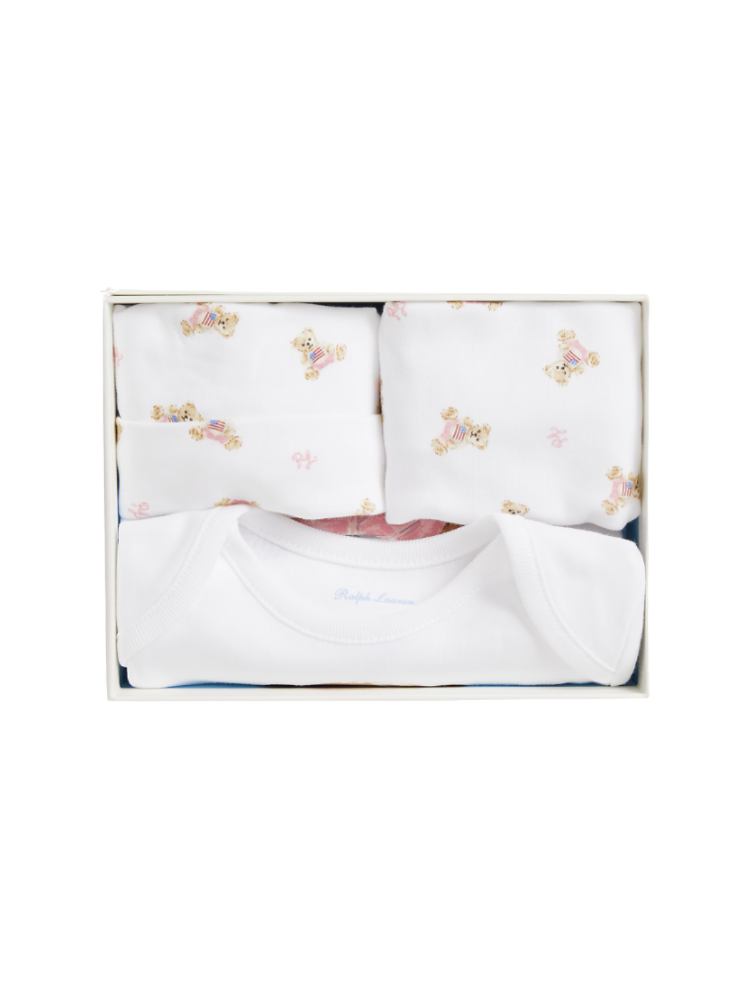 Dieses Geschenkset besteht aus einem langärmligen Babybody, einem Lätzchen und einer Mütze, die aus weicher Baumwolle gefertigt und mit einem charmantem Polo-Bear-Motiv bedruckt sind. Der Babybody hat einen Schlupfausschnitt, lange Ärmel, Ringdruckknöpfe am Saum und den Polo Bear mit US-Flagge als Druck vorne in der Mitte. Die Mütze hat das charakteristische Stick-Pony am Umschlag sowie ein gesäumtes Kopfteil mit Jerseyfutter. Das Lätzchen hat Träger mit Druckknopfverschluss hinten in der Mitte, gerippte Kanten, durchgehend gefüttert, charakteristisches gesticktes Pony unten auf der Vorderseite.