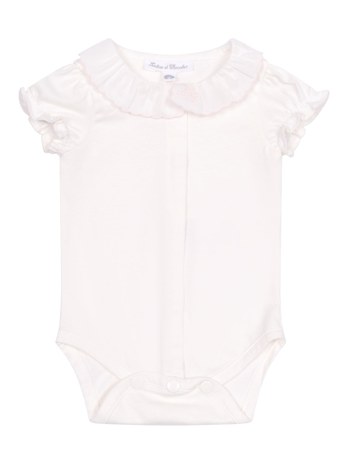 Als raffinierter Hingucker ist der elegante Rüschenkragen des Bodys mit einer rosafarbenen Muschelkante sowie der ikonischen TC-Stickerei verziert. Neben kurzen Puffärmeln verfügt der Body über eine verdeckte Druckknopfleiste vorn sowie einen praktischen Druckknopfverschluss im Windelbereich. Dank der extra weichen Baumwollqualität bietet der Body ein zartes Tragegefühl.