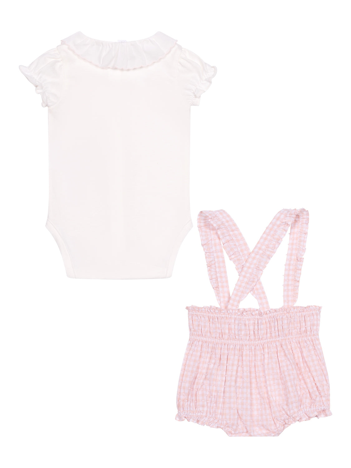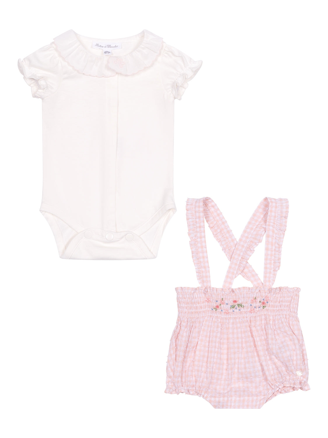 Dieses bezaubernde Set für Mädchen von Tartine et Chocolat besteht aus einem süßen Body und der dazu passenden Bloomer aus leicht texturiertem Voile.