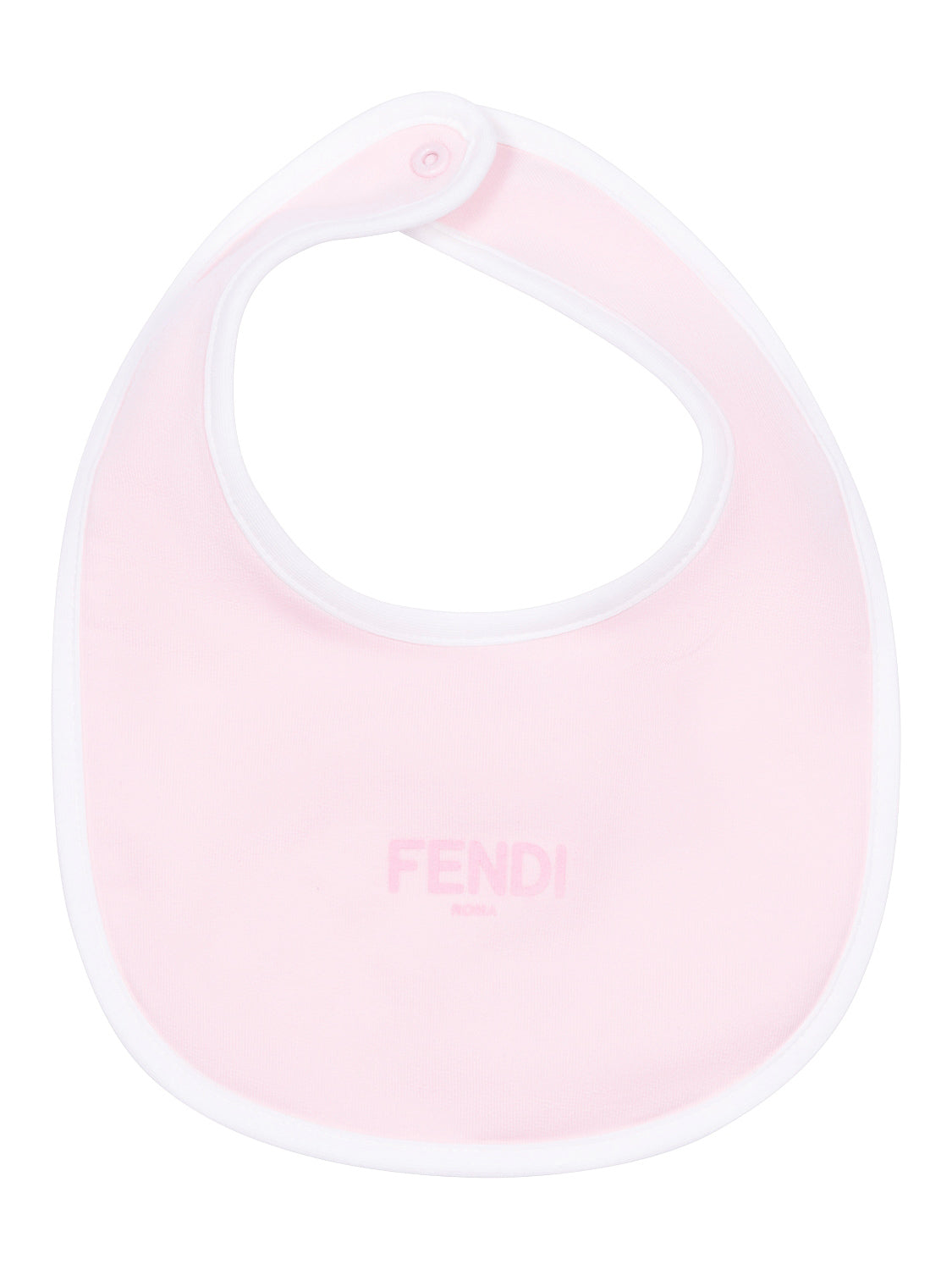 Das rosa Lätzchen aus weichem Baumwollfrottee ist mit einer Paspel in kontrastierendem Weiß versehen und wird im Nacken mit einem Druckknopf geschlossen. Vom ikonischen Fendi-Print erhält das Design ein labeltypisches Finish.
