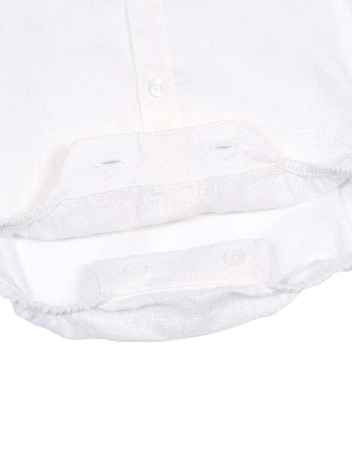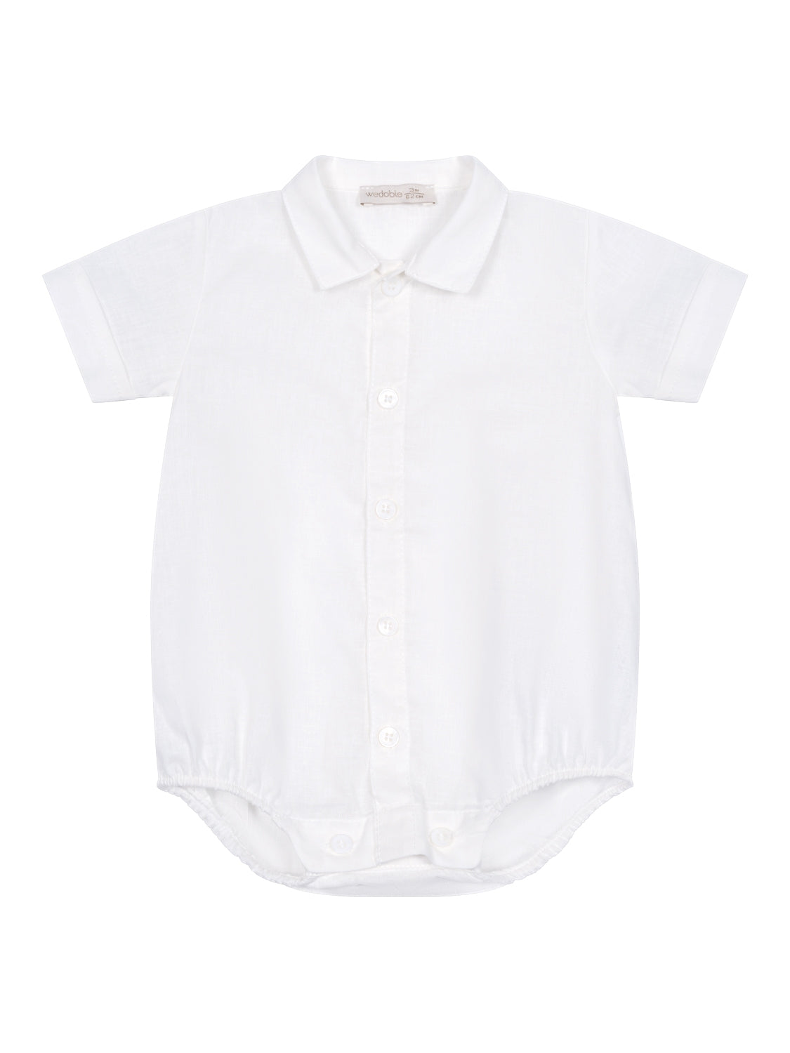 Dieser edle Kurzarm-Body in Weiß von Wedoble besteht aus einer luftig leichten Mischung aus Leinen und Baumwolle – einfach perfekt für warme Tage. Mit seinem klassischen Kragen, dem Frontverschluss mit Knöpfen und einem raffinierten Umschlag an den Ärmeln, lässt sich der Body gerade zu festlichen Anlässen wunderbar kombinieren. Elastische Beinöffnungen und ein praktischer Knopfverschluss im Windelbereich runden das Gesamtbild harmonisch ab.