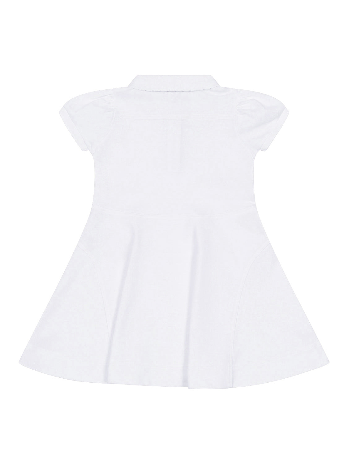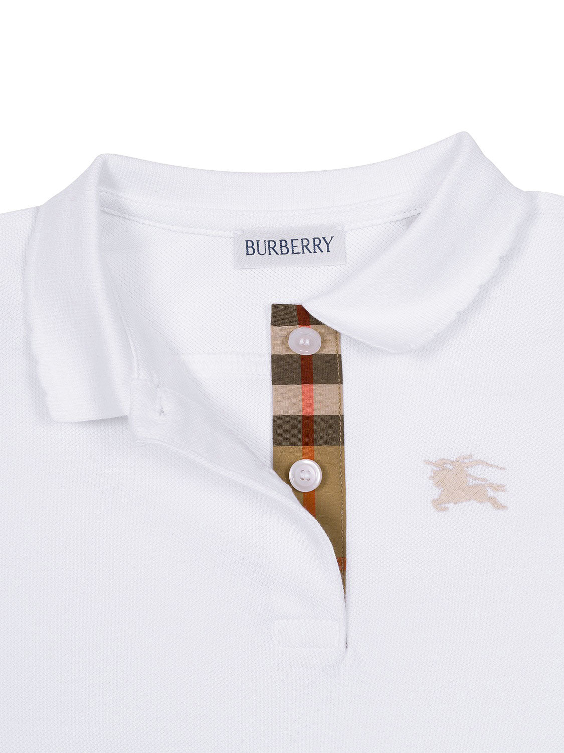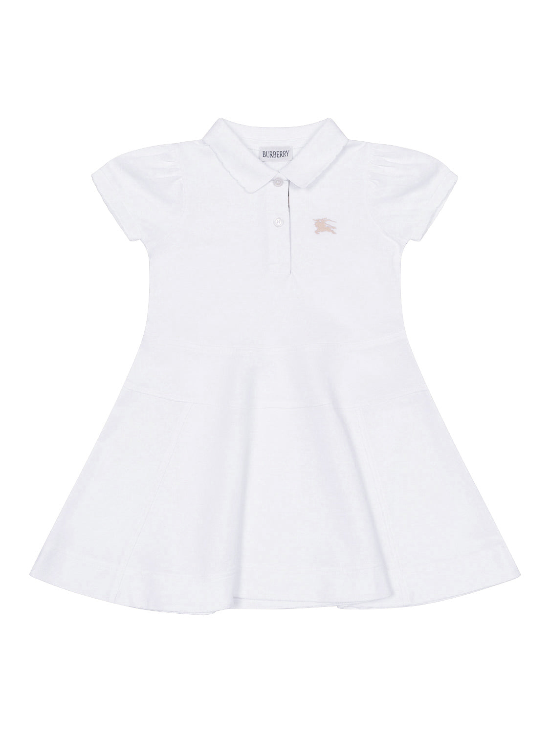 Dieses Kleid in Weiß von Burberry Kids vereint Stil und Komfort auf perfekte Weise. Die weiche Baumwollqualität, gepaart mit einem klassischen Design, schafft einen komfortablen Look für jeden Anlass. Neben einem Polokragen mit halber Knopfleiste verfügt das Kleid über kurze Puffärmel sowie einen angesetzten, ausgestellten Tellerock. Für ein verspieltes Finish schließen Kragen und Ärmel mit einer Muschelkante ab. Auf der Brust verleiht die ikonische Equestrian-Knight-Stickerei dem Design seinen labeltypischen Charakter.
