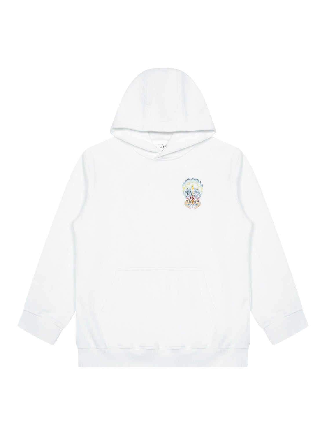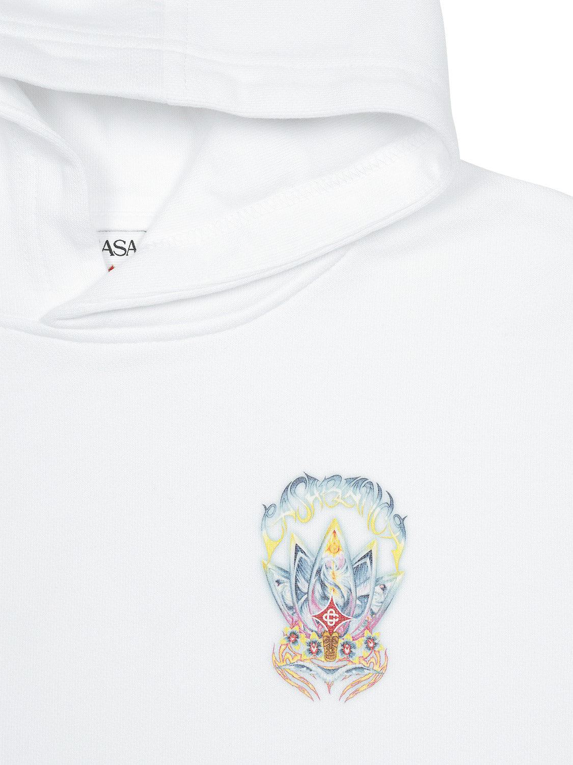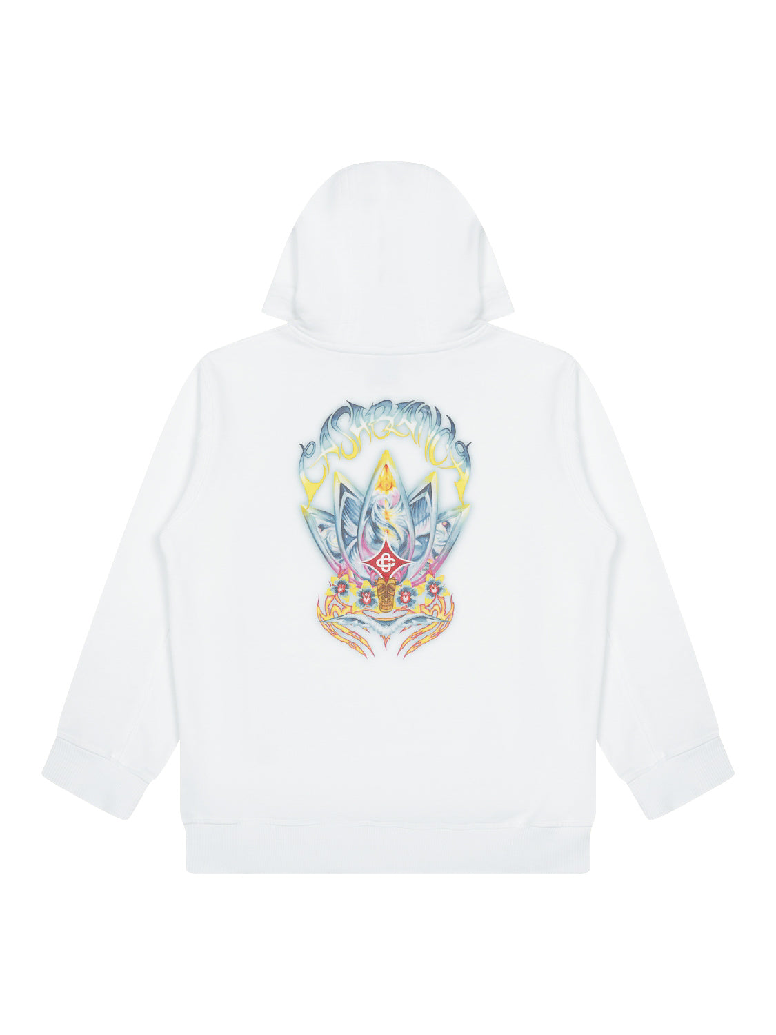 Der coole Boys Surf-Lotus-Hoodie in Weiß von Casablanca besticht durch ein psychedelisches Motiv in leuchtenden Farben auf der Vorder- und Rückseite. Das Motiv zeigt fünf Surfbretter in Form einer Lotusblume, begleitet von einer mit Orchideen verzierten Tiki-Maske.
