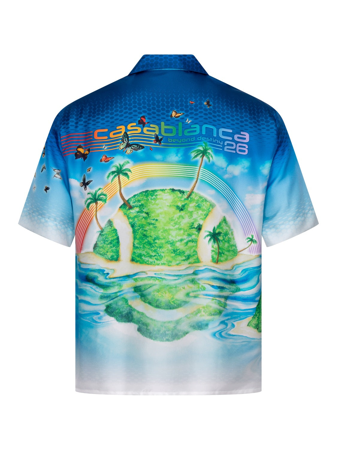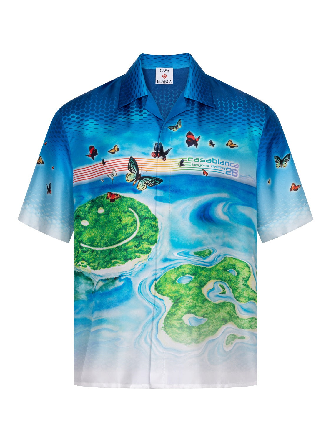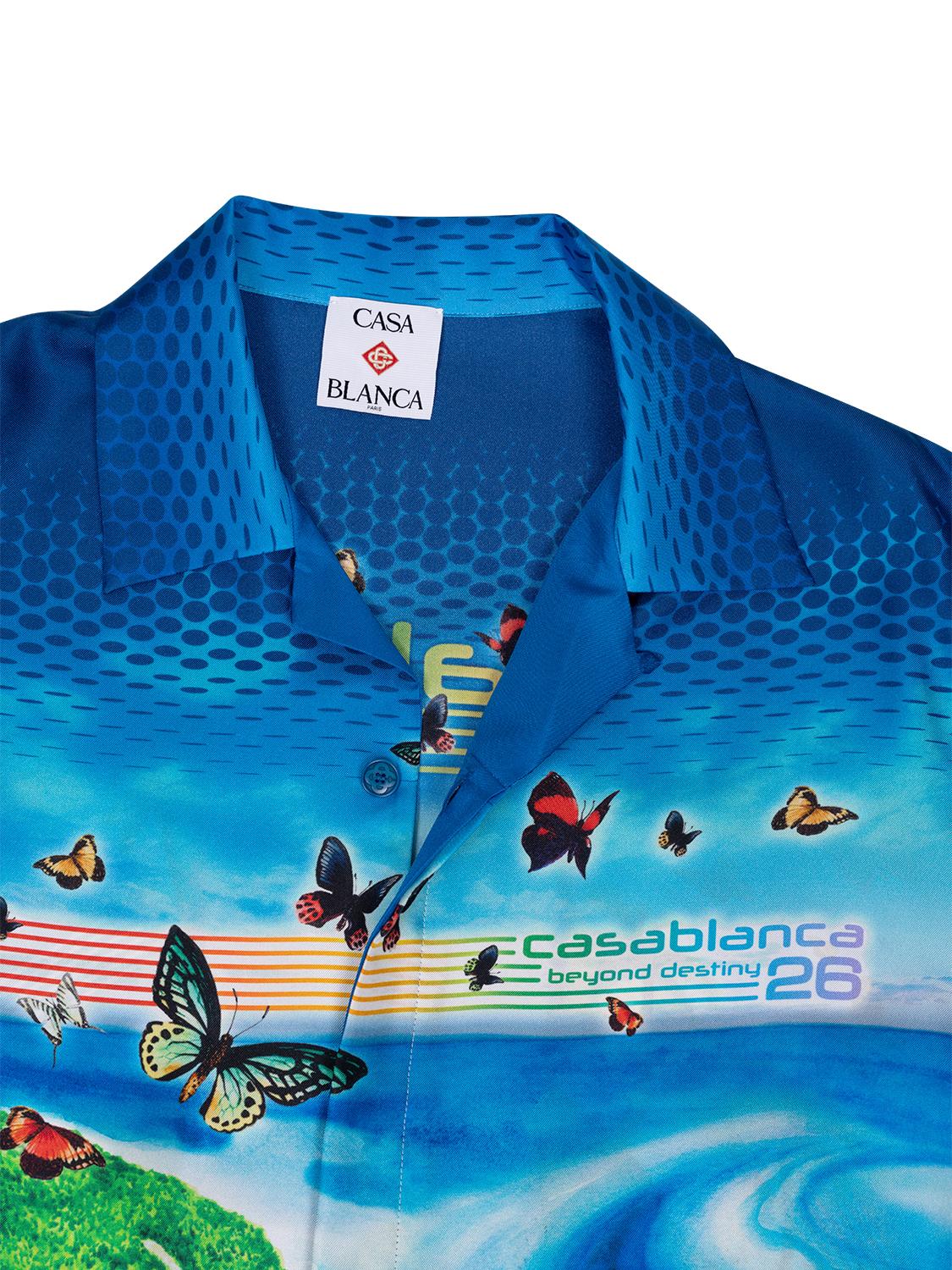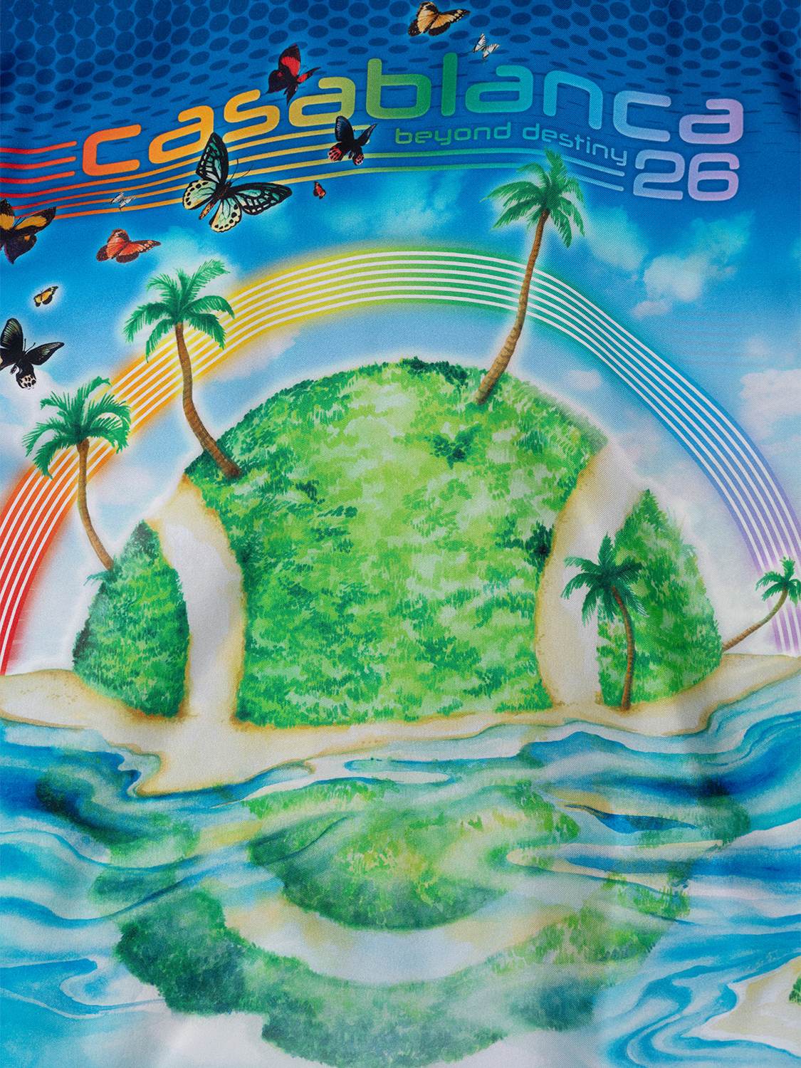 Das Beyond Destiny Kurzarmhemd von Casablanca interpretiert das klassische Souvenir-Seidenhemd auf völlig neue Weise. Digitale Kunst trifft auf Handwerkskunst: Halbtöne und Farbverläufe verbinden sich mit videospiel-inspirierten Motiven, während handbemalte Schmetterlinge und verträumte Inselpanoramen mit dem markentypischen CC-Logo verschmelzen, das selbst zu kleinen Inseln wird – Symbole für Flucht, Freude und Identität. Der kubanische Kragen und die kurzen Ärmel runden den Look mit einer entspannten, modernen Silhouette ab und machen das Hemd zu einem auffälligen, zugleich tragbaren Statement-Piece.