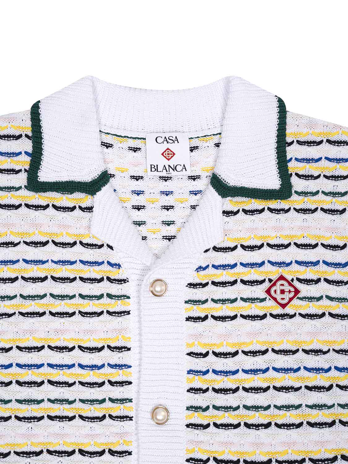Das Tuck Stitch Polo-Shirt von Casablanca ist ein fein gestricktes Modell, das mit dem ikonischen Diamant-Logo des Hauses verziert ist. Es verfügt über einen klassischen Knopfverschluss mit goldenen Perlenknöpfen und einem eleganten Randdetail. Der rippenbesetzte Kragen und der Saum mit kantigen Akzenten verleihen dem Shirt eine stilvolle und präzise Verarbeitung. Ein luxuriöses Design, das raffinierte Details und edle Materialien miteinander vereint.