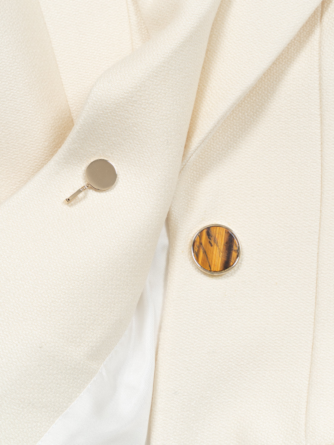 Die Jacke ist in einer Glockenform mit Korsett-Details gefertigt und die Trompetenärmel verleihen der eleganten Jacke einen maskulinen Touch. Der Verschluss auf der Vorderseite ist mit Onyx- und Tigerauge-Halbedelsteinen verziert, die für ein natürliches Finish sorgen.