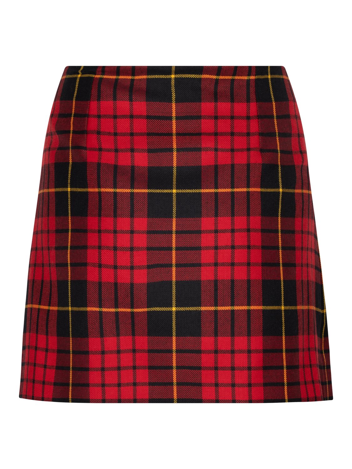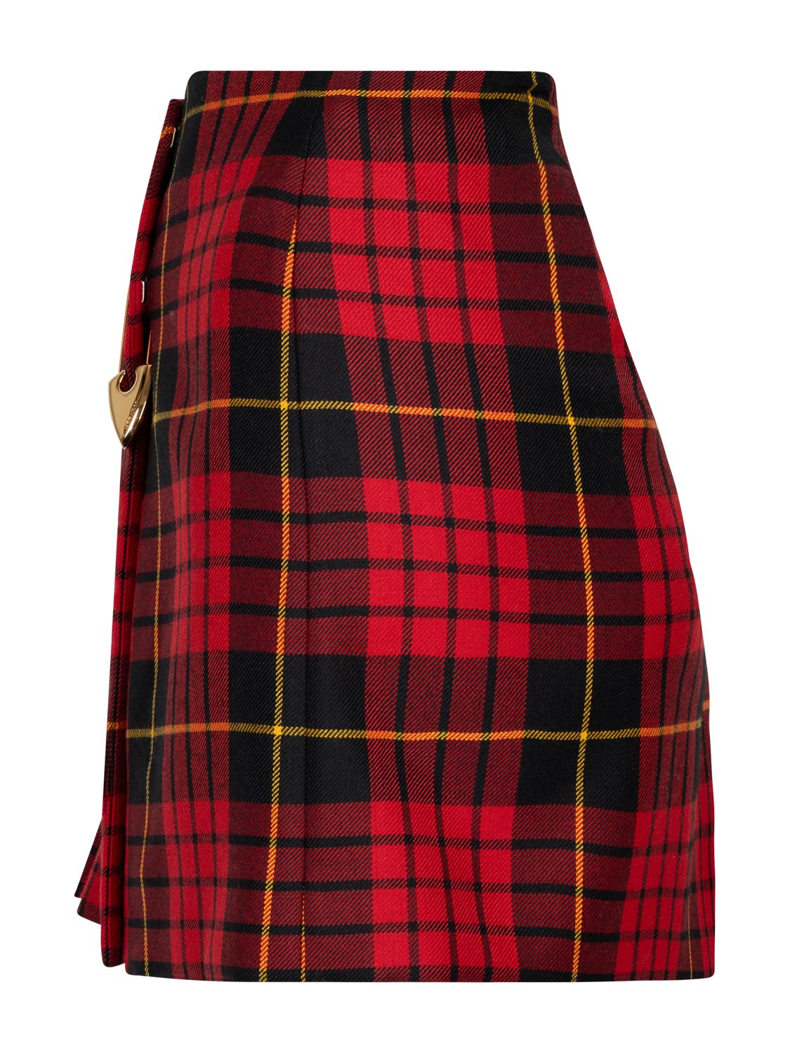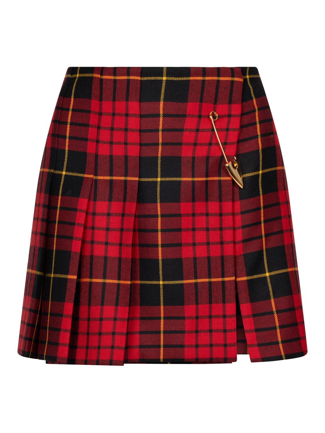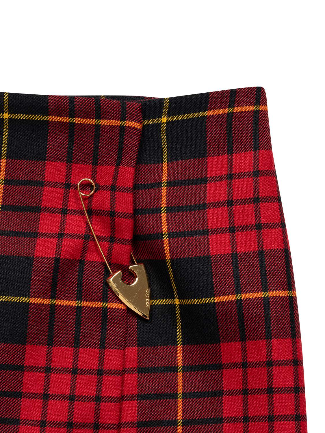 Der Plissee-Minirock von Alexander McQueen ist aus roter, schwarzer und gelber Schottenwolle gefertigt. Der Rock hat Faltendetails und wird mit einem Hakenverschluss geschlossen. Auf der rechten Seite des Rockes befindet sich eine goldene Anstecknadel.
