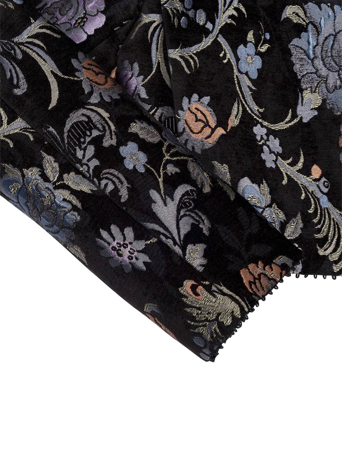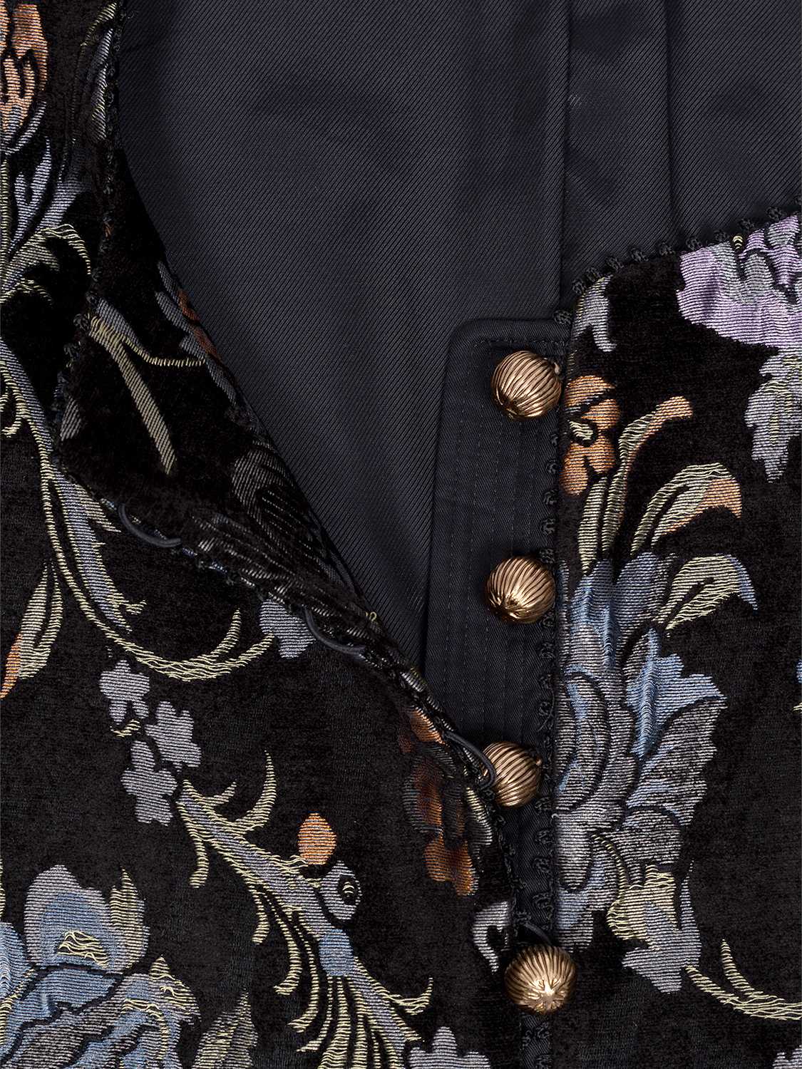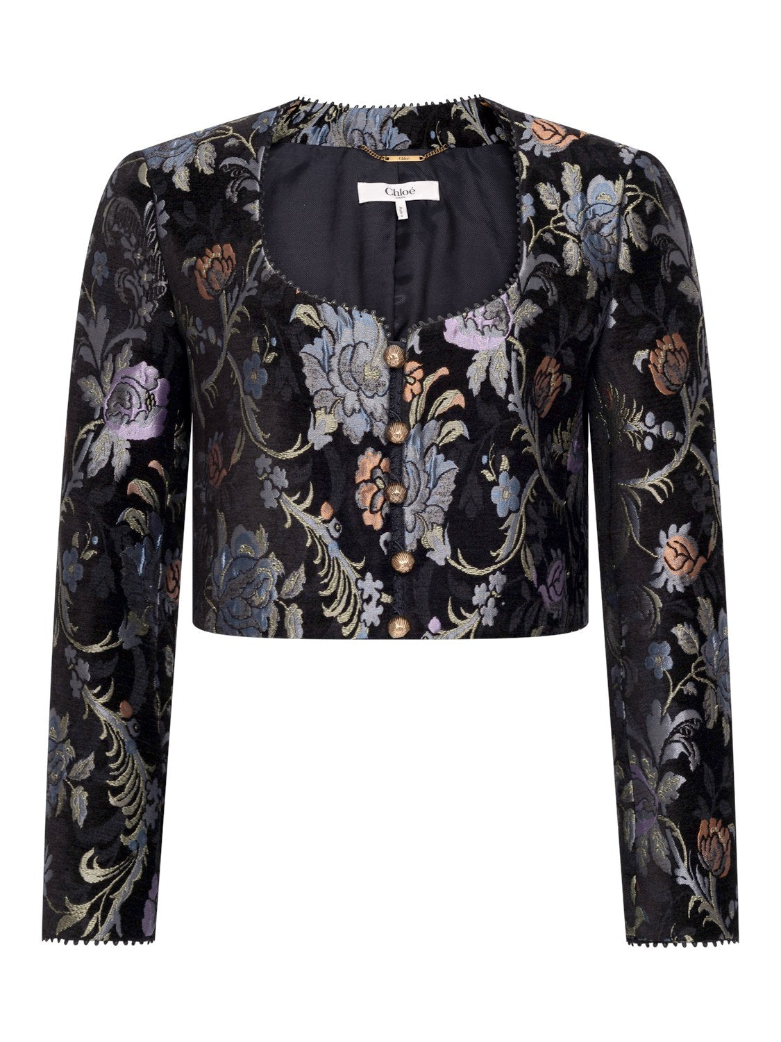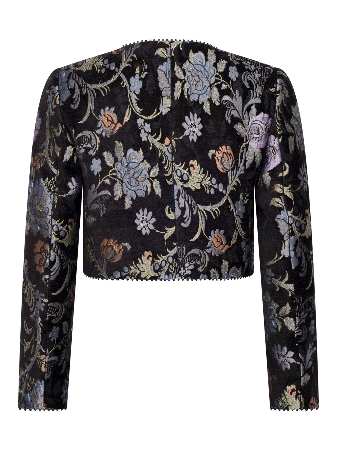 Dieser Blazer besticht durch seine gerade, kastenförmige Form und den klassischen Rundhalsausschnitt, der eine schlichte und zugleich elegante Linie schafft. Leicht betonte Schultern verleihen zusätzliche Struktur und unterstreichen die definierte Silhouette, während die Knopfleiste als stilvoller Verschluss dient. Das glatte Innenfutter sorgt für ein angenehmes Tragegefühl und erleichtert das An- und Ausziehen. Besonders reizvoll wirkt das florale Muster in Jacquard-Optik mit Samt, das dem Blazer Tiefe, Struktur und einen edlen Charakter verleiht. Abgerundet wird das Design durch feine Picotbänder an den Kanten, die dezente dekorative Akzente setzen und die hochwertige Verarbeitung dieses eleganten Kleidungsstücks zusätzlich betonen.