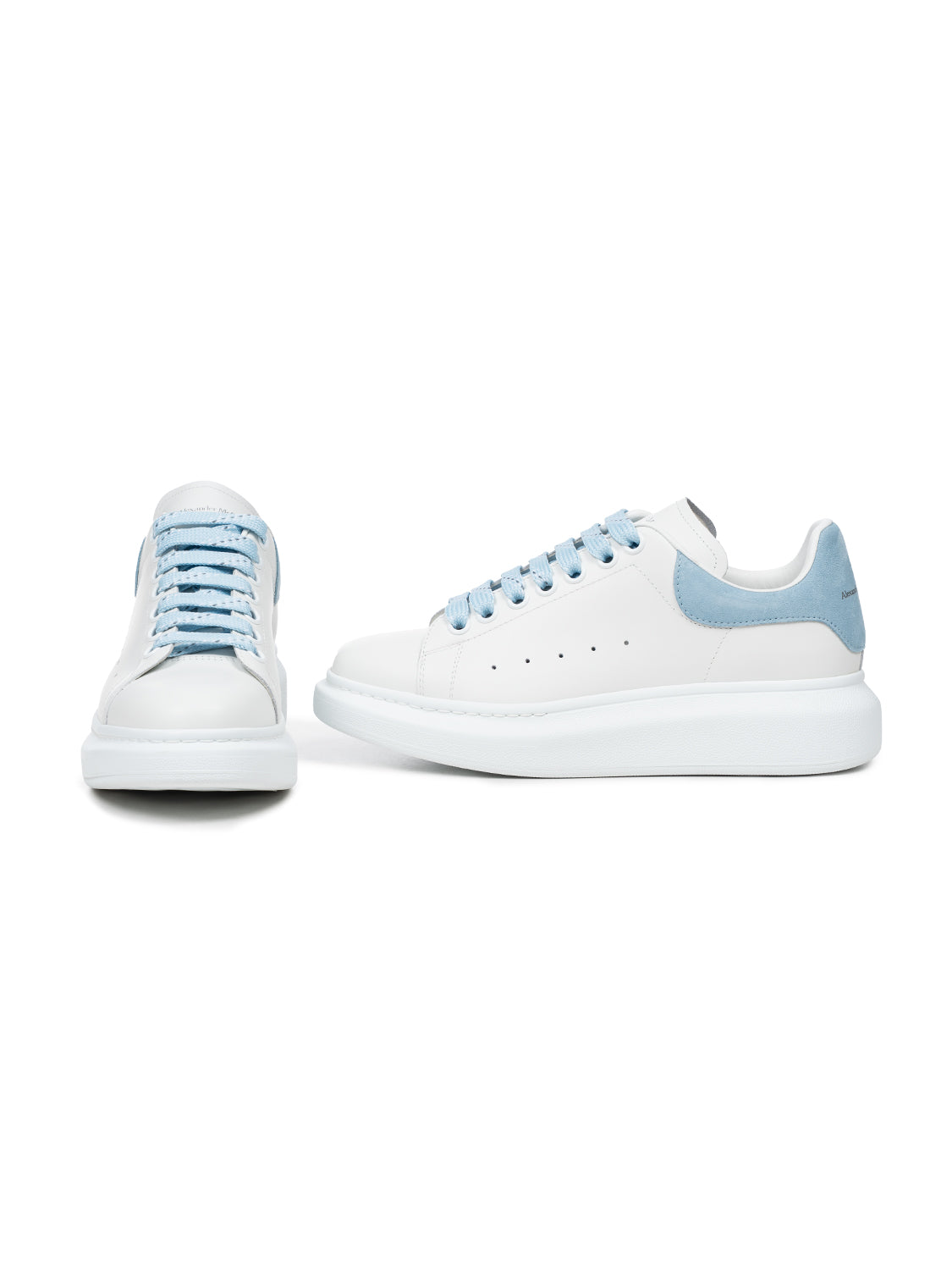 Die legendären Plateau-Sneakers von Alexander McQueen aus glattem Kalbsleder. Die Schuhe haben eine runde Zehenpartie, breite Schnürsenkel und ein Alexander McQueen-Logo auf der Zunge und der blaufarbenen Fersenkappe. Das Besondere an diesem Sneaker ist die kräftige Gummisohle mit einem integrierten Keilabsatz für mehr Höhe und Komfort.