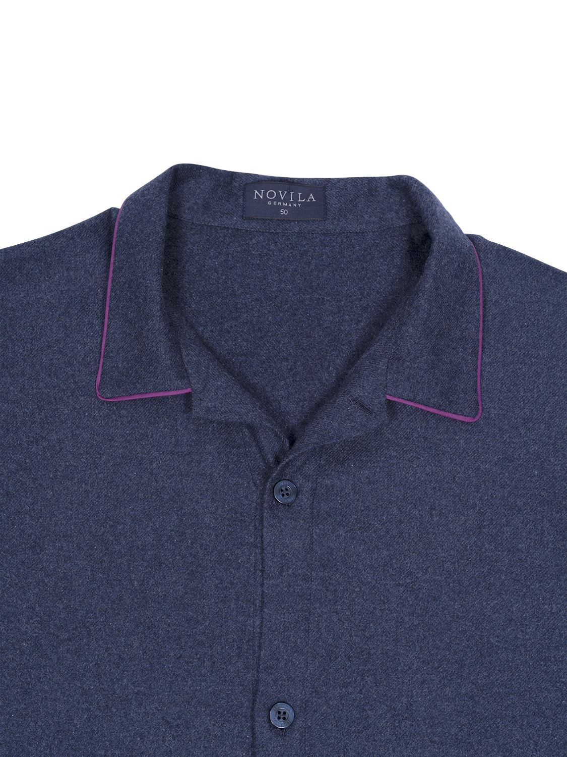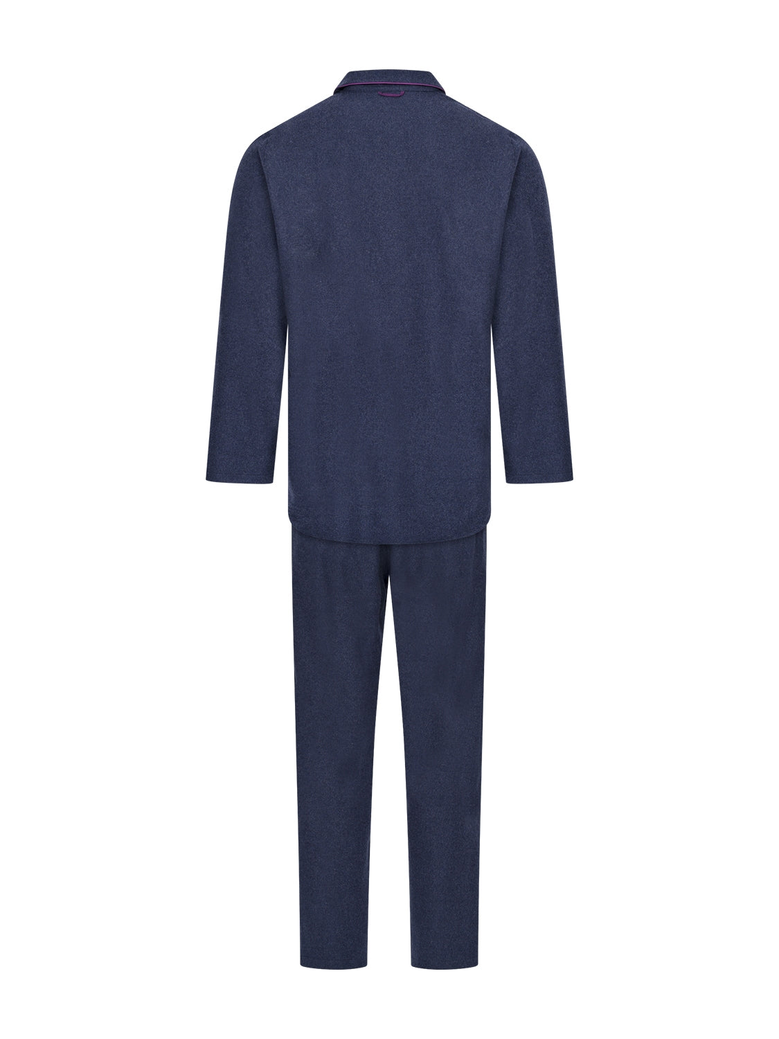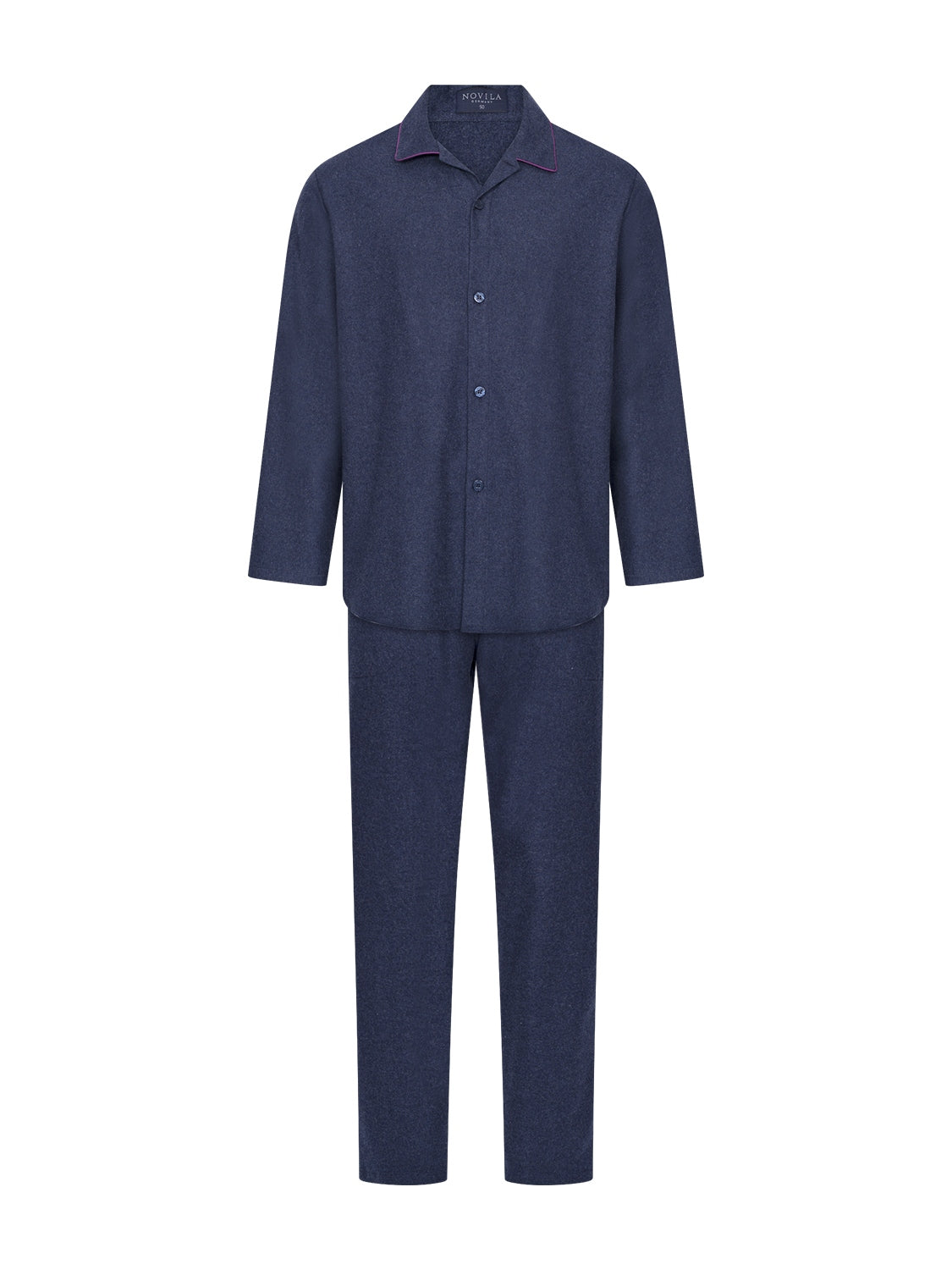Dieser Pyjama in klassisch-zeitlosem Grau erhält durch die feinen lila Abschlüsse eine stilvolle Note. Die Jacke überzeugt mit abgerundetem Saum sowie eleganter Paspelierung an Kragen und Ärmeln. Die Hose ist mit zwei praktischen Seitennahttaschen ausgestattet und kommt bewusst ohne Eingriff aus – für eine klare, moderne Linienführung. Der komfortable Novila-Bund sowie ein Aufhänger sorgen für zusätzlichen Tragekomfort und Funktionalität. Ein durchdachtes Design für entspannte Stunden mit Stil.