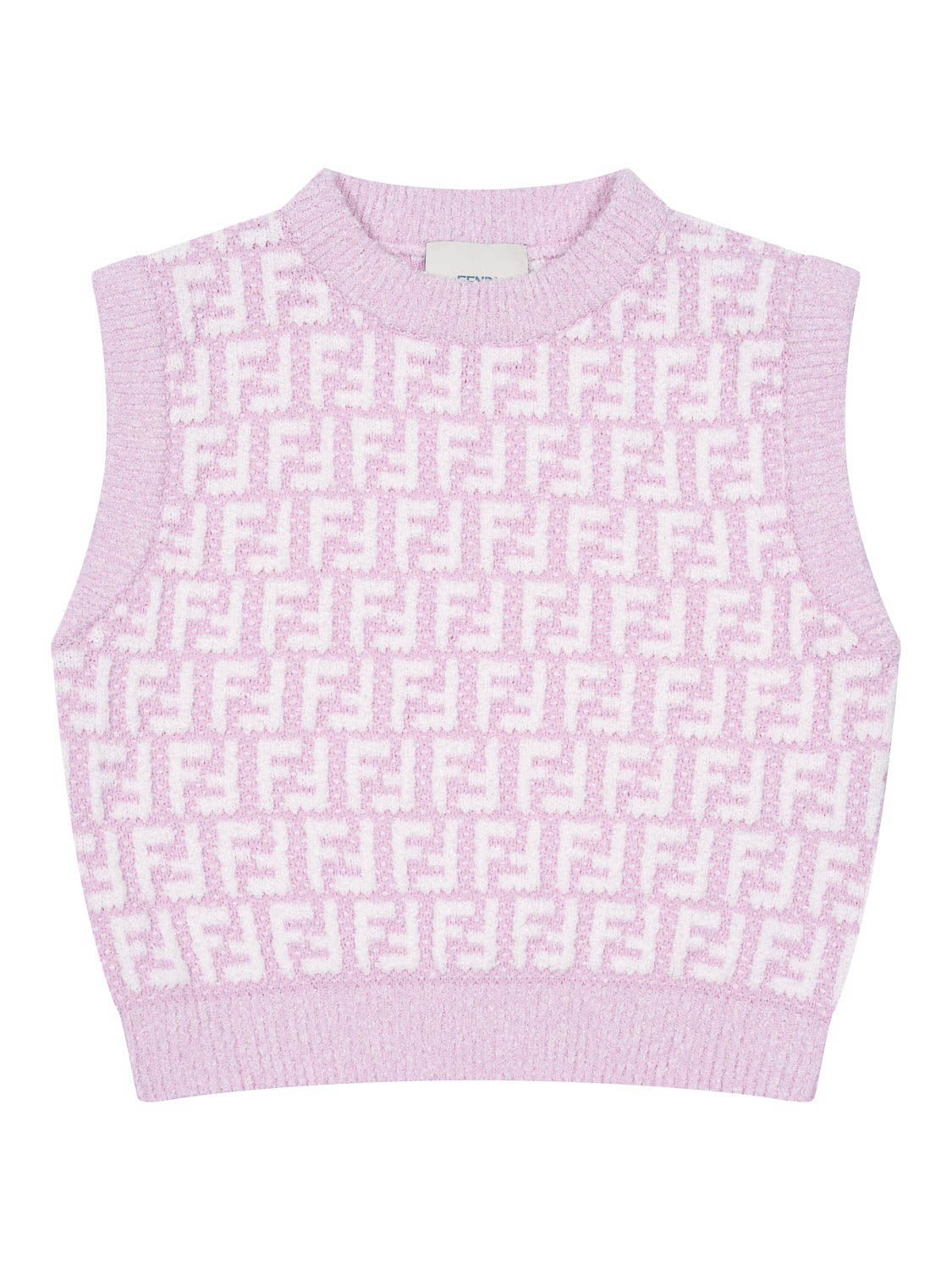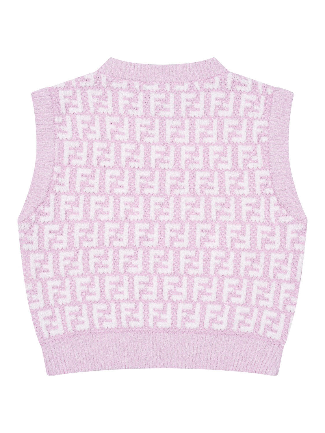 Dieser edle Pullunder in Rosa von Fendi Kids präsentiert sich im Bouclé-Stil mit dem ikonischen FF-Logo. Dank der weichen Materialqualität aus einer Baumwoll-Viskose-Mischung verspricht das Rundhals-Modell ein angenehmes Tragegefühl, während elastische Rippstrickabschlüsse für zusätzlichen Komfort sorgen und sich perfekt anpassen.