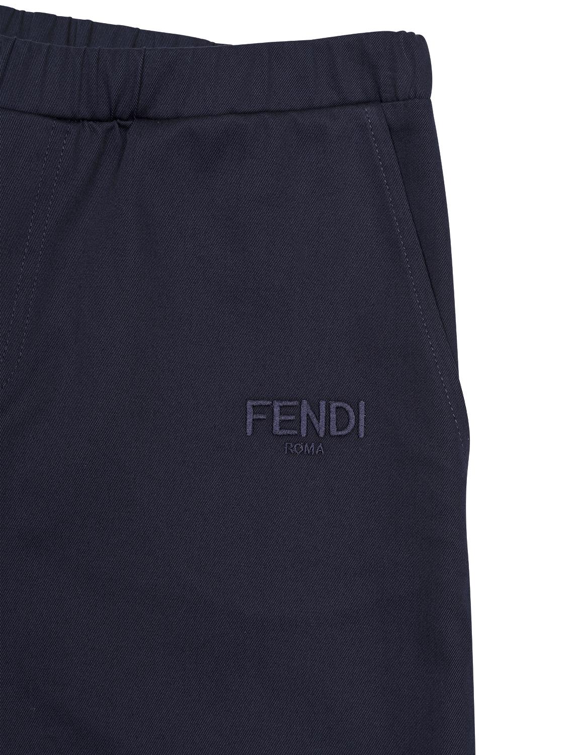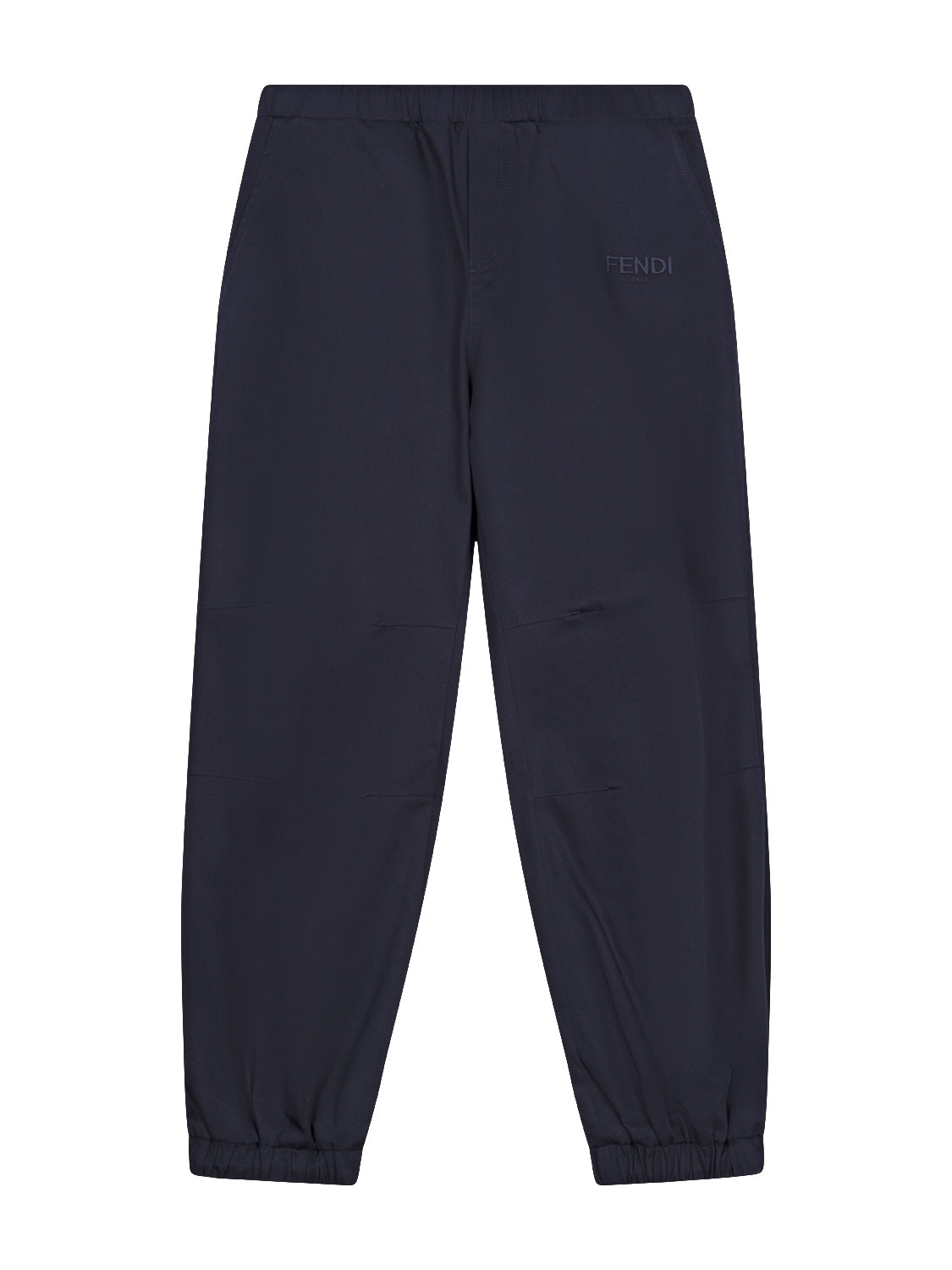 Diese edle Hose in Blau von Fendi Kids besticht mit einem schlichten Design und verspricht dank einer Herstellung aus leichter Stretch-Baumwolle ein traumhaftes Tragegefühl. Neben einem elastischen Bund verfügt das Modell über seitliche Eingriffstaschen, Gesäßtaschen sowie ein gerades Bein mit elastischen Bündchen. Auf der Vorderseite erhält das Gesamtbild von der ikonischen Logo-Stickerei in gleicher Farbgebung ein labeltypisches Finish.