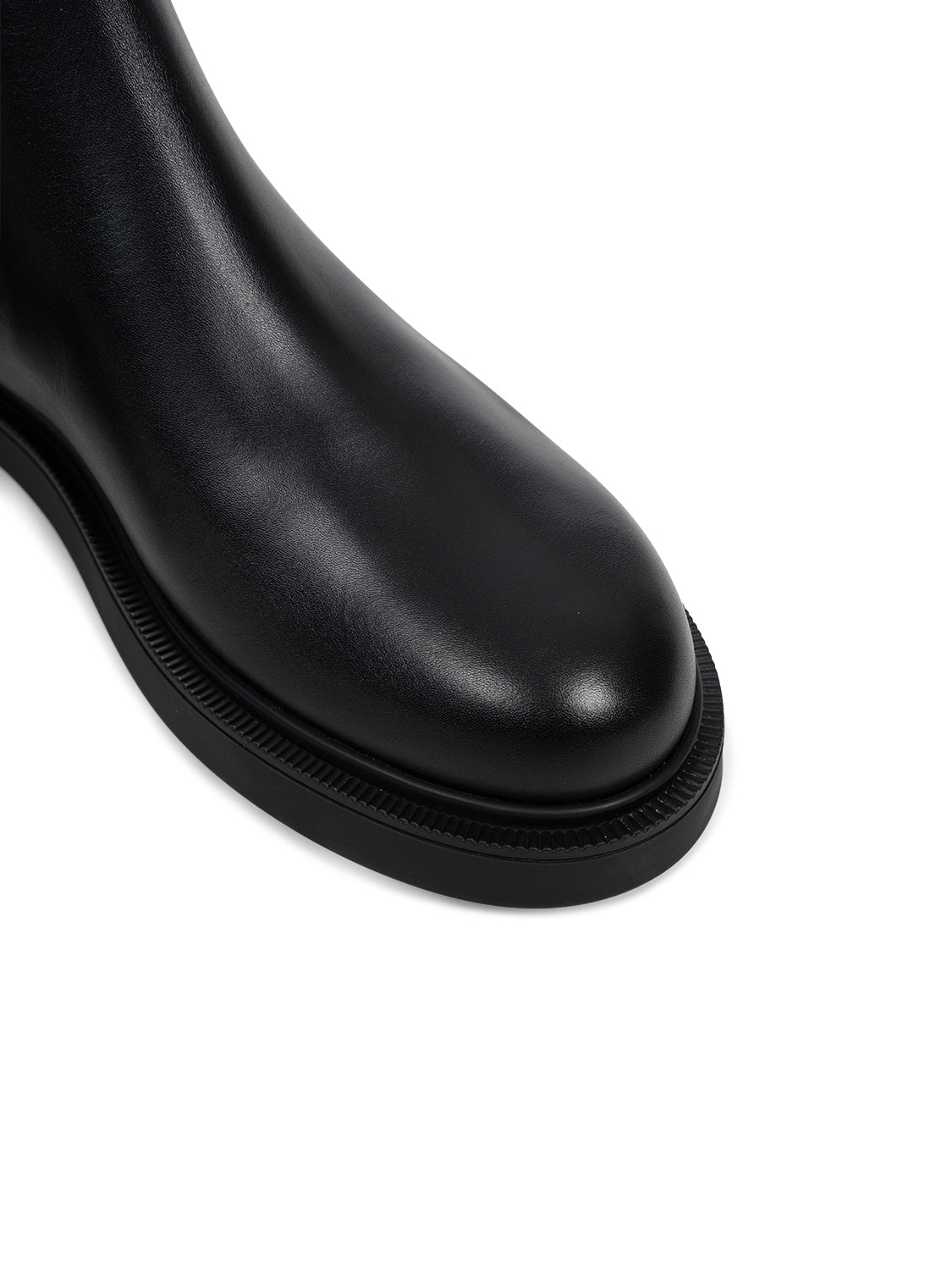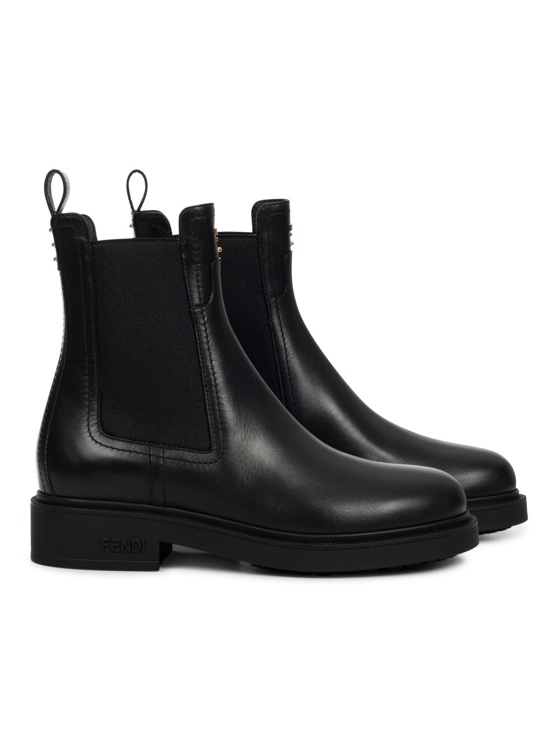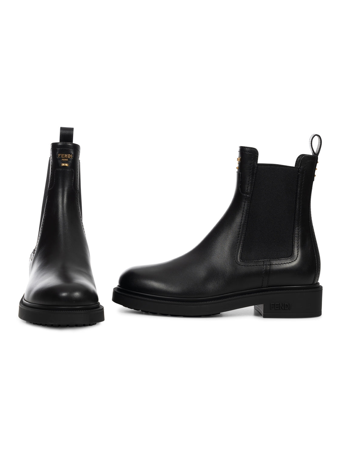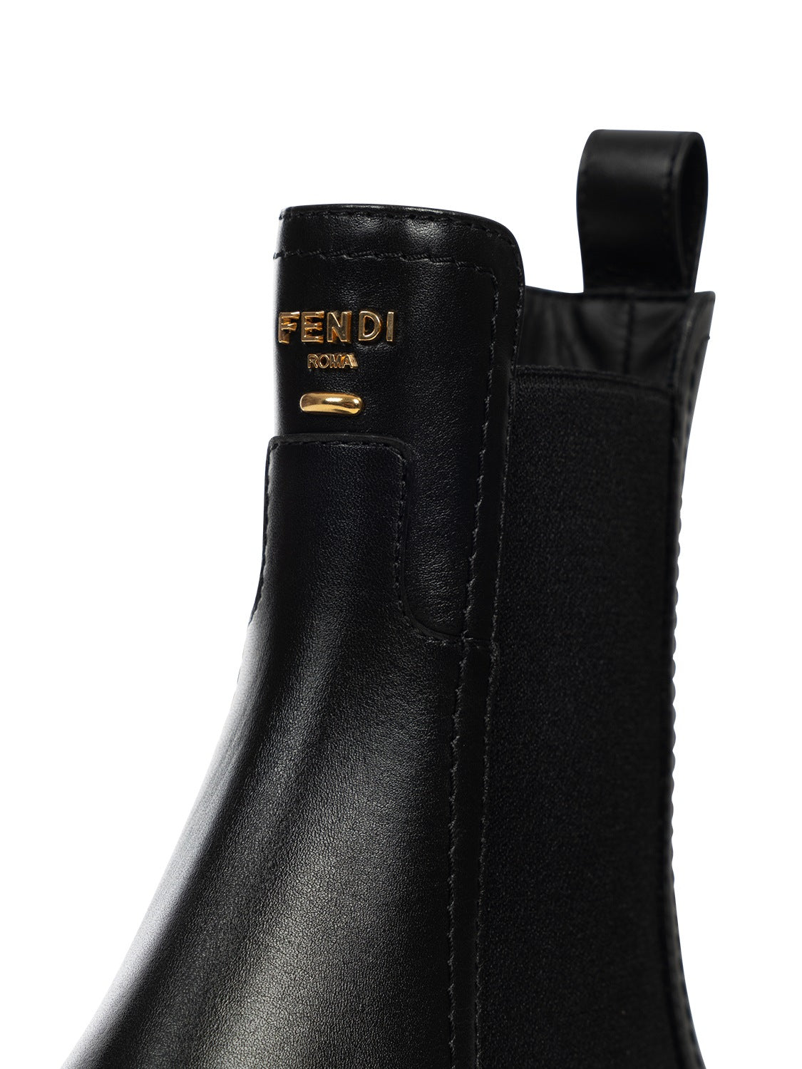 Der schwarze Fendi Filo Bikerboot mit runder Schuhspitze und elastischem Einsatz an der Seite ist aus Leder gefertigt. Auf der Vorderseite befindet sich ein Fendi-Schriftzug aus Metall in Relief-Optik. Die Sohle und der Absatz sind aus Gummi und haben den Fendi-Schriftzug an der Seite.