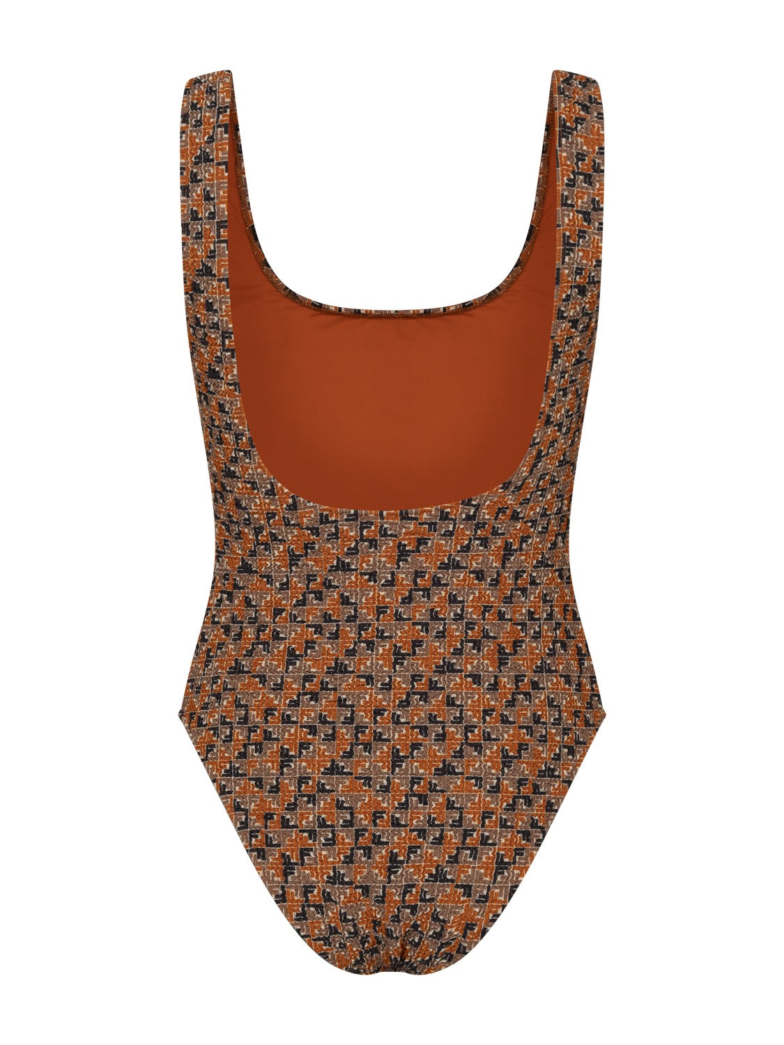 Badeanzug aus Lycra mit charakteristischer Textur in Relief-Optik und bedrucktem kleinem FF-Puzzle-Muster im Allover-Stil in einem Mix aus den Kontrastfarben Orange und Schwarz von Fendi.