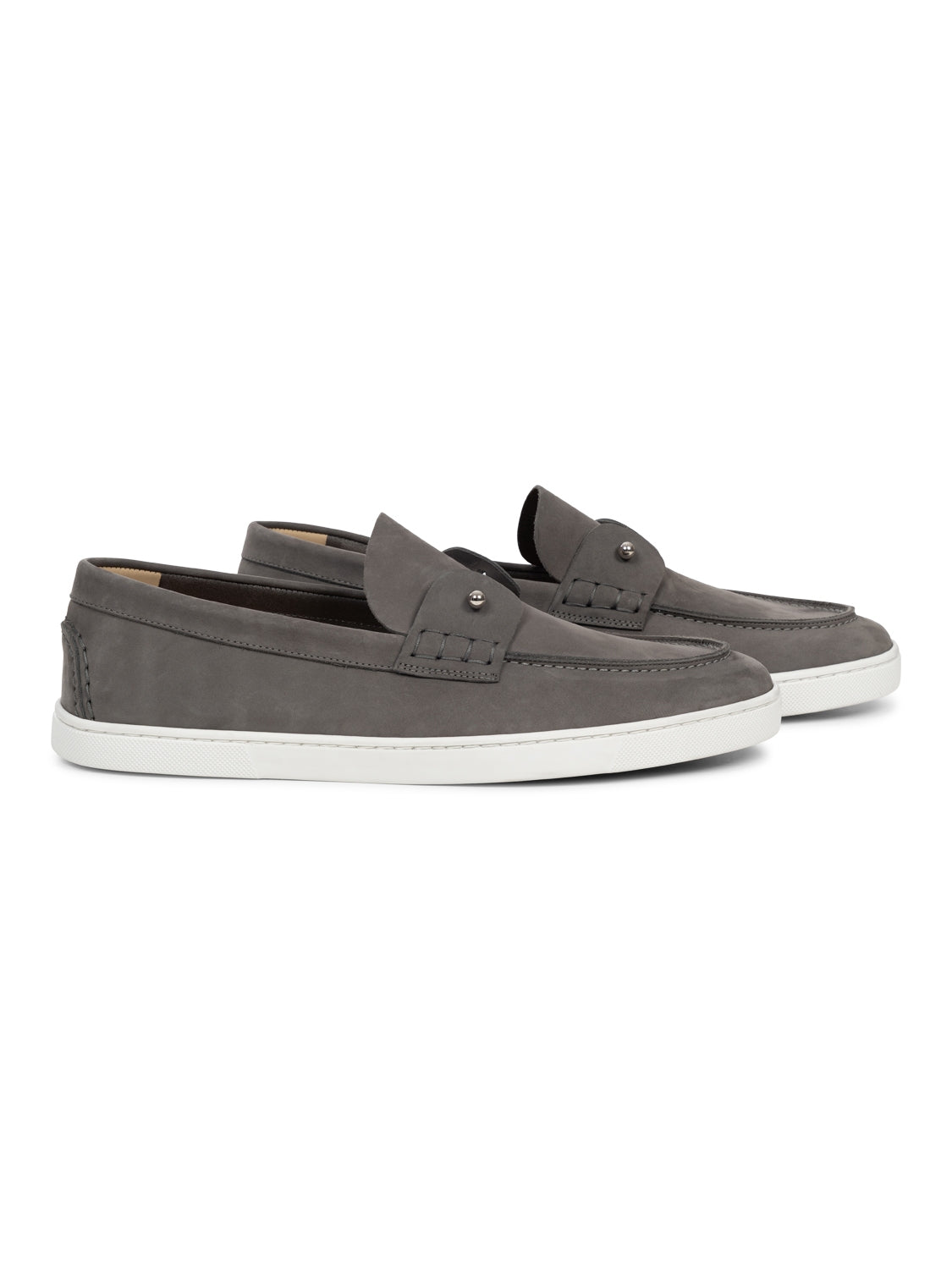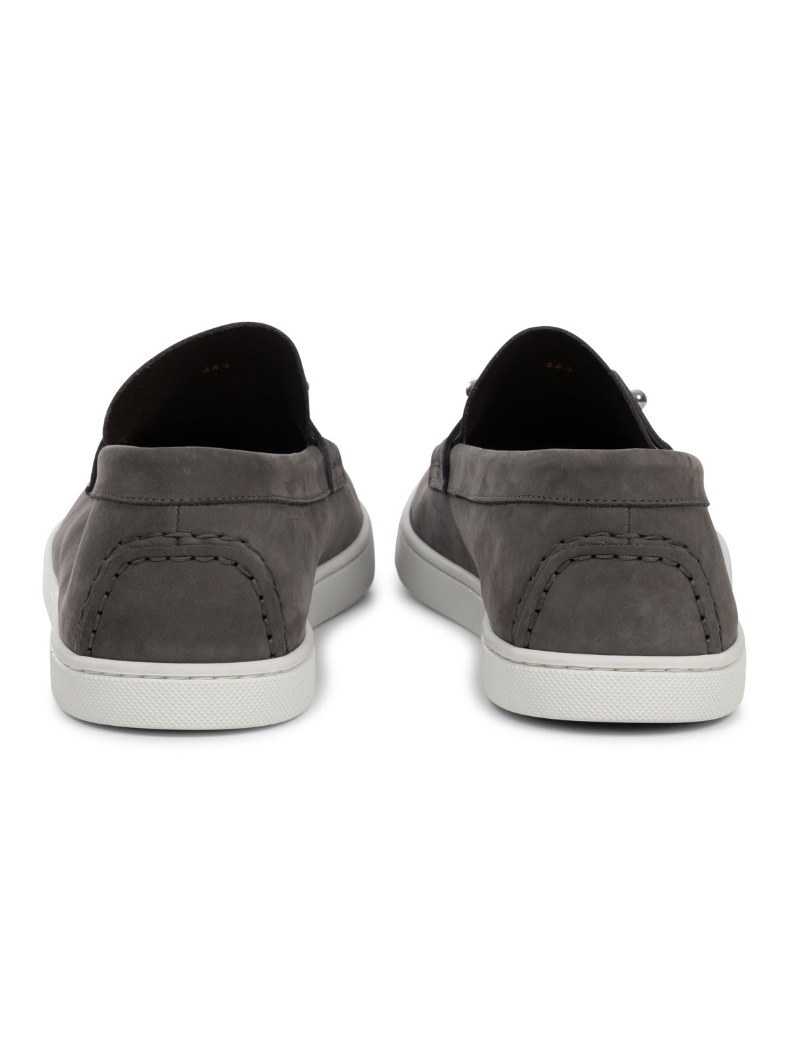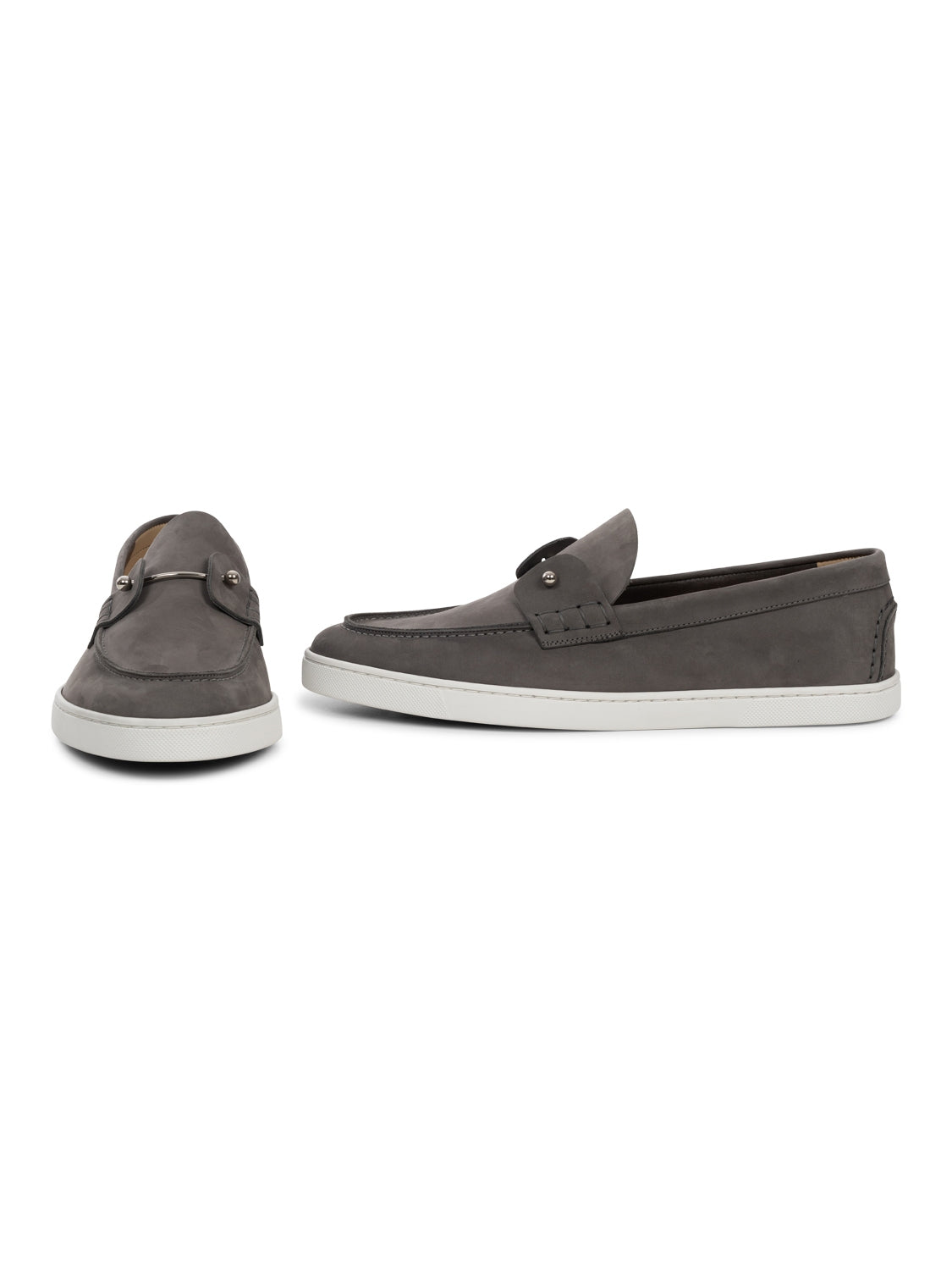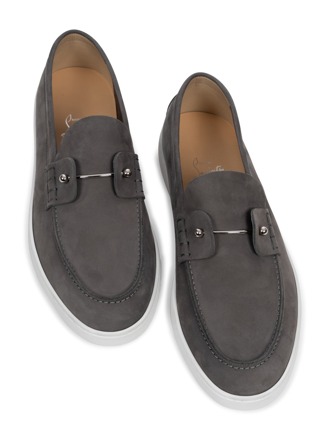 Die Christian Louboutin Slipper sind aus weichem, grauen Wildleder gefertigt. Mit einer edlen Metallschnalle und der charakteristischen roten Laufsohle bieten sie einen eleganten Look.