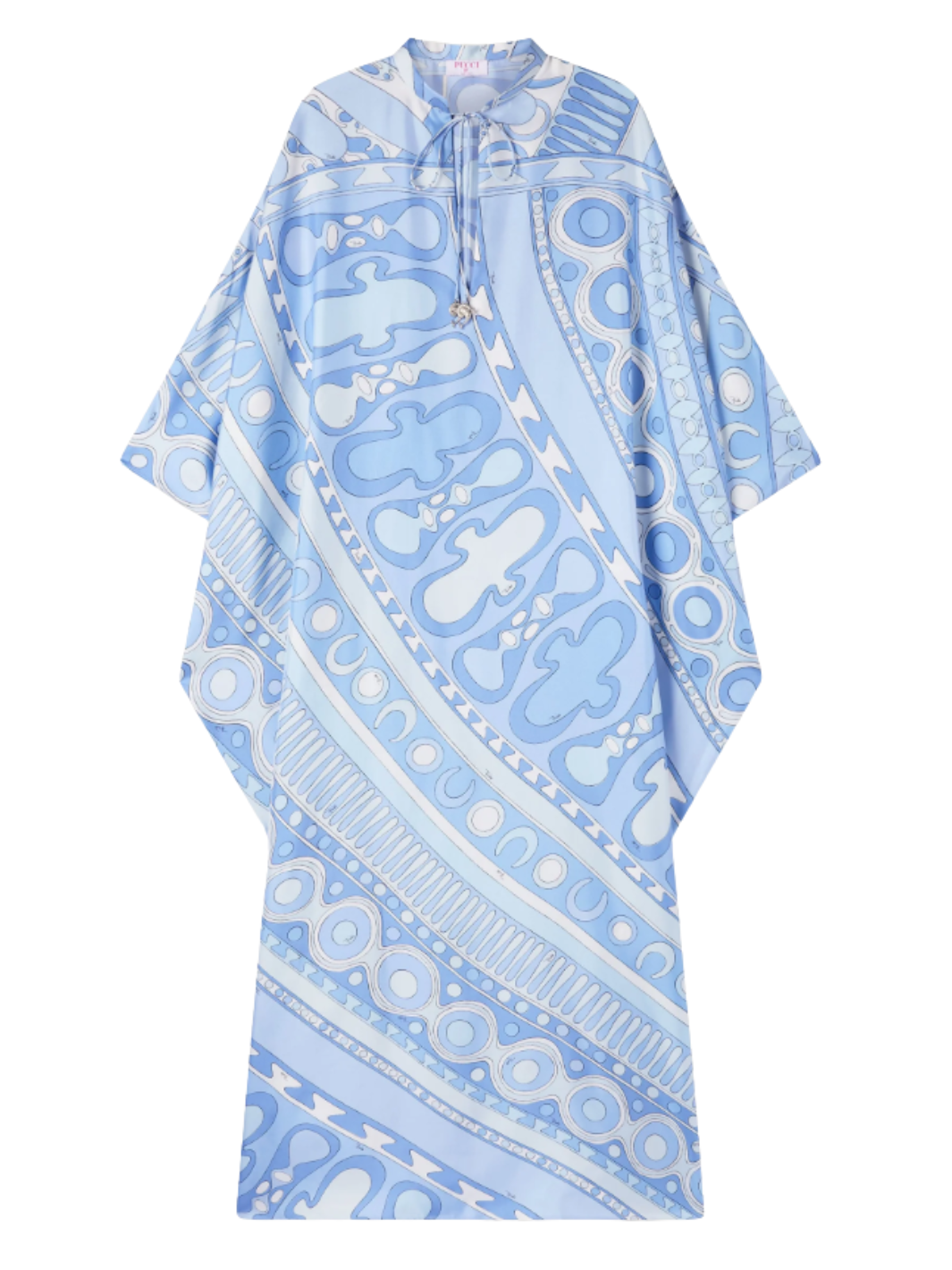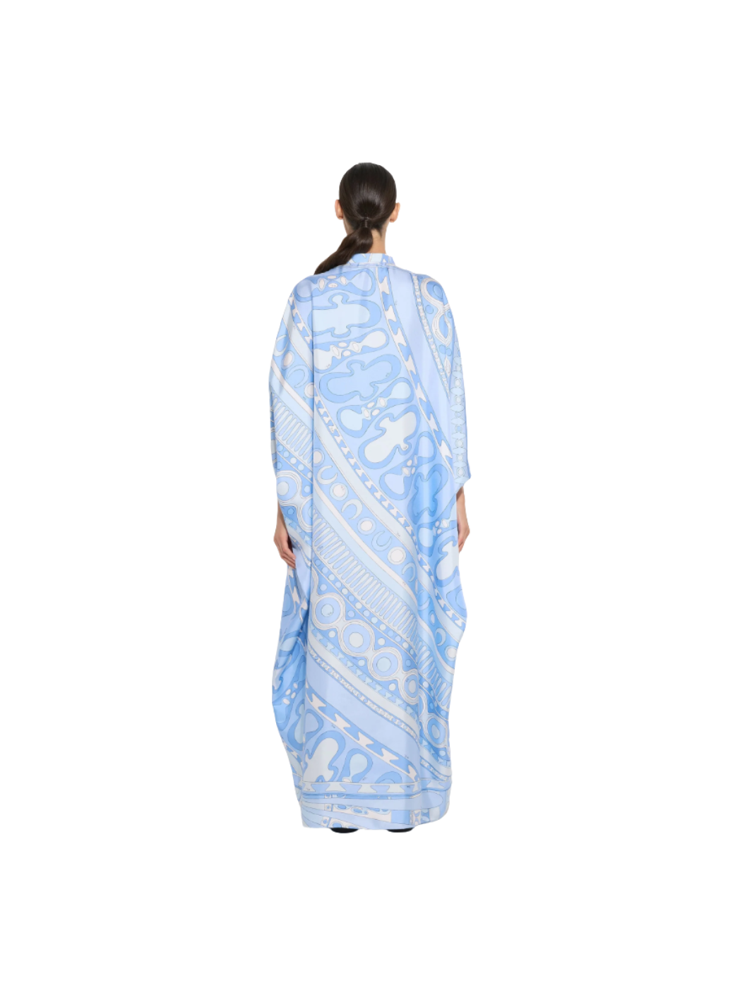 Dieser fließende, umhüllende Kaftan, der das Soleil-Muster mit Leichtigkeit und Helligkeit interpretiert, ist unwiderstehlich. Er ist aus Seidentwill gefertigt, hat eine lockere Passform und lange Ärmel, die sich natürlich mit dem Körper bewegen. Die Bindebänder am Hals sorgen für ein zartes, verstellbares Detail, während das hellblaue Soleil-Muster mit sanfter, luftiger Leuchtkraft über das Kleidungsstück verläuft. Eine raffinierte Balance zwischen Komfort, Bewegungsfreiheit und ikonischen Grafiken.