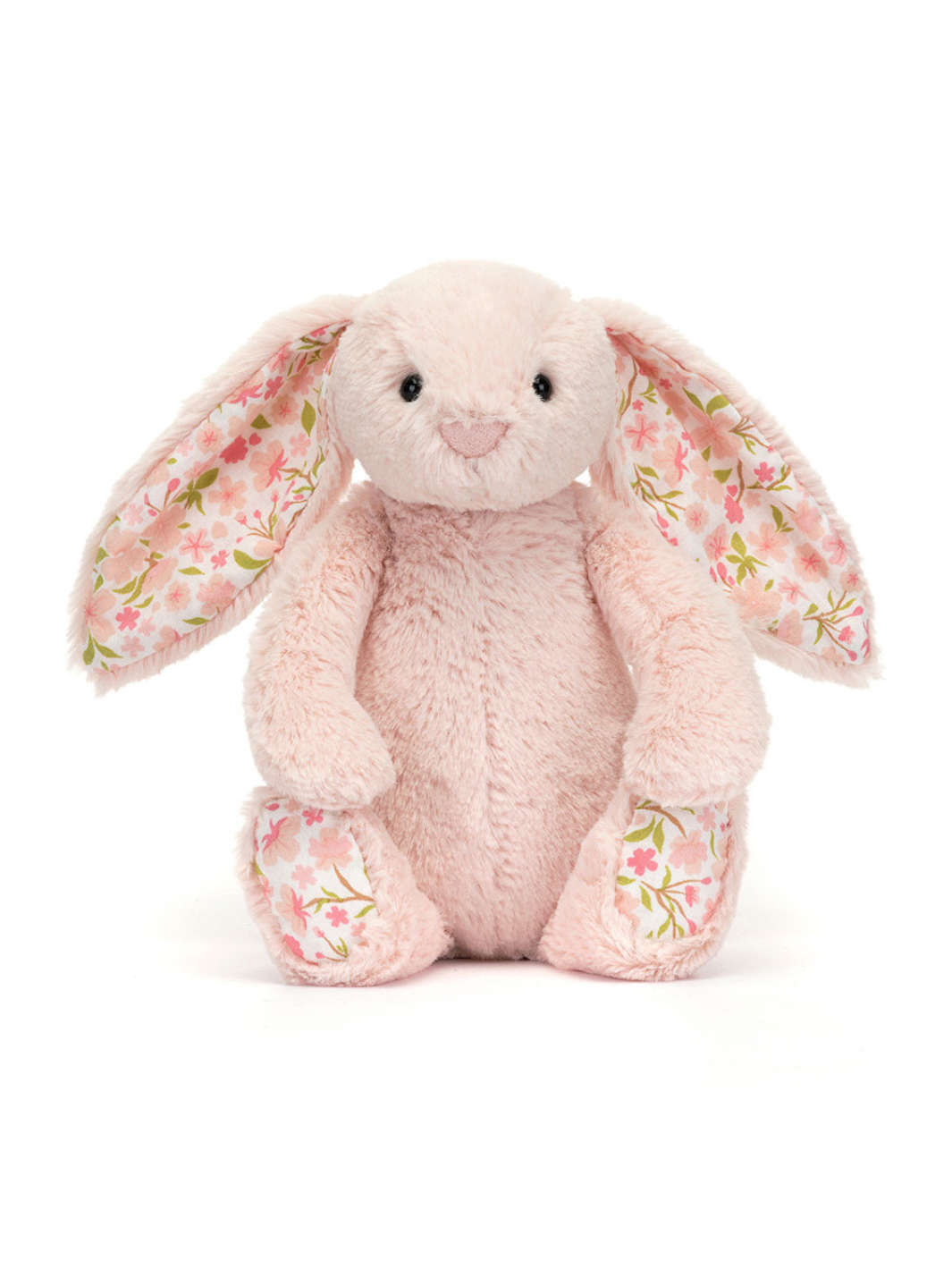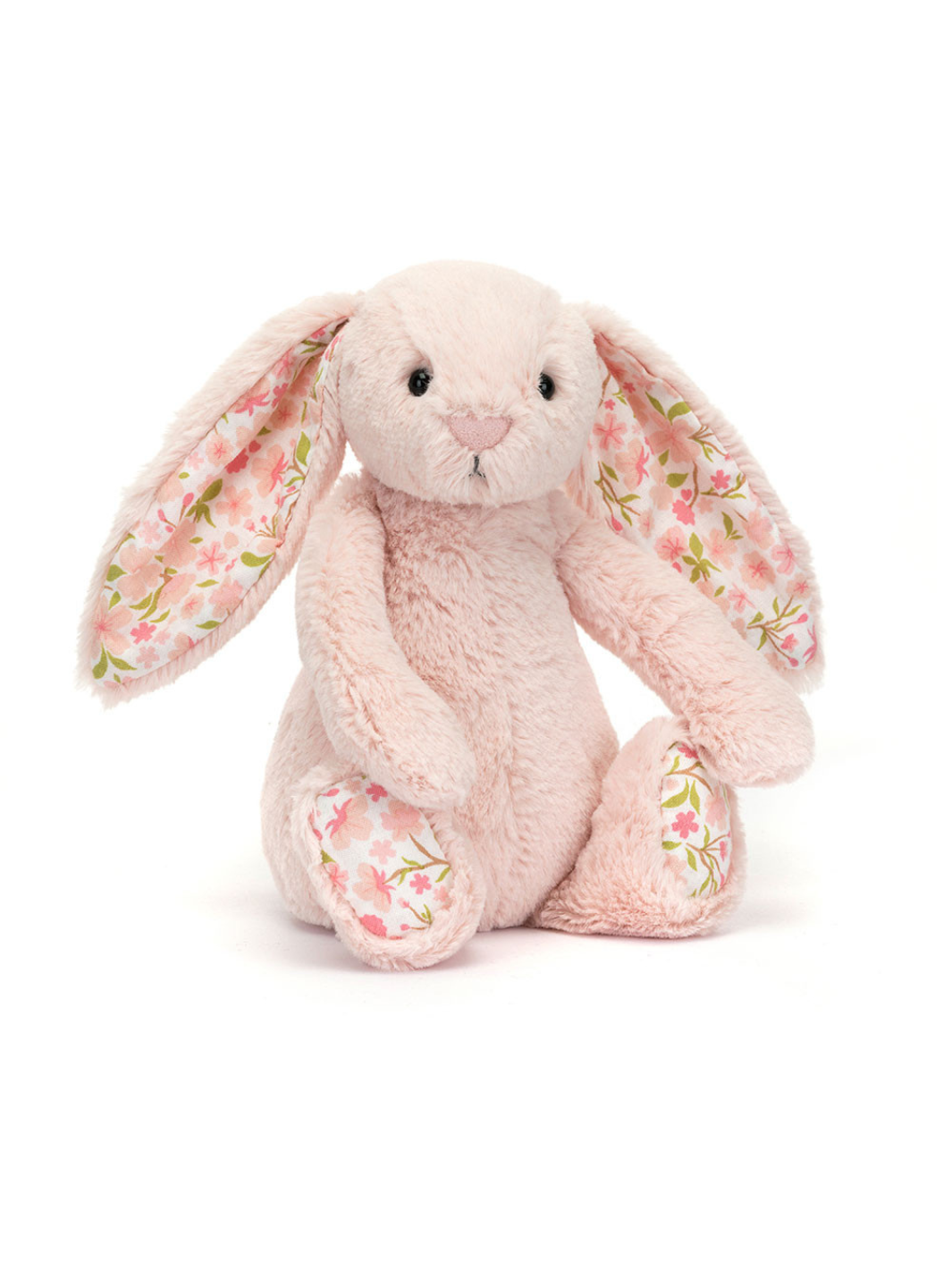 Der berühmte Hase ist ein absoluter Jellycat-Klassiker und präsentiert sich als Blossom Blush Bunny Little mit einem rosafarbenen Fell und zarten Kirschblüten Details an den Öhrchen und Pfoten.