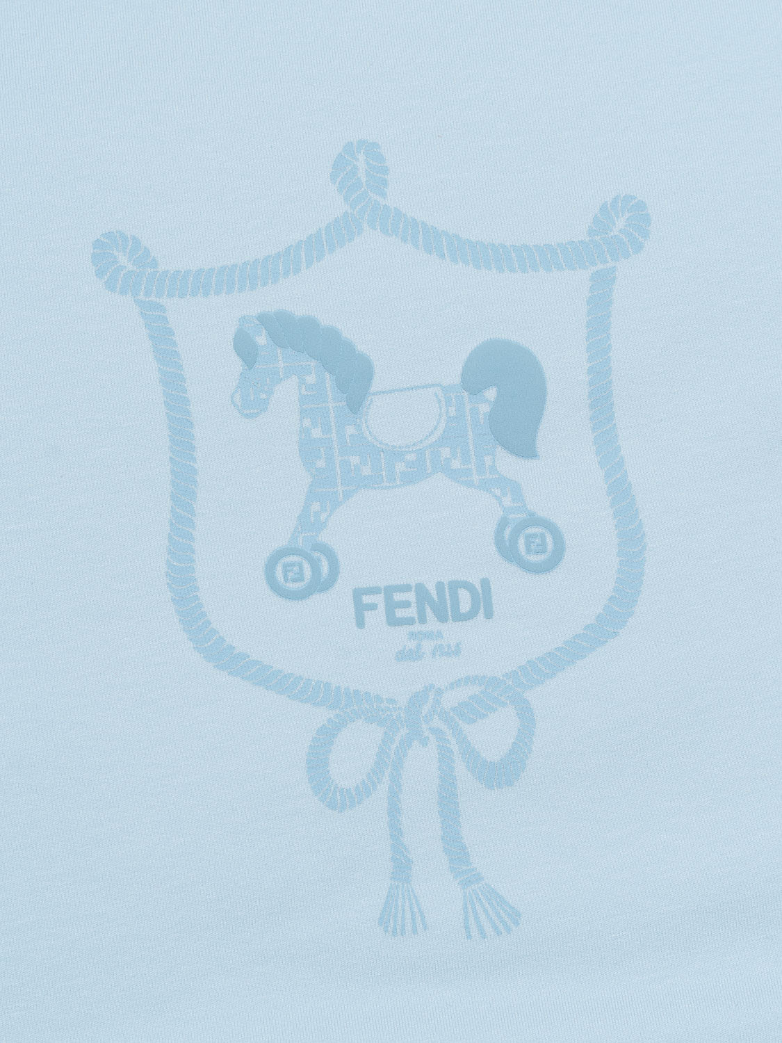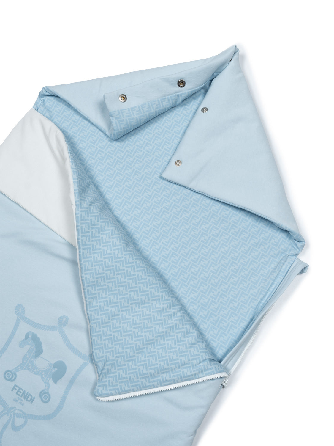 Dieser edle Babyschlafsack von Fendi besteht aus blauem Baumwoll-Jersey mit Saum in Weiß, farblich abgestimmtem Pferdchen-Print vorne und seitlicher Öffnung mit Reißverschluss.