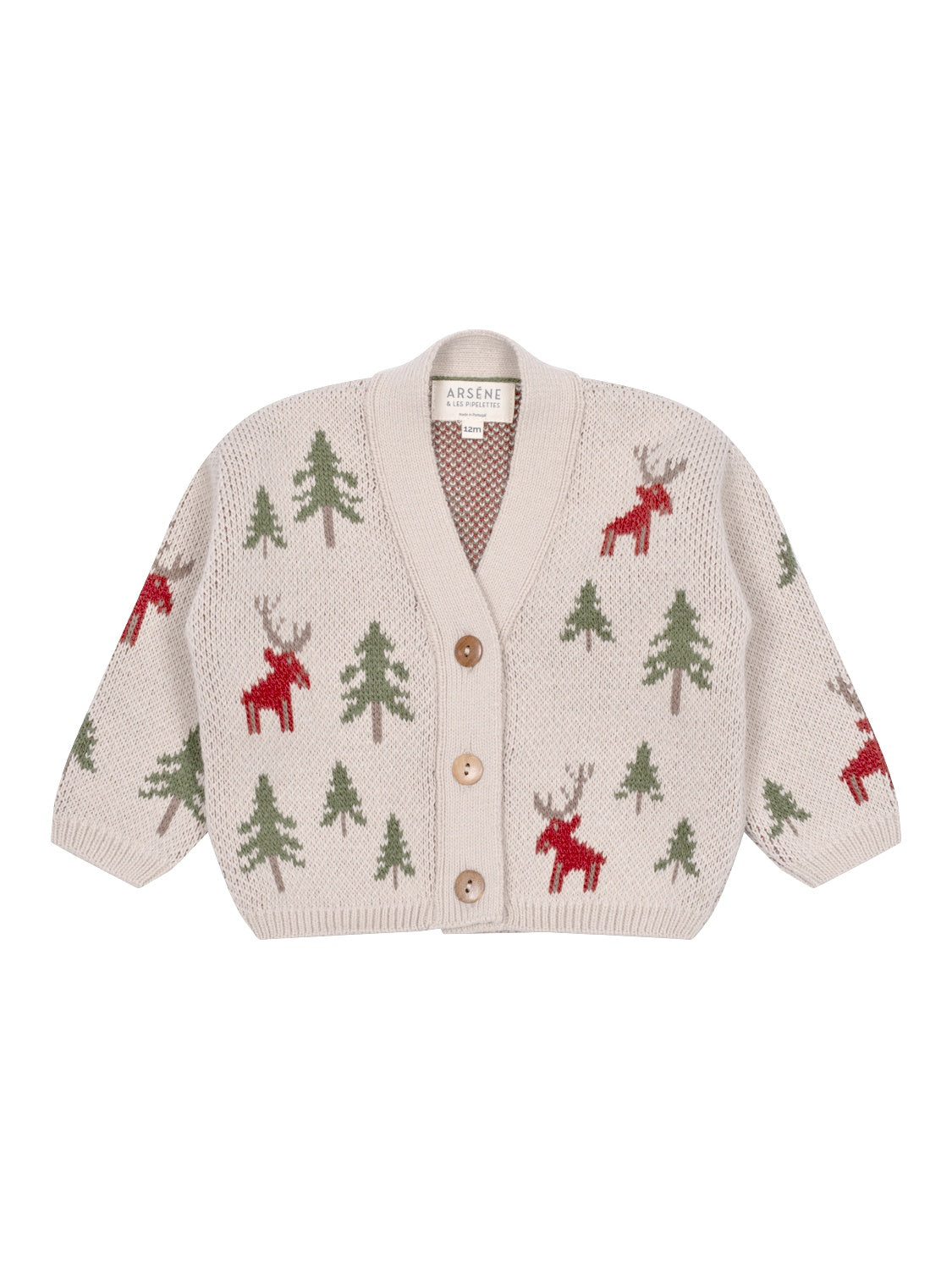 Diese bezaubernde Strickjacke in Beige von Arsène & les Pipelettes besteht aus einer weichen Acryl-Wolle-Mischung und besticht mit einem weihnachtlichen Jacquard. Die raffinierten Motive zeigen süße Rentiere und Tannenbäume - einfach unwiderstehlich zur Winterzeit. Das Modell bietet die perfekte Kombination aus Stil und Komfort für jeden Anlass. Neben einem V-Ausschnitt verfügt der Cardigan über lange Ärmel, einen Verschluss mit Holz-Knöpfen auf der Vorderseite, eine normale Passform sowie Rippstrick-Abschlüsse an Bündchen und Saum.