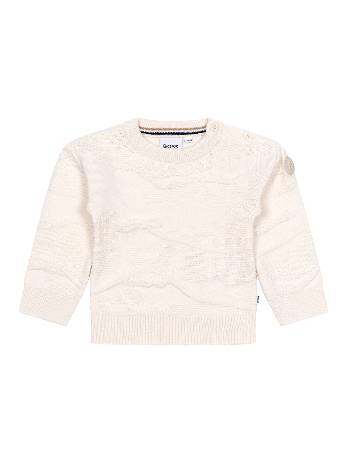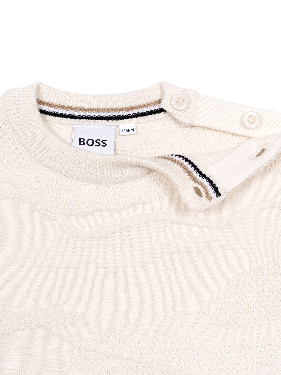 Dieser edle Strickpullover in Creme von Boss besteht aus weichstem Baumwollstrick, für angenehme Tragemomente. Das durchgehende, strukturierte Muster verleiht dem Design einen Hauch von Raffinesse, während das charakteristische doppelte B-Silikonabzeichen am Ärmel sowie das gewebte Logoetikett an der Seite labeltypische Akzente setzen. Neben einem gerippten Rundhalsausschnitt mit praktischem Knopfverschluss an der Schulter verfügt das Modell über lange Ärmel, eine normale Passform sowie Rippstrick-Abschlüsse an Bündchen und Saum.