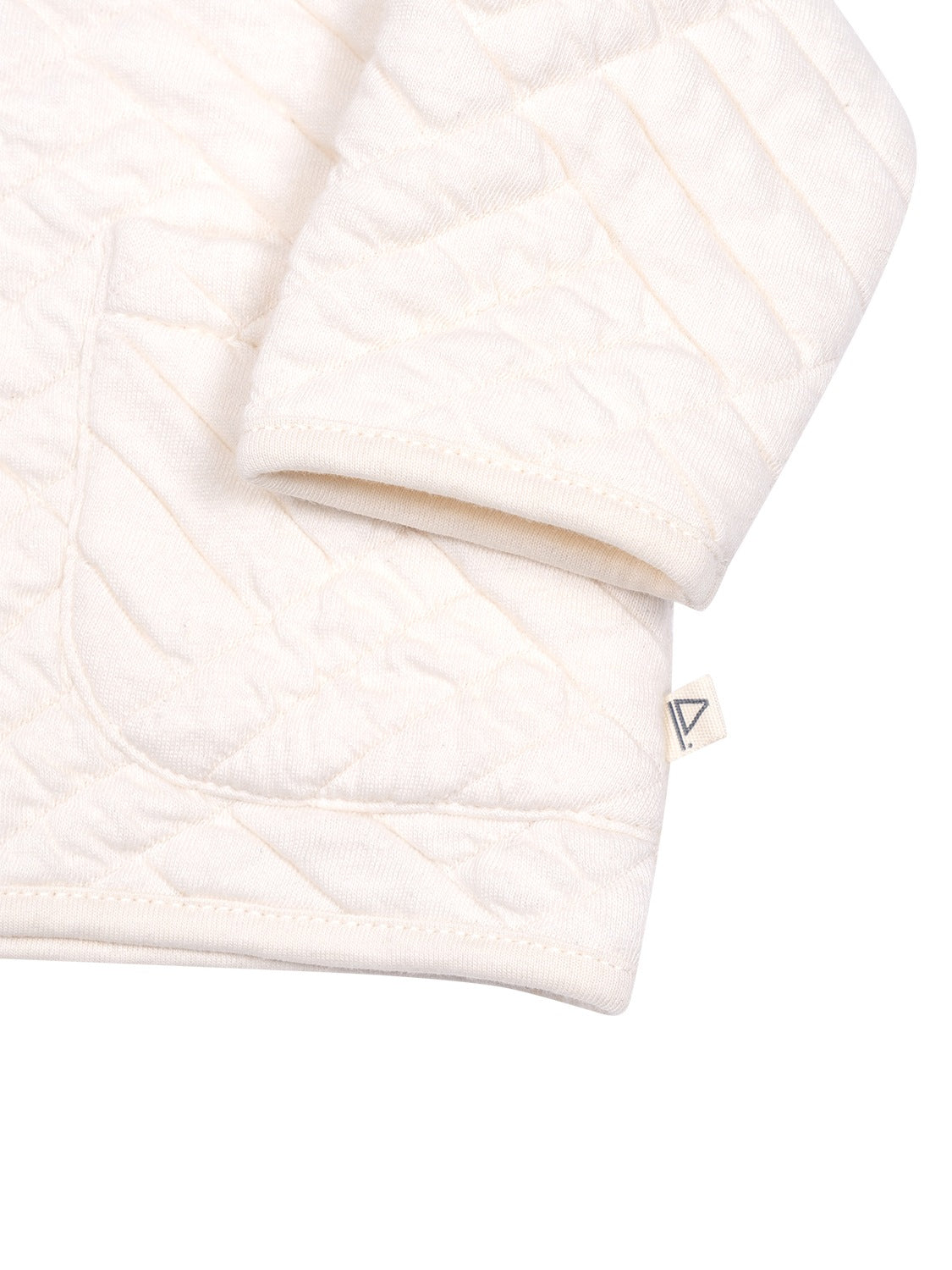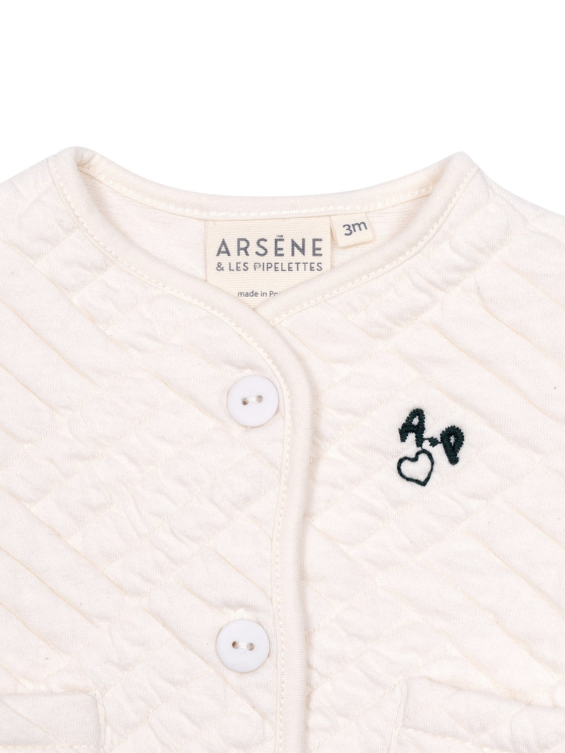 Diese gepolsterte Steppjacke in Creme von Arsène & les Pipelettes besteht aus weichem Ouilt-Interlock-Stoff und erhält von einer kontrastierenden AP- und Herzchen-Stickerei auf der Brust ein labeltypisches Finish. Hergestellt aus einer extra weichen Materialmischung mit Bio-Baumwolle. Neben einem Knopfverschluss auf der Vorderseite verfügt die Jacke über zwei aufgesetzte Vordertaschen, eine normale Passform sowie ein kleines Flaggen-Etikett an der Seitennaht.