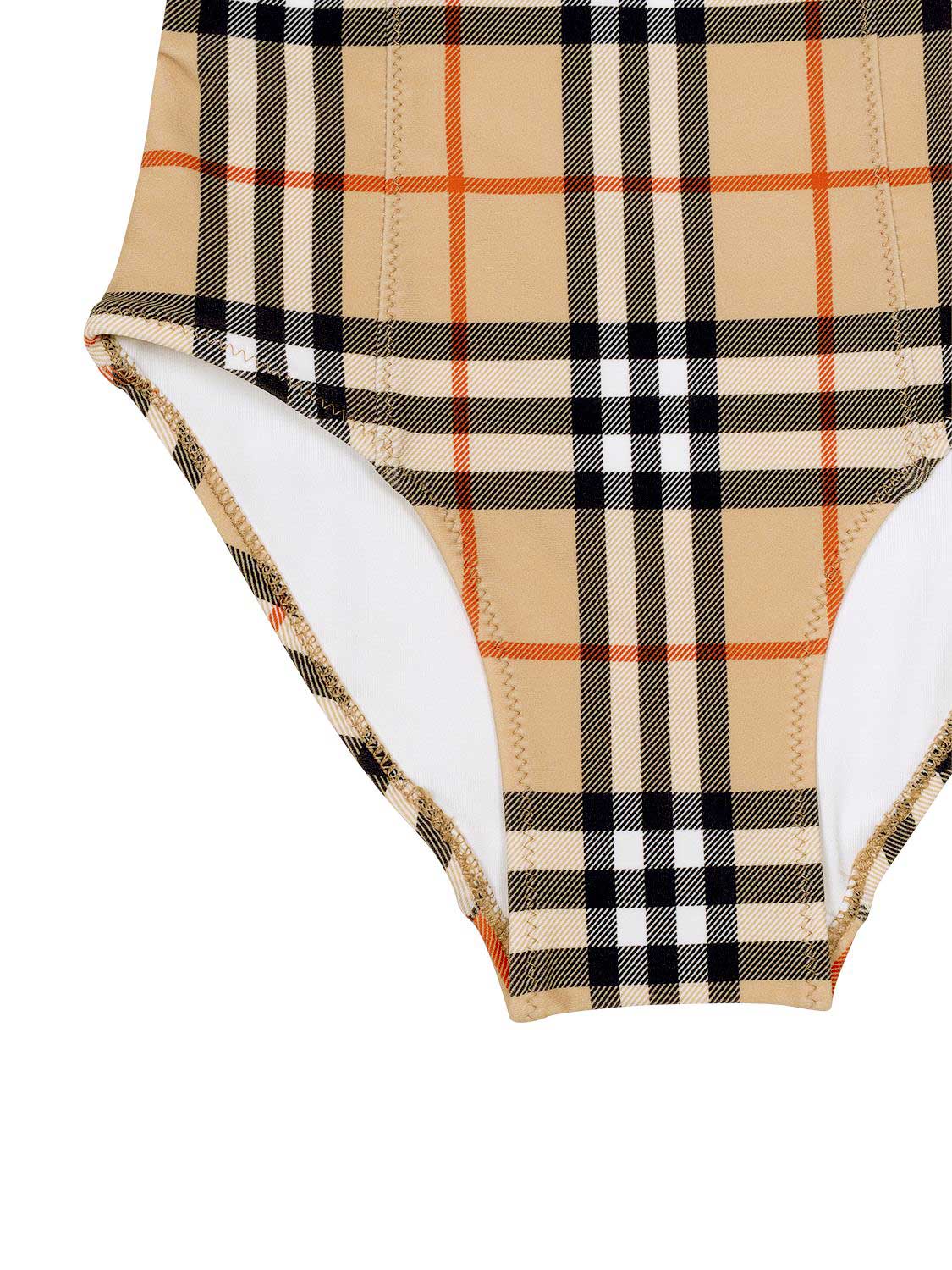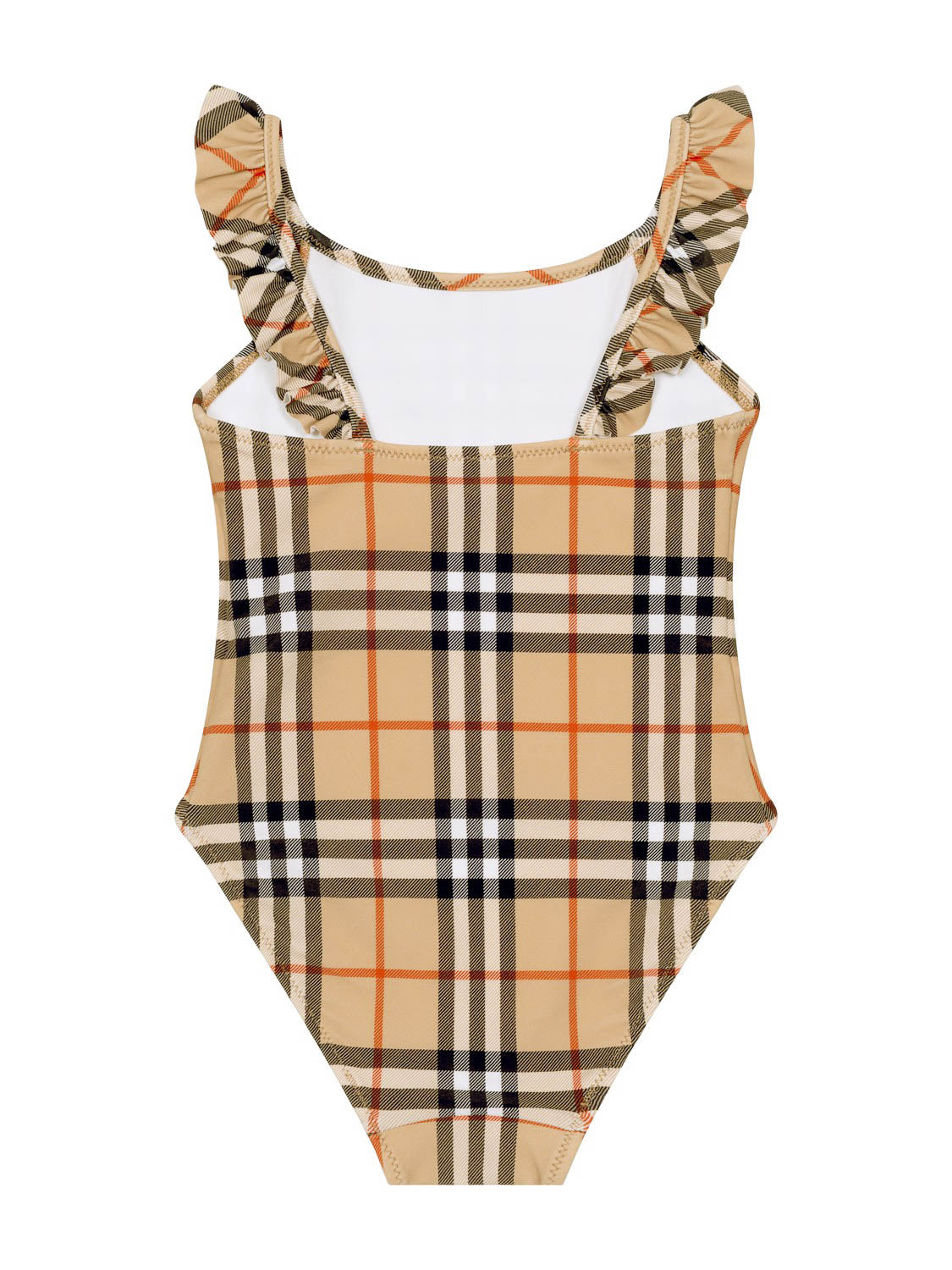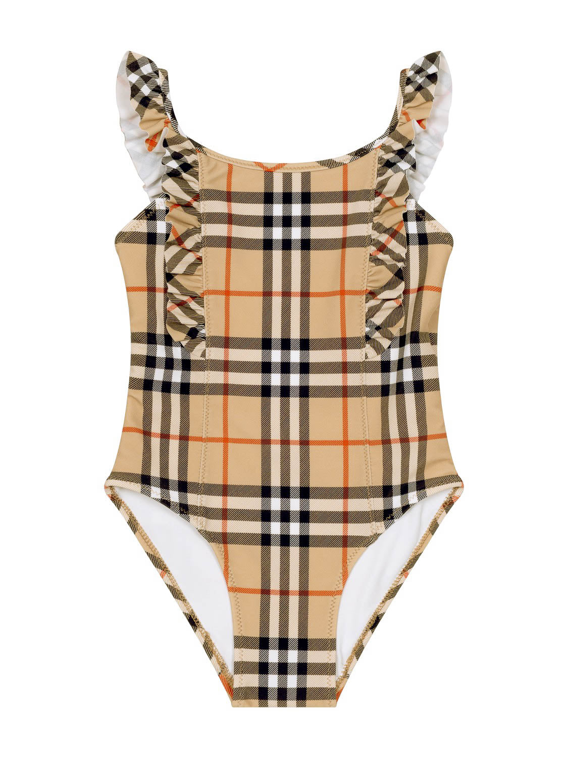 Der edle Tilly Badeanzug von Burberry Kids ist zeitlos elegant und mit einem verspielten Volant an den Trägern versehen – ein raffiniertes Sommer-Must-have für stilbewusste Mädchen, das Luxus und Funktionalität mühelos vereint. Das Design ist mit dem ikonischen Burberry Check-Karomuster in Signature Sand-Beige versehen, welches sich auch dezent in den Rüschen widerspiegelt. Hergestellt aus schnelltrocknendem Nylon, bietet das Modell höchsten Tragekomfort, während die geschmeidige Materialqualität sich jeder Bewegung anpasst.
