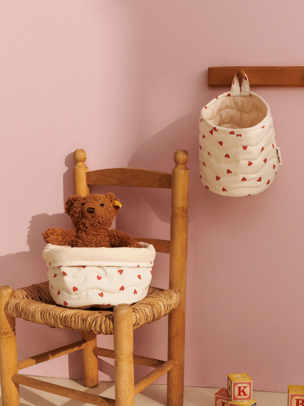 Die Dear April Kiki Aufbewahrungskörbe in der Farbe 'Little Love' kommen im praktischen 2er-Pack. Das gesteppte und wattierte Design ist mit einem süßen Herzchen-Motiv versehen. Als praktische Aufbewahrungsmöglichkeit dürfen die beiden weichen Körbe in keinem Familienhaushalt fehlen. Ein Korb besitzt eine ovale Form, während der Andere rund geformt ist. Beide Körbe sind mit praktischen Schlaufen zum Aufhängen ausgestattet – ideal, um das Kinderzimmer ordentlich und stilvoll zu gestalten.