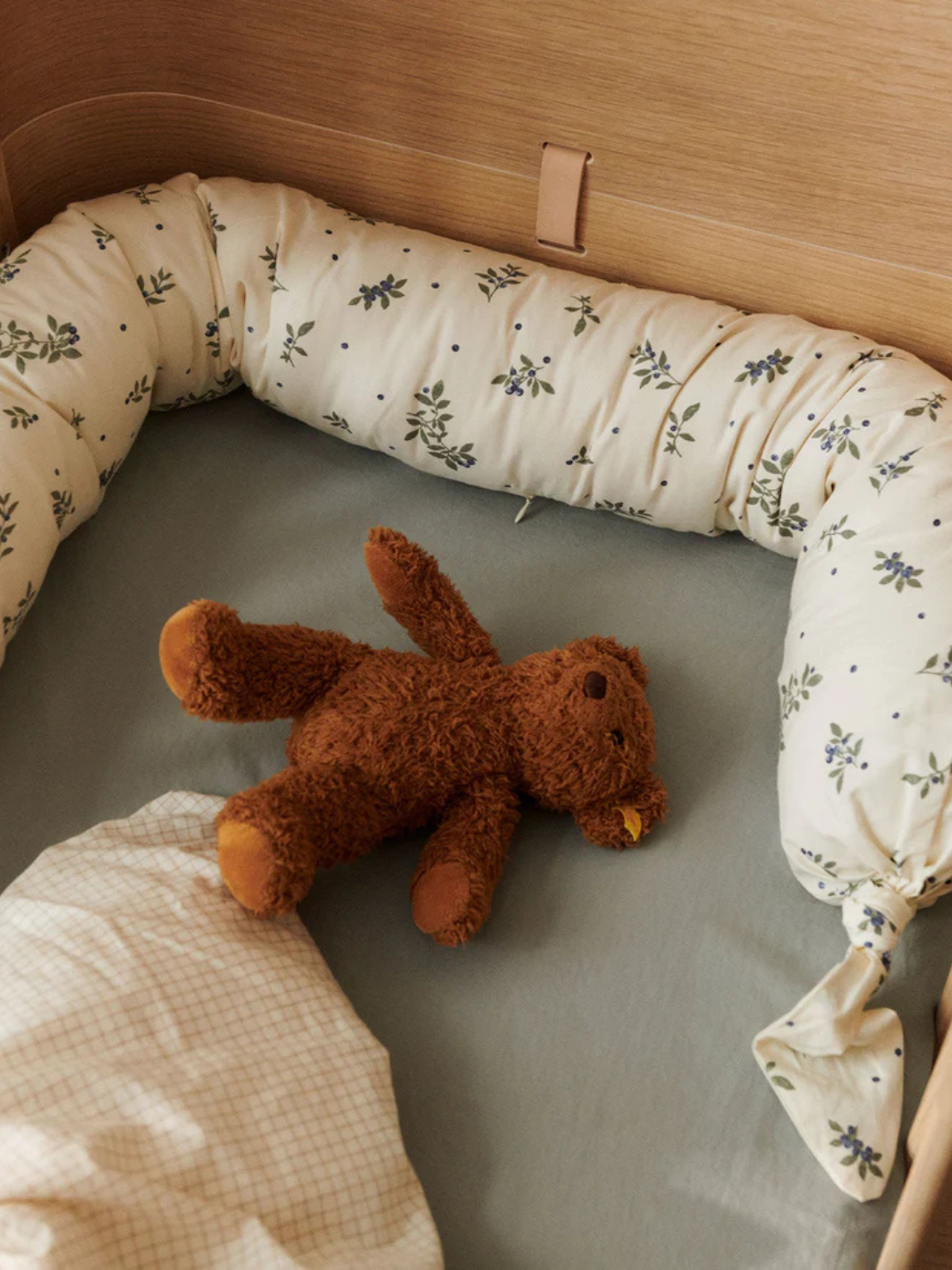 Diese wunderschöne, weiche Bettschlange von Oliver Furniture schafft einen sanften und sicheren Schlafplatz für Ihr Baby. Das Modell Dear April ist mit einem verspielten Blaubeer-Motiv versehen und bietet eine vielseitige Alternative zum Nestchen, z.B. als Rückenstütze beim Lesen oder als Kuschelschlange für ältere Kinder.