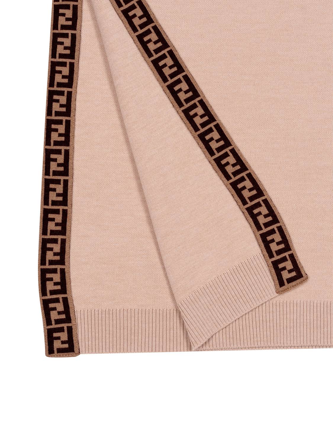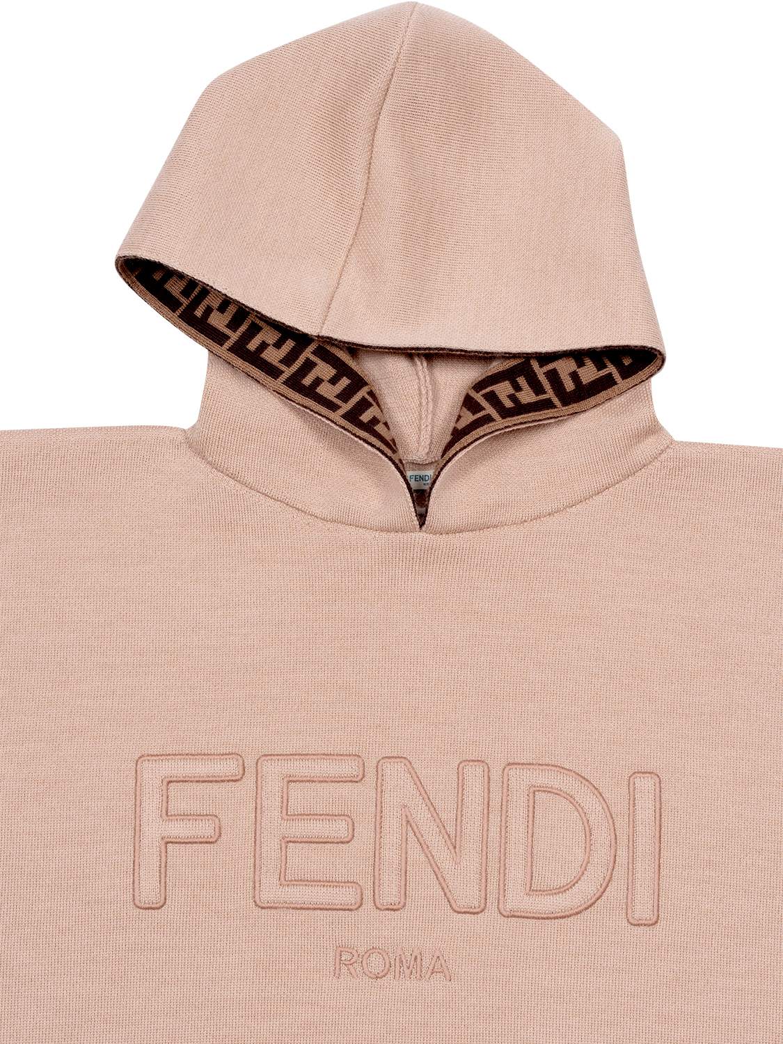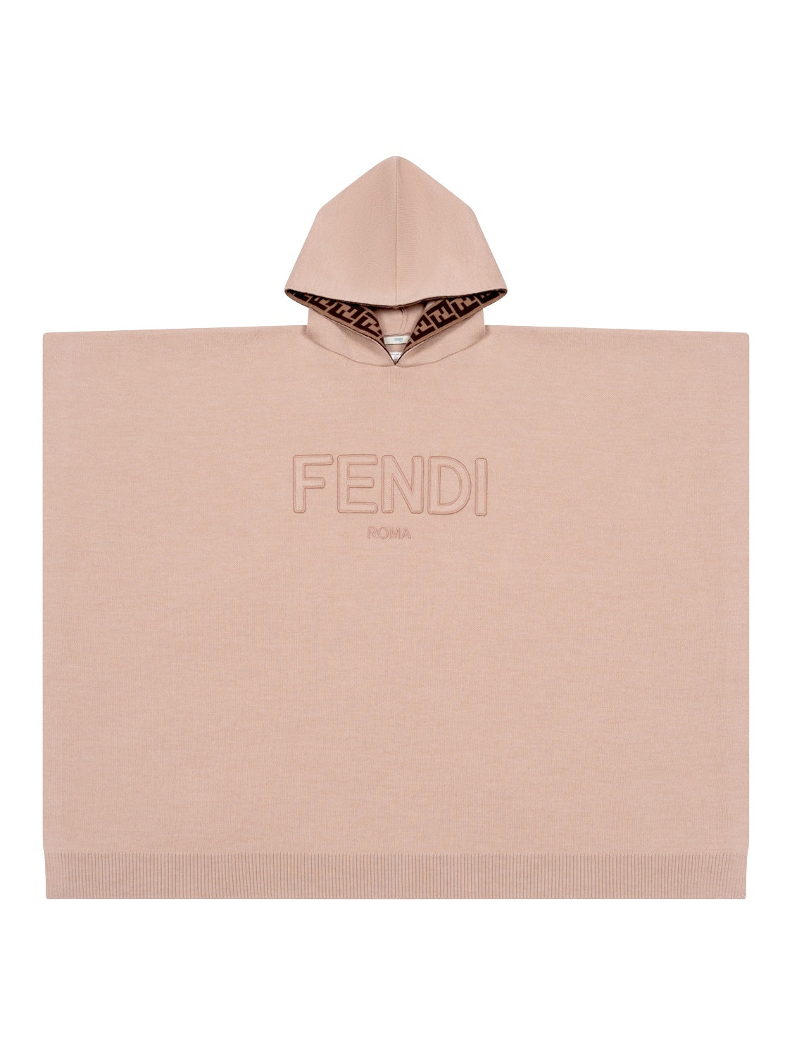 Dieser edle beigefarbene Cape von Fendi Kids ist eine stilvolle und bequeme Ergänzung für die Wintergarderobe. Auf der Brust erscheint das ikonische Fendi-Logo als gleichfarbige Stickerei. Die Kapuze ist mit dem charakteristischen FF-Jacquard in kontrastierendem Braun gefüttert und setzt ein luxuriöses, auffälliges Detail. Ein Besatz mit dem FF-Jacquard findet sich auch an den offenen Innenkanten an den Seiten wieder und verleiht dem Design einen schicken und einzigartigen Look.