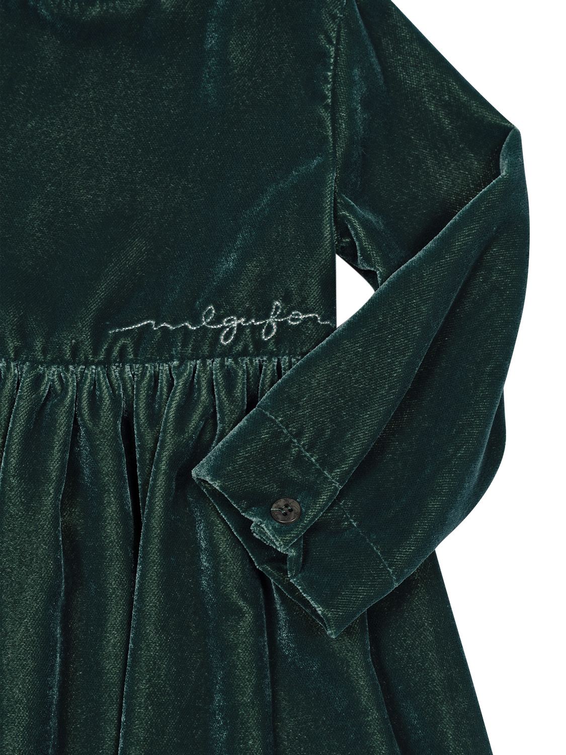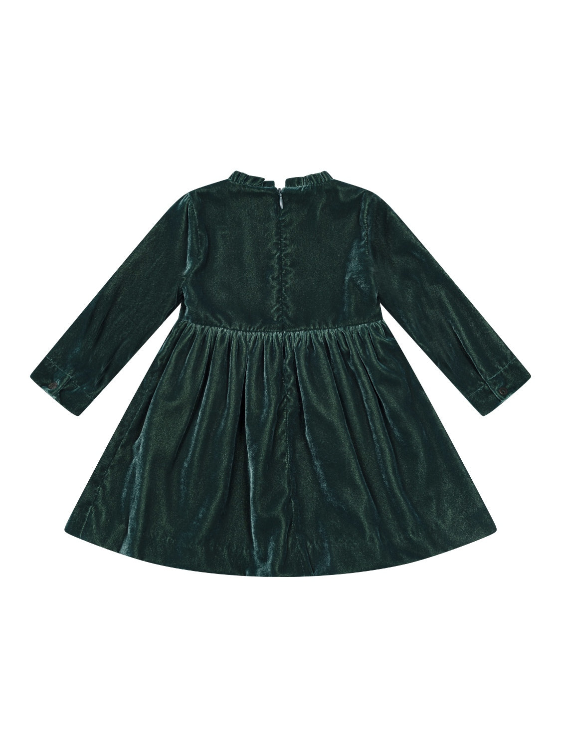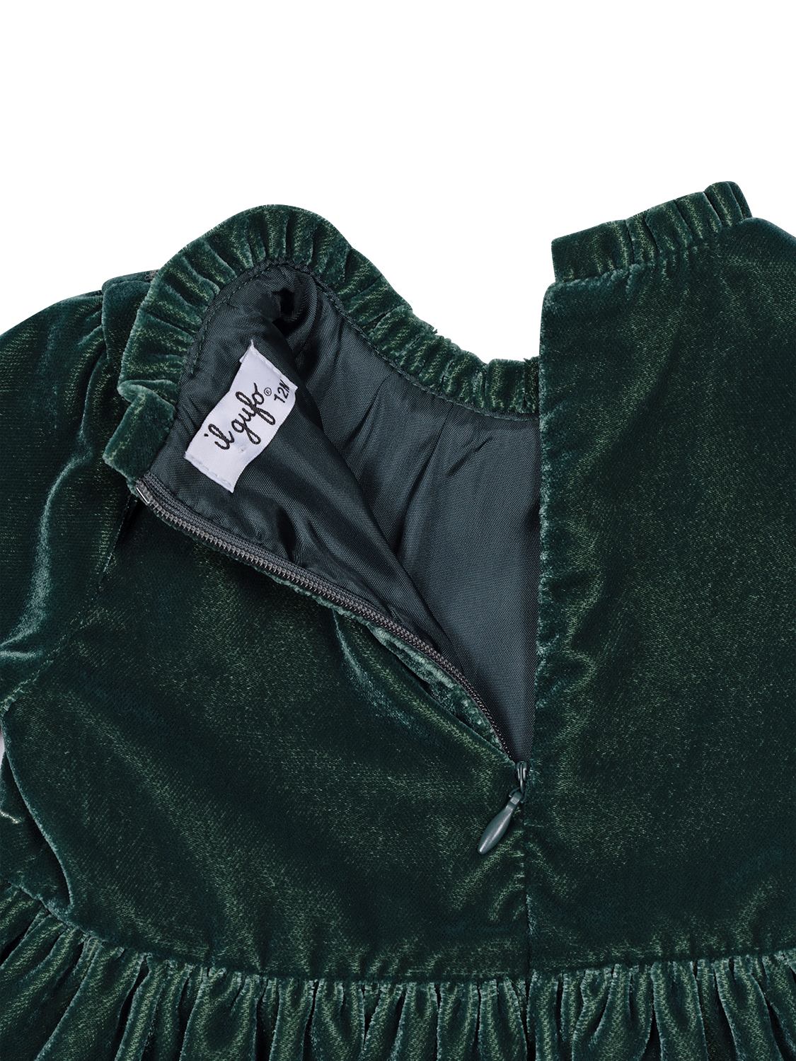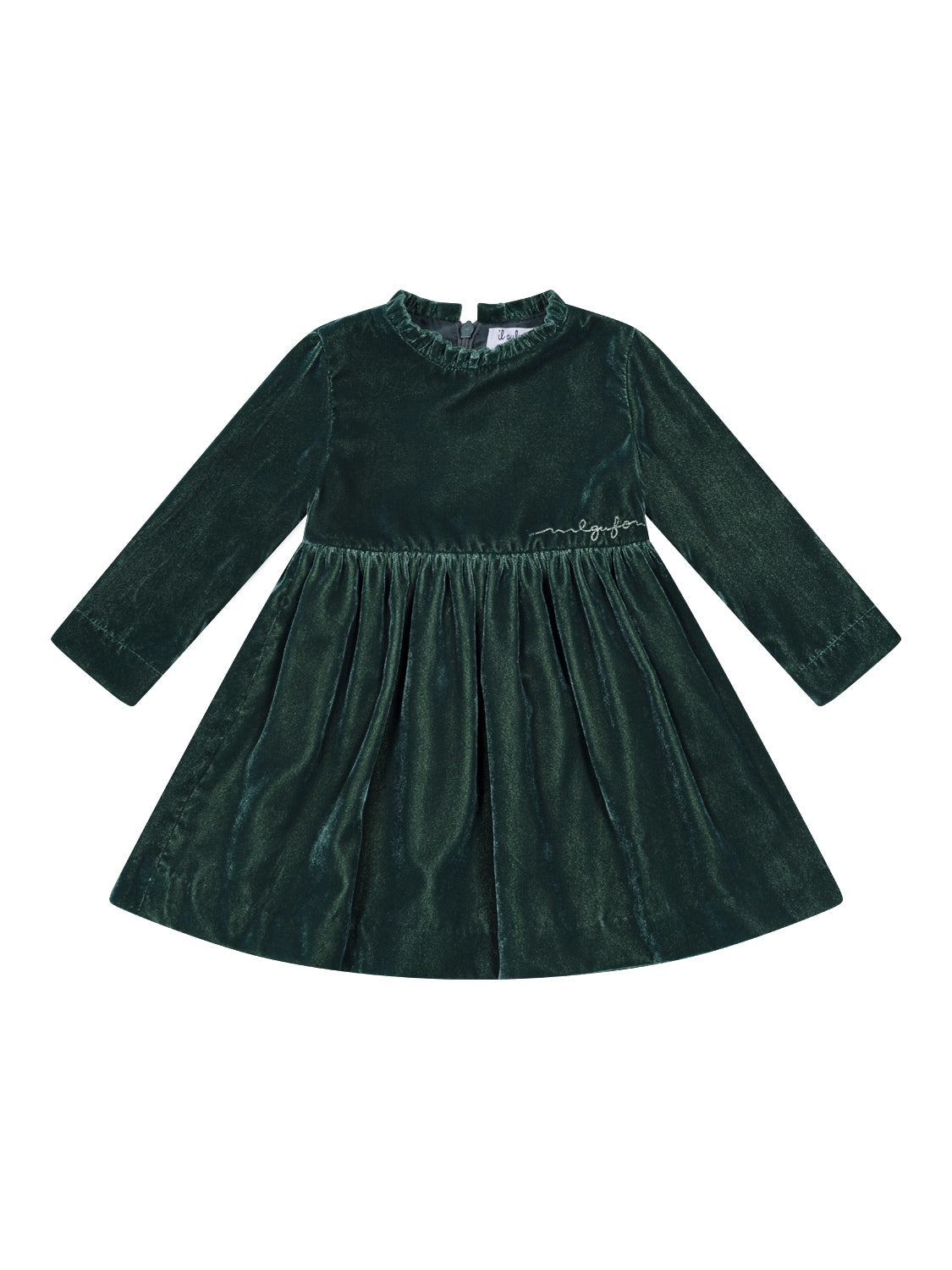 Dieses elegante Samtkleid in Waldgrün von Il Gufo besticht mit einem klassischen Design - einfach perfekt für festliche Anlässe aller Art. Ein kurzer Rüschen-Stehkragen sowie eine geraffte Taille verleihen dem Kleid eine verspielte Note, während die seidig weiche Samtqualität ein traumhaftes Tragegefühl verspricht. Neben langen Ärmeln mit geknöpften Manschetten verfügt das Modell über einen versteckten Reißverschluss im Rückenbereich, um das An- und Ausziehen zu erleichtern. Von der charakteristischen Logo-Stickerei auf der Vorderseite wird das stilvolle Gesamtbild gekonnt vollendet.
