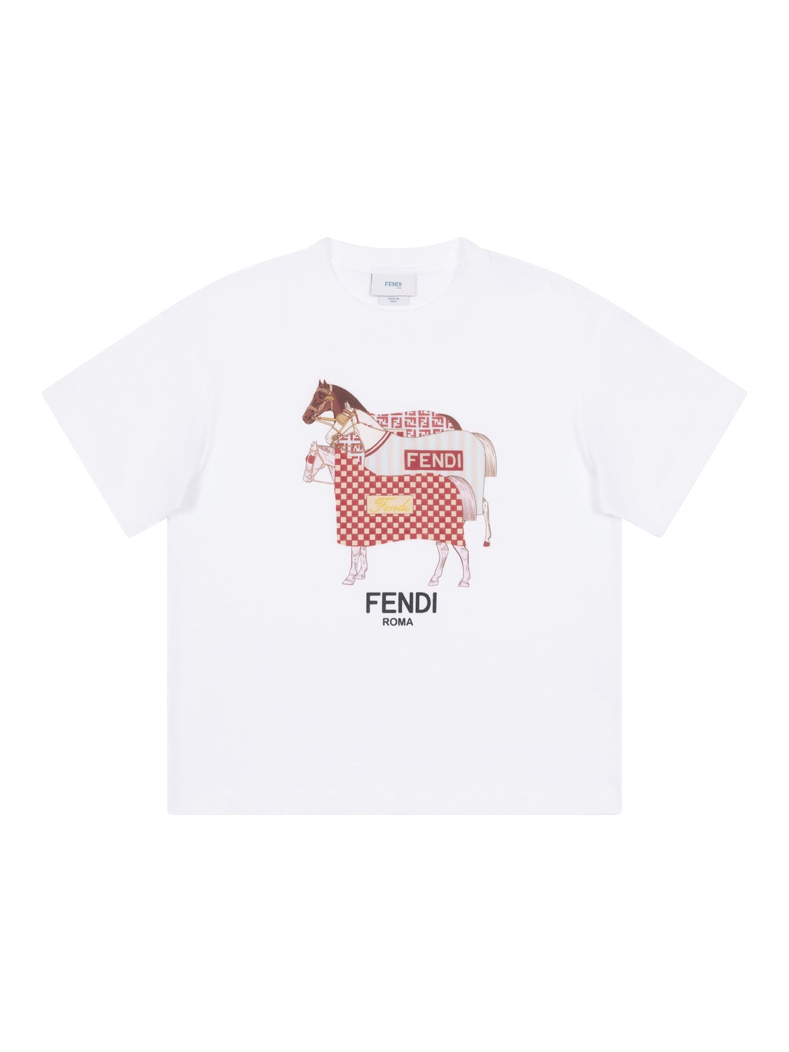 Dieses T-Shirt in Weiß aus der aktuellen Fendi-Kids-Kollektion ist die perfekte Ergänzung für die Mädchengarderobe. Das Modell bietet dank der Fertigung aus reinem, besonders weichen Baumwolljersey höchsten Tragekomfort, während die Vorderseite ein dekorativer, mehrfarbiger Reitsport-Print ziert und dem Design einen Hauch von Raffinesse verleiht. Neben einem gerippten Rundhalsausschnitt verfügt das Shirt über kurze Ärmel sowie eine normale Passform.