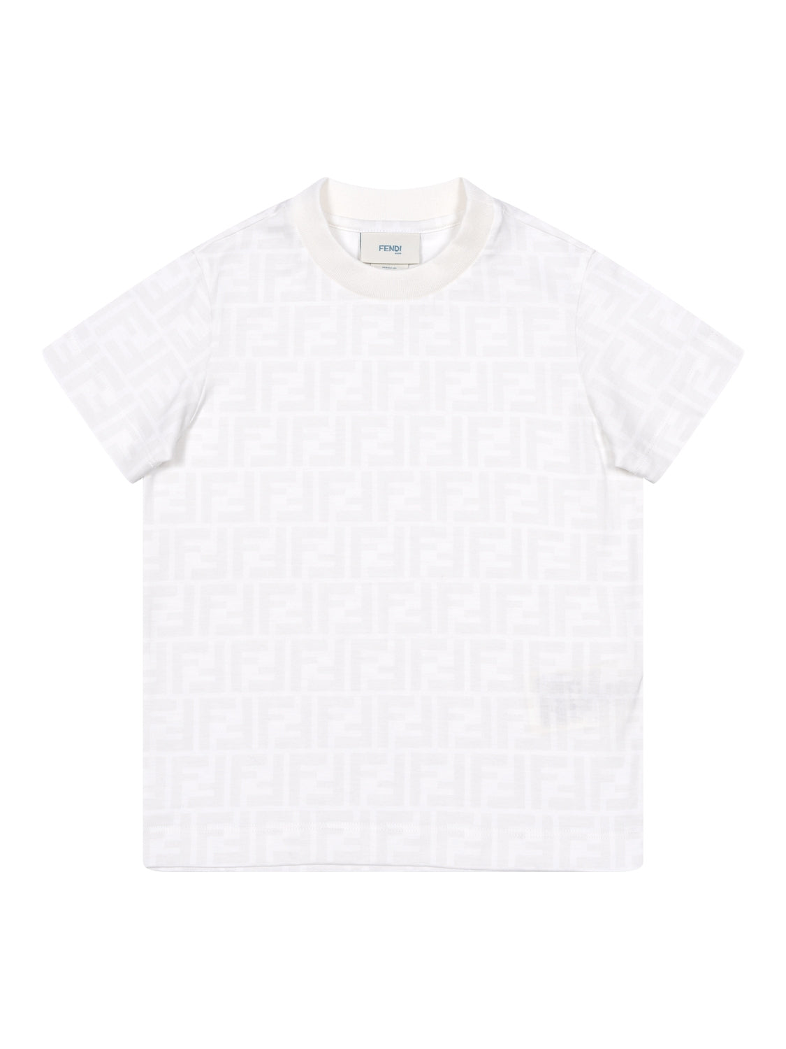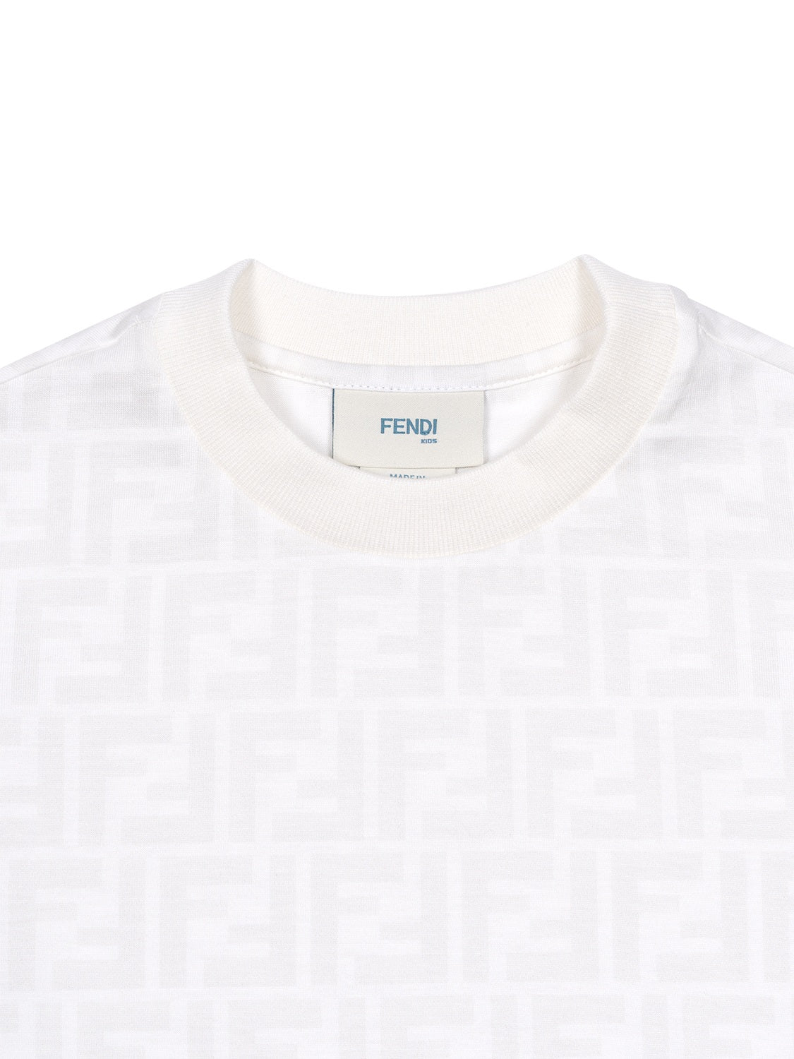 Dieses weiße T-Shirt aus der aktuellen Fendi-Kids-Kollektion ist die perfekte Ergänzung für die Garderobe ihres Kindes. Das Modell bietet dank der Fertigung aus reiner, besonders weicher Baumwolle höchsten Tragekomfort, während das ikonische FF-Logo als dezentes Allover-Motiv ein labeltypisches Finish verleiht. Neben einem gerippten Rundhalsausschnitt verfügt das Shirt über kurze Ärmel sowie eine normale Passform.