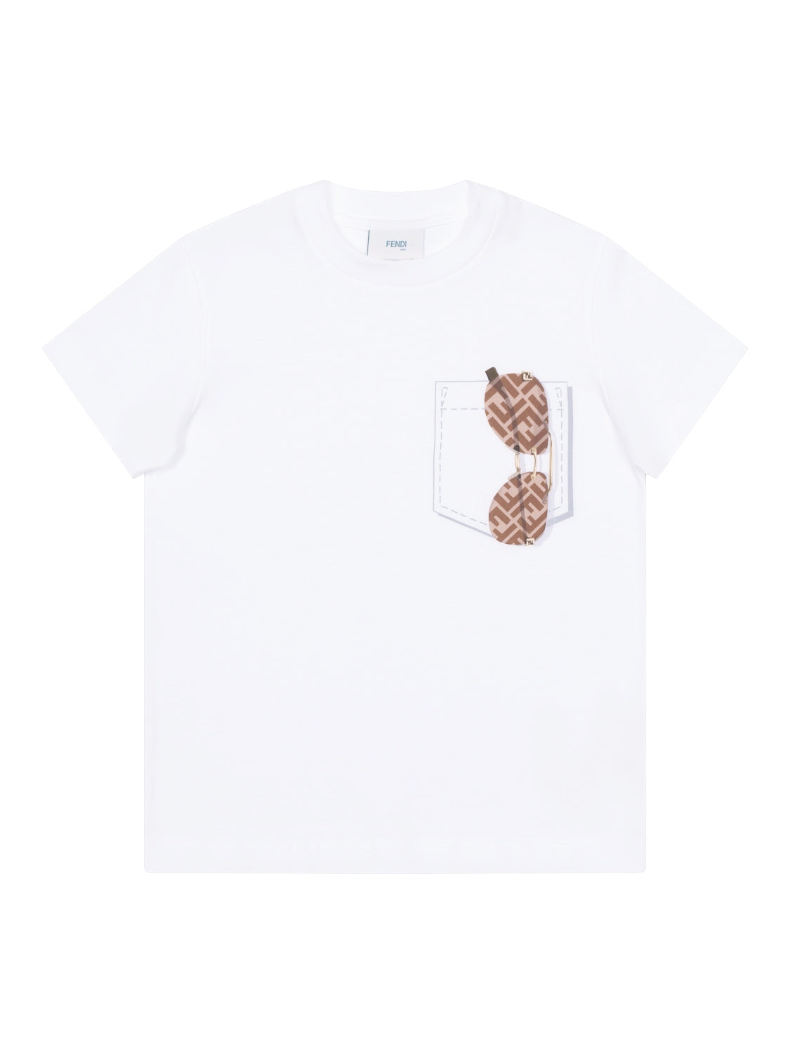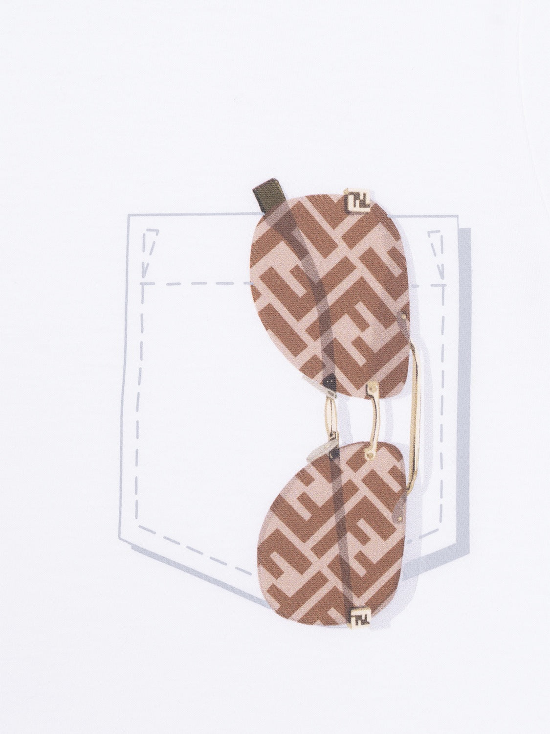 Dieses T-Shirt in Weiß aus der aktuellen Fendi-Kids-Kollektion ist die perfekte Ergänzung für die Mädchengarderobe. Das Modell bietet dank der Fertigung aus reinem, besonders weichen Baumwolljersey höchsten Tragekomfort, während die Vorderseite ein dekorativer Fendi-Sonnenbrillen-Print in Trompe-l’œil-Optik mit FF-Logo in Tabakbraun ziert und dem Design einen Hauch von Raffinesse verleiht. Neben einem gerippten Rundhalsausschnitt verfügt das Shirt über kurze Ärmel sowie eine normale Passform.