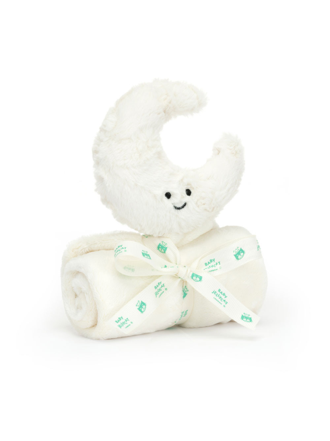 Der wunderbar flauschige Halbmond mit cremefarbenem Fell hält ein unwiderstehlich weiches Schmusetuch fest. Sorgfältig zusammengerollt und mit einem Baby Jellycat Ripsband verziert, ist es das perfekte Geschenk zur Geburt – für leuchtende Augen, Kuscheleinheiten und süße Träume.