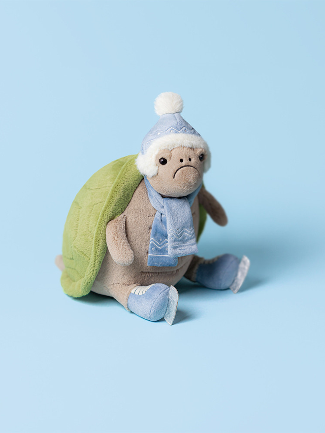 Die Timmy Turtle Skating von Jellcat ist ein klein wenig griesgrämig, aber gerade deshalb so unglaublich liebenswert. Der kleine Spaßmuffel macht mit seinen Schlittschuhen auf dem Eis trotz allem eine gute Figur und trägt eine süße gestrickte Pudelmütze sowie einen passenden Schal. Timmy Schildkröte ist bereit für Kuschelabenteuer im Schnee oder in deinen Armen.