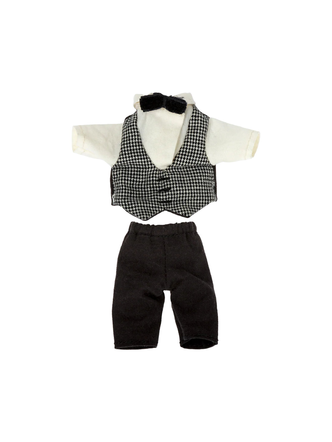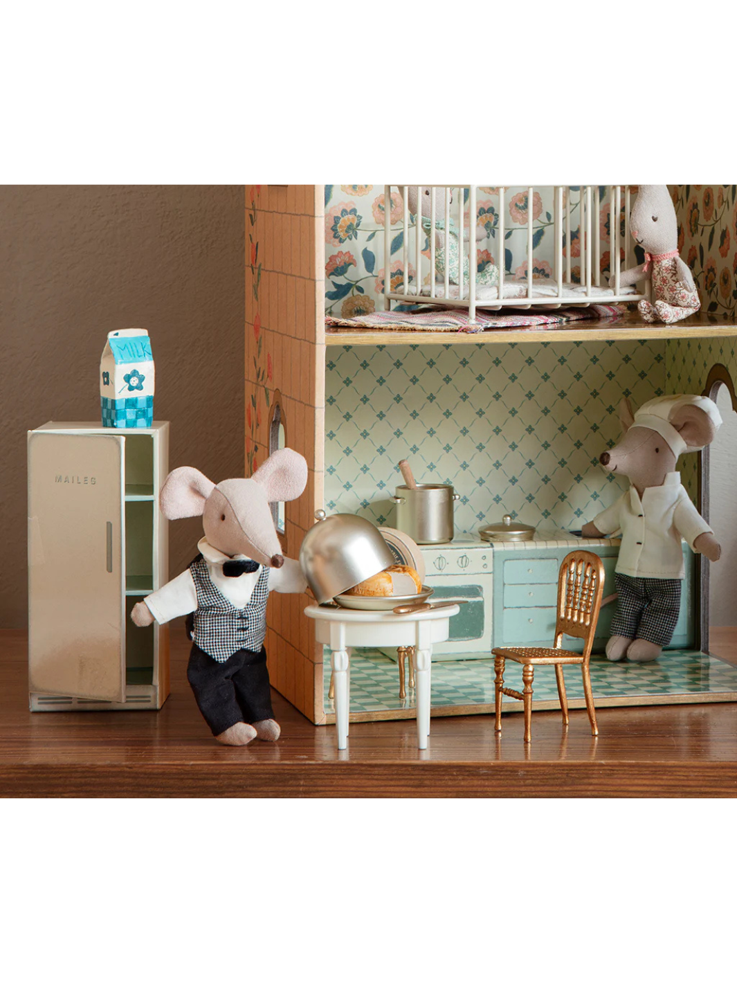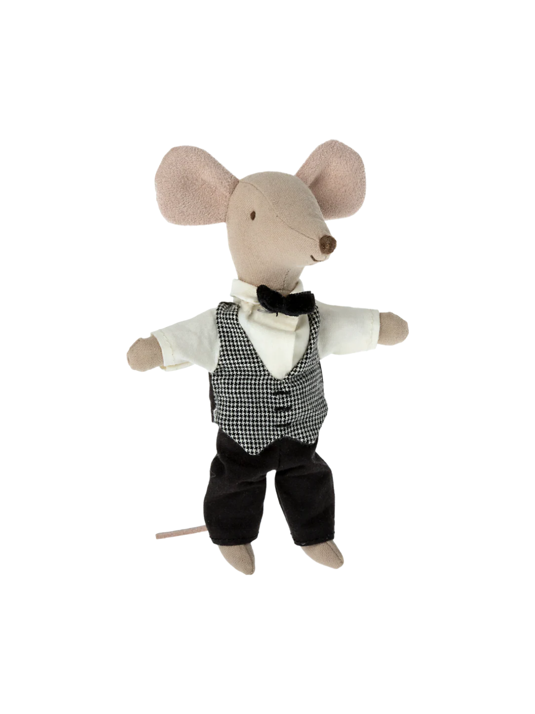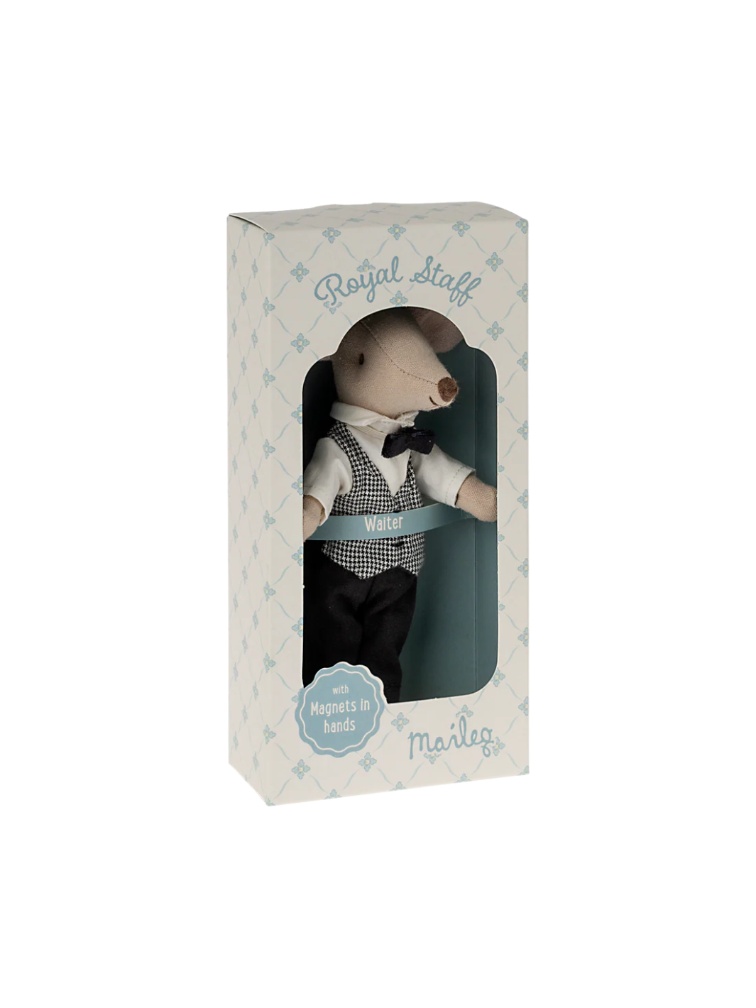 Die Kellnermaus von Maileg ist der perfekte Helfer auf jeder Party oder bei jeder königlichen Familie. Die Maus trägt ein klassisches Kellneroutfit aus Hemd mit Fliege, Weste und Hose. Dank kleiner Magnete in den Pfötchen kann die Kellnermaus alle Metallutensilien selbstständig festhalten.