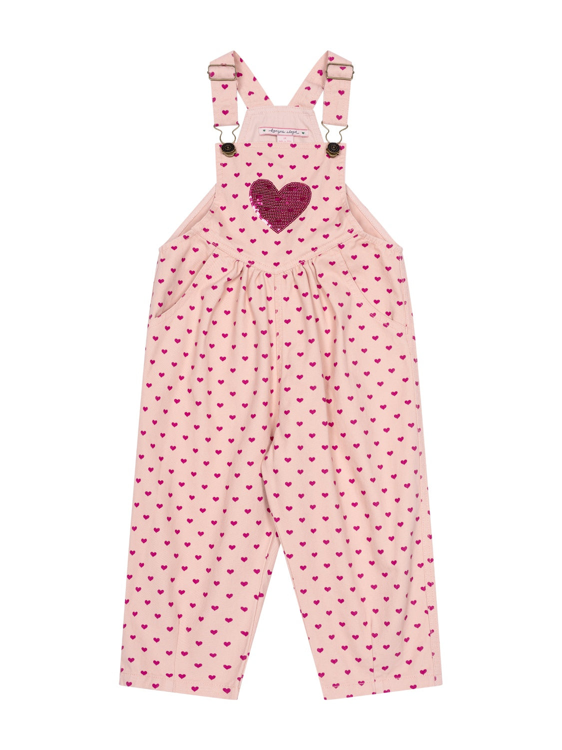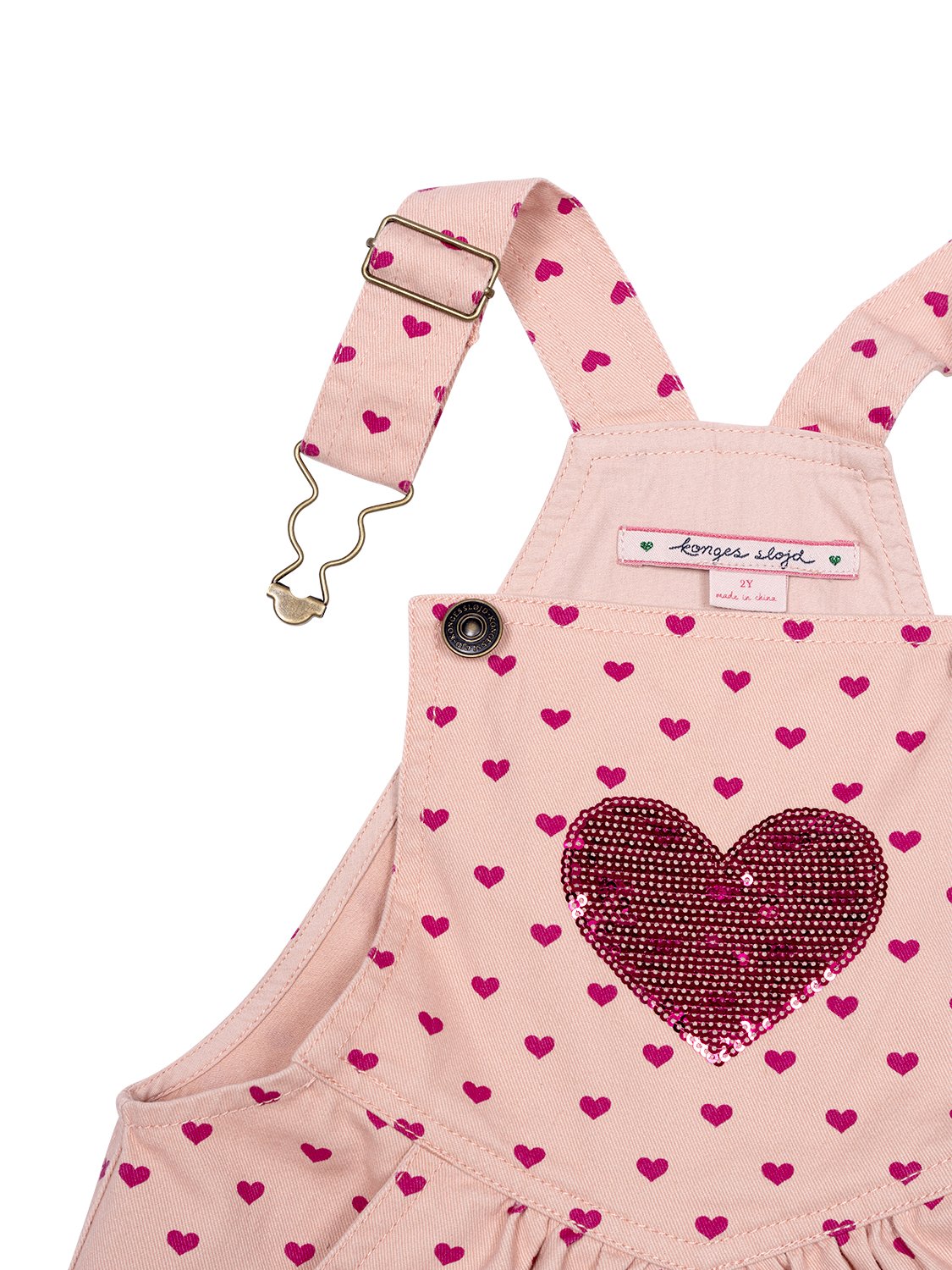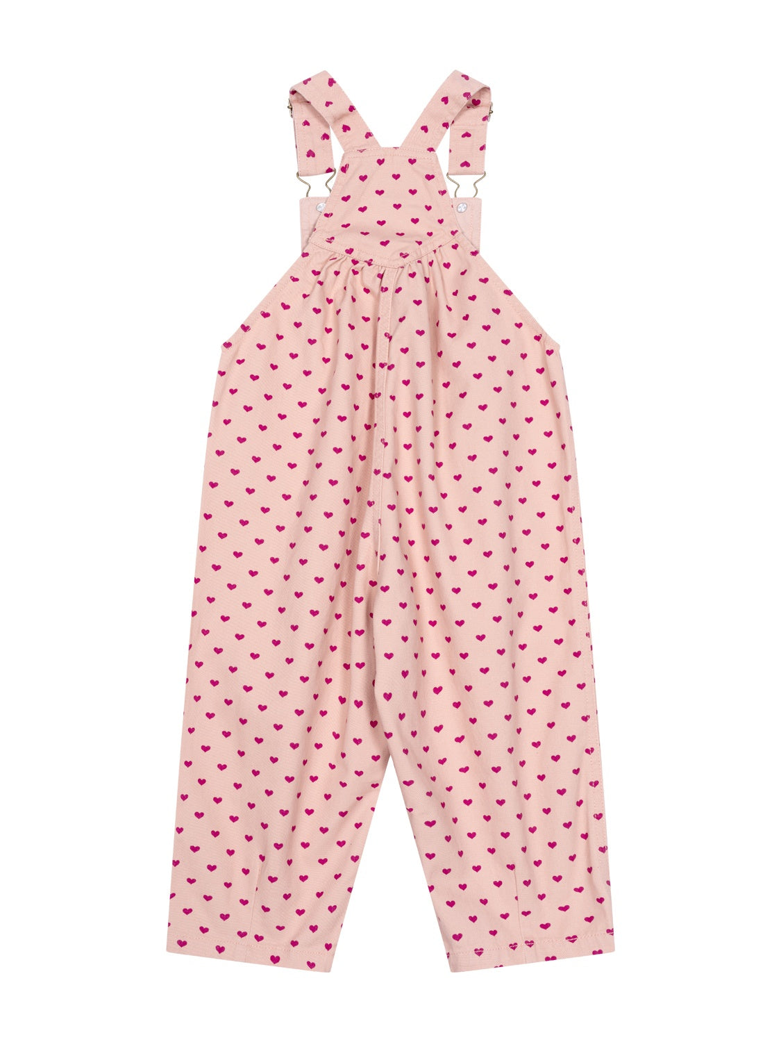 Die süße Nola Latzhose in Rosa von Konges Sløjd ist mit ihrem Allover-Herzchen-Motiv ein echtes Lieblingsstück für kleine Mädchen.