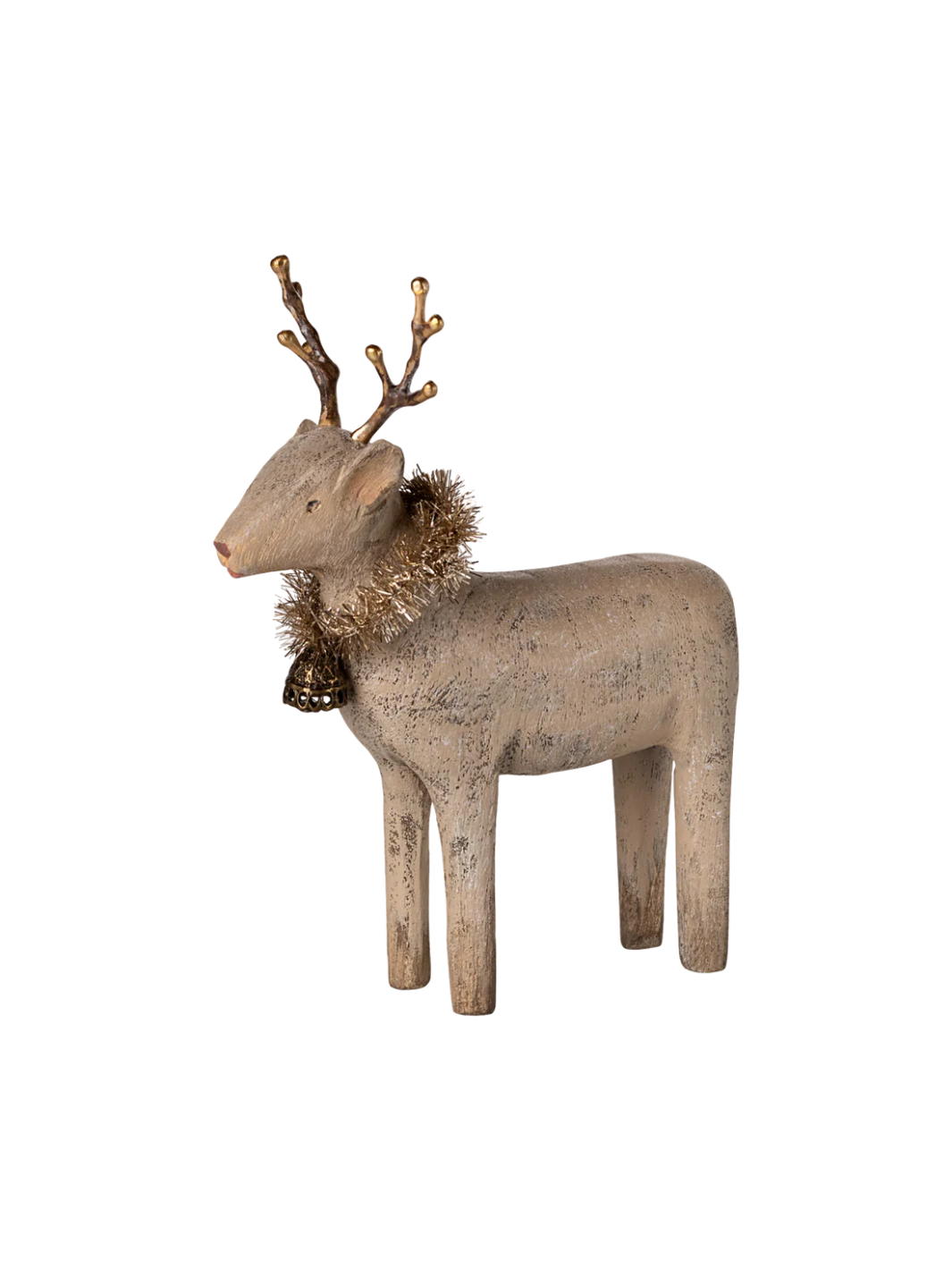 Dieses Rentier von Maileg ist ein wunderschöner Dekorationsartikel aus Holz, um die Weihnachtsatmosphäre zu schaffen. Das Rentier besitzt ein goldfarbenes Geweih aus Metall und wird von einem prächtigen Kranz um den Hals geschmückt. Es ist handbemalt und kann sich in den Farbtönen unterscheiden - genau wie ein echtes Rentier.