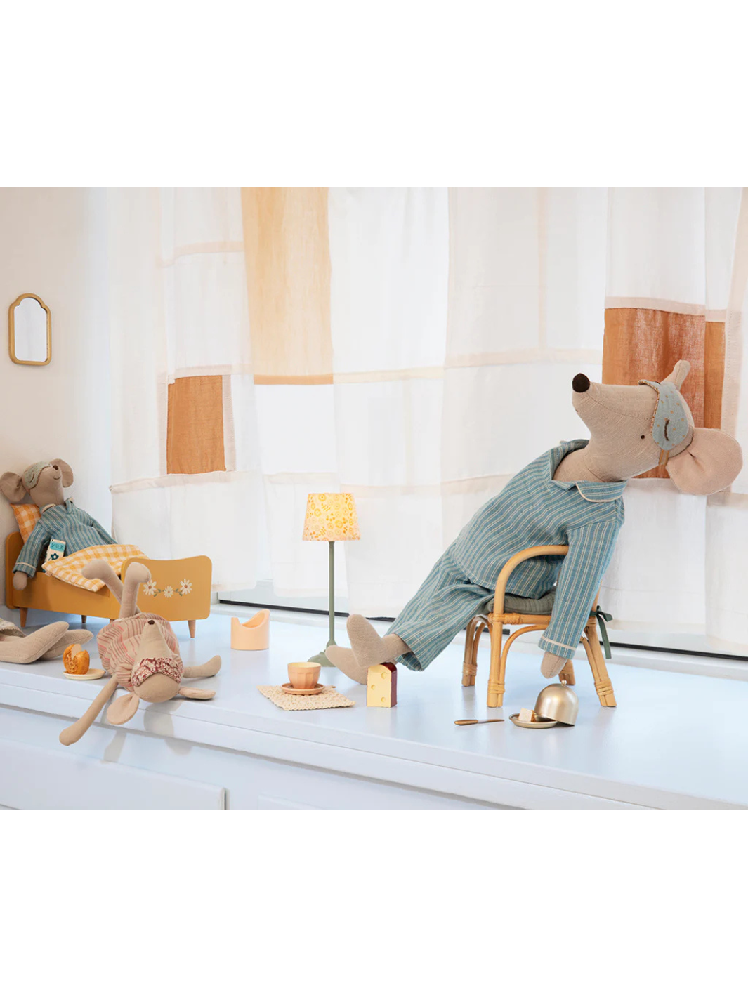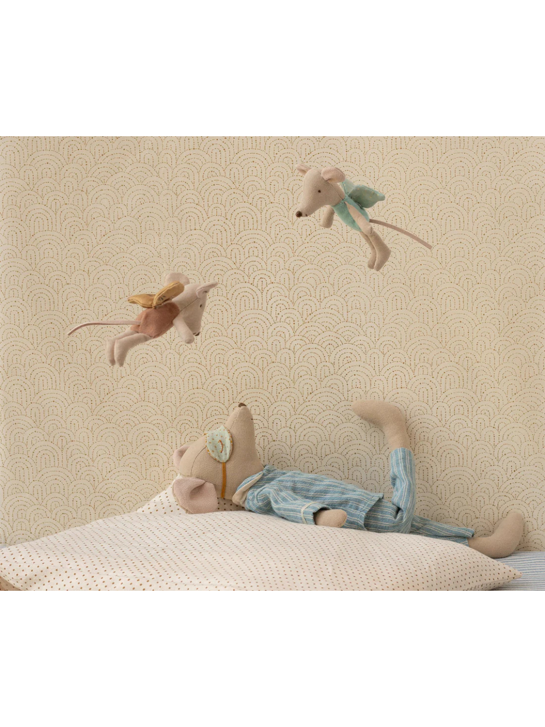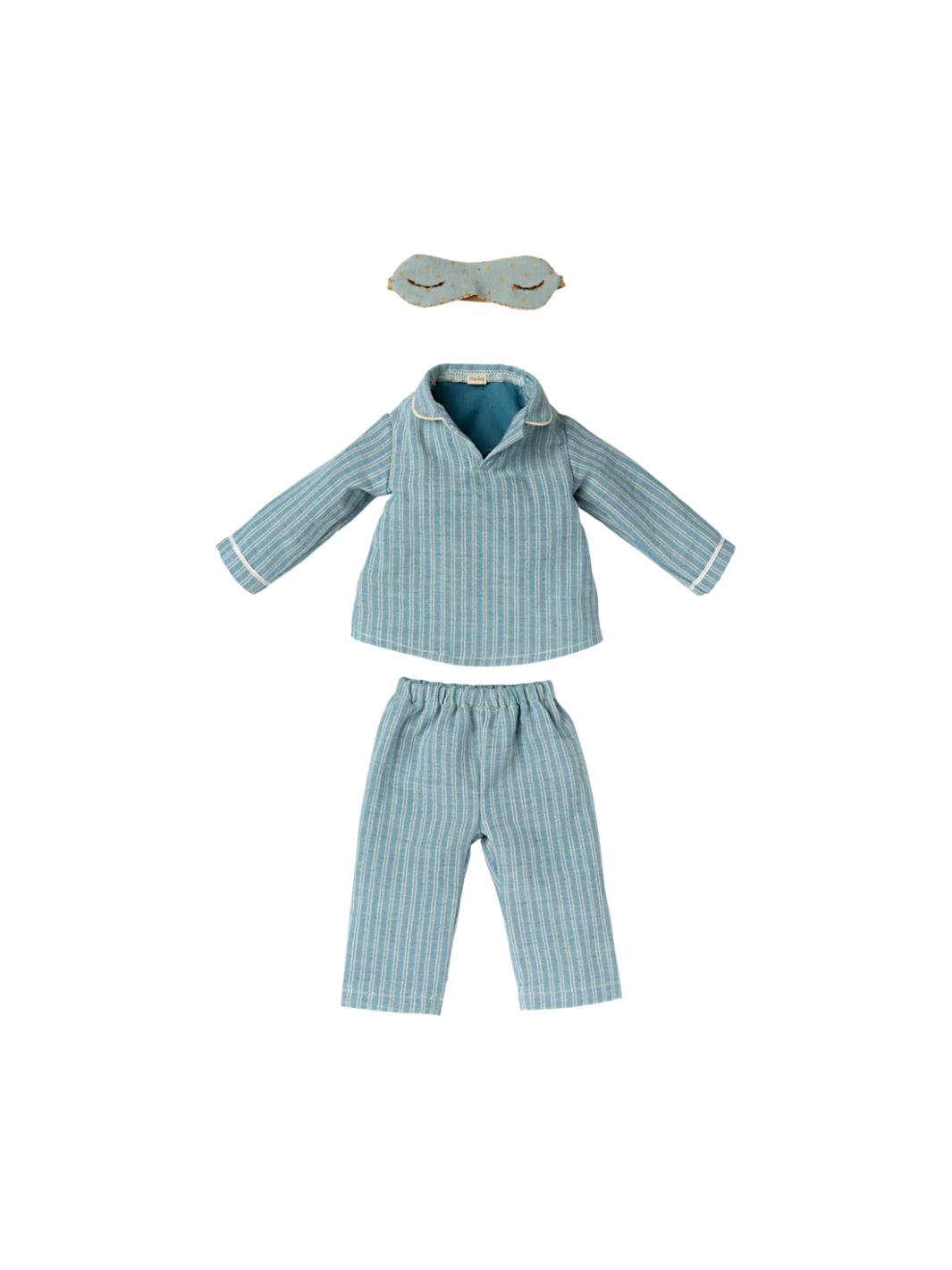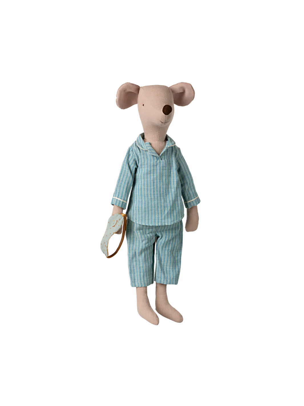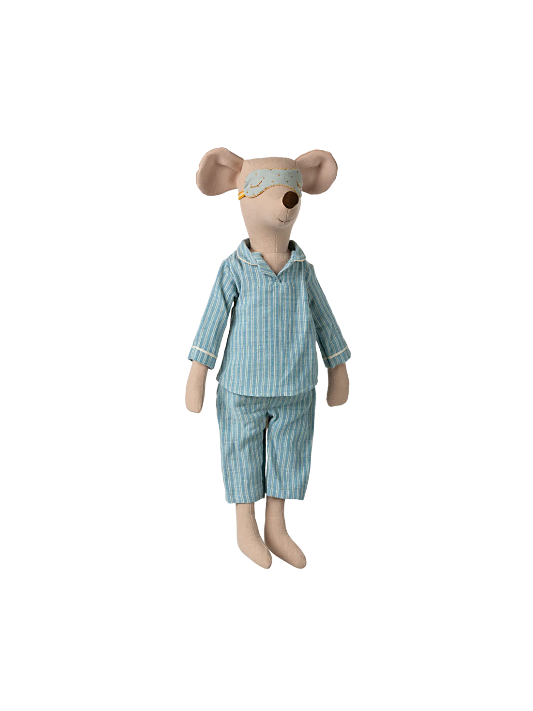 Diese Maxi-Maus von Maileg ist in einen gestreiften Pyjama gekleidet und trägt eine süße Schlafmaske, um einen guten Schlaf zu gewährleisten.