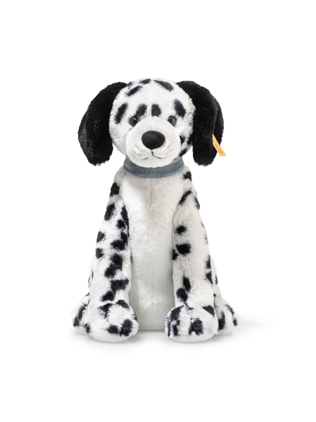 Der sitzende Dalmatiner Oskar von Steiff ist 27 cm groß und aus extra flauschigem Plüsch gefertigt. Mit den typischen schwarzen Punkten auf strahlendem Weiß erobert der Dalmatiner die Herzen kleiner Hunde-Liebhaber im Sturm. Von dem angenähten, blauen Halsband erhält der Hund optisch einen hübschen Kontrast zum schwarz-weißen Fell. Sein freundlicher Hundeblick lädt zum Kuscheln und Spielen ein. Dank der mit Granulat gefüllten Gewichtssäckchen in Beinen, Füßen und Gesäß sitzt der treue Vierbeiner ausgesprochen stabil.