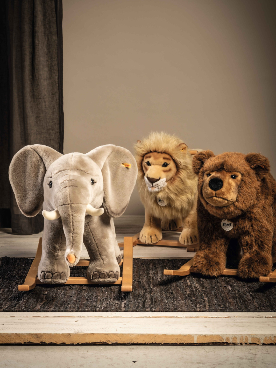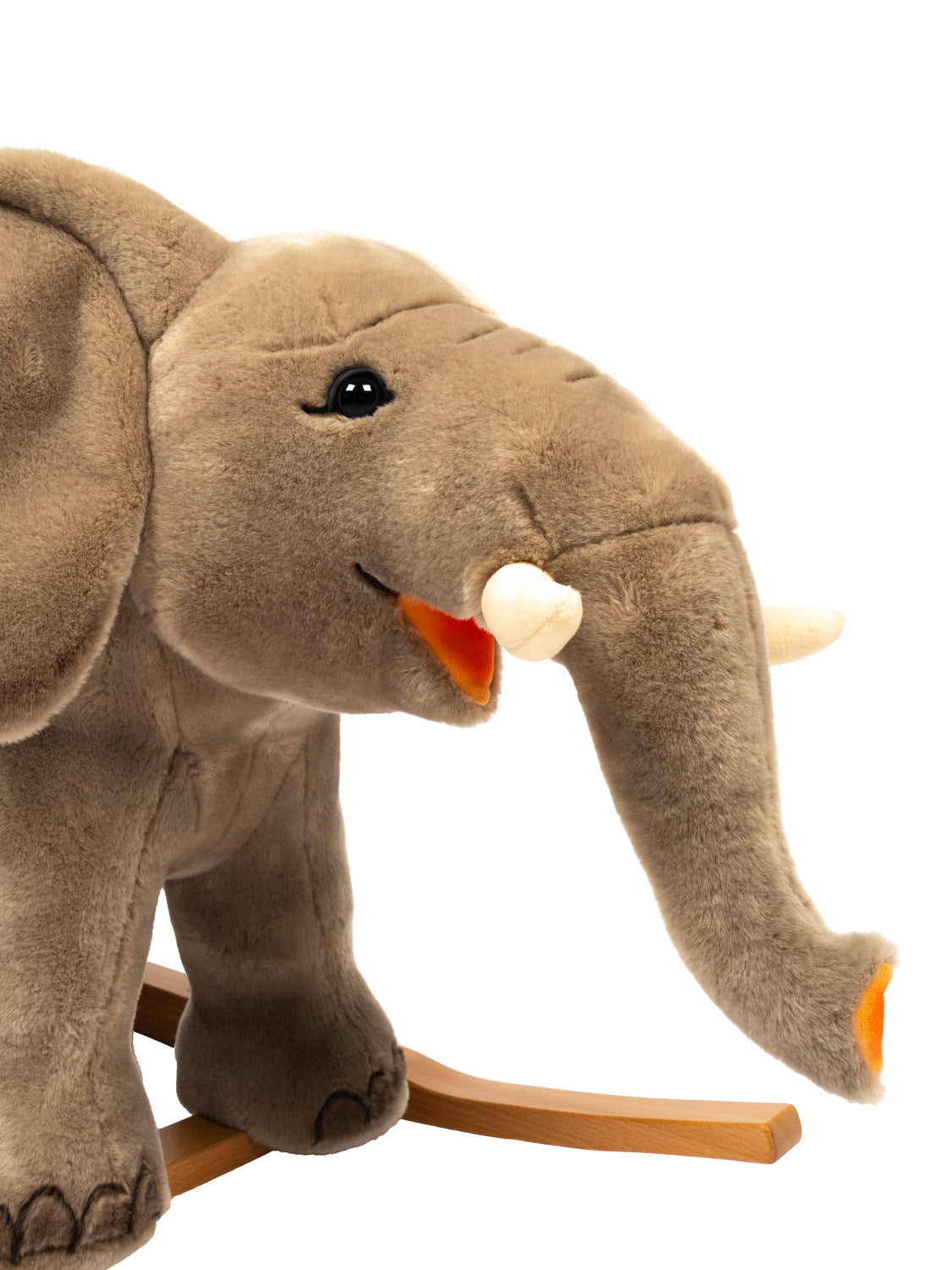 Das liebevoll gestaltete Schaukeltier Elefant Trampili von Steiff ist 70 cm groß und besitzt ein wunderschönes hellgraues Fell und den typischen Steiff-Knopf im Ohr. Trampili wird aus streichelweichem Webpelz gefertigt. Der Reit-Elefant ist abwaschbar und garantiert jede Menge Spaß für Kinder ab 2 Jahren! Die Kufen aus hochwertigem Holz runden das Gesamtbild gekonnt ab. Das Grundgerüst des Schaukeltieres besteht aus handgearbeitetem Edelstahl und bis zu 150 kg belastbar.