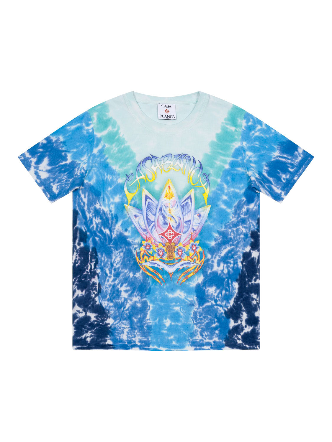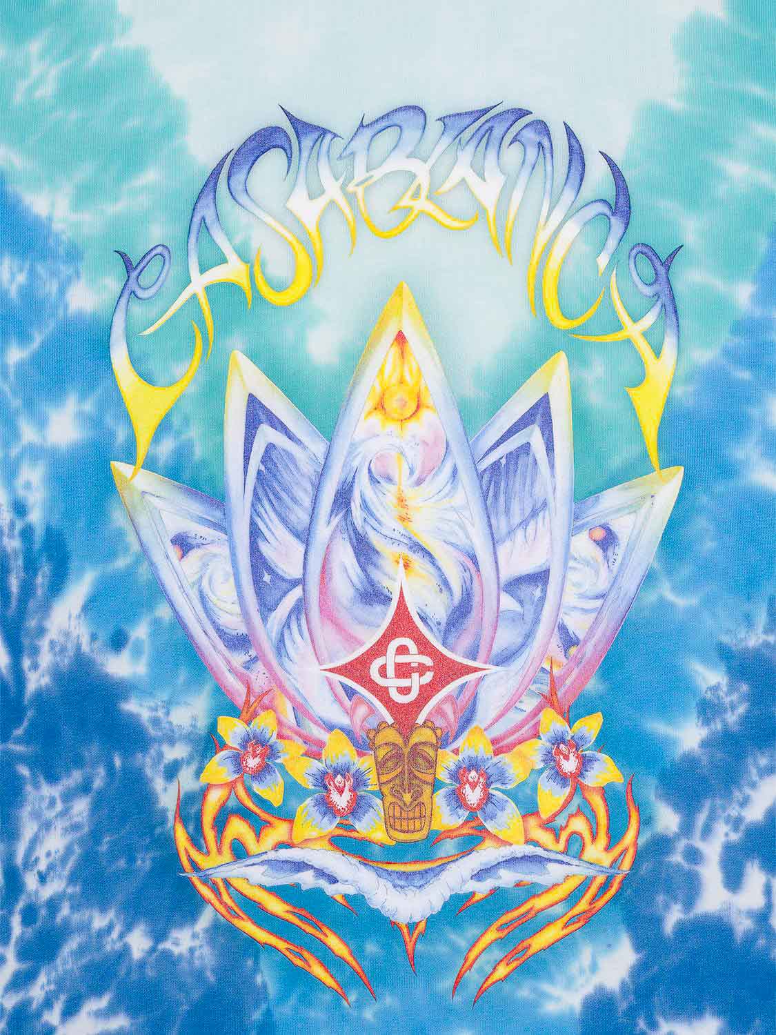 Das Surf-Lotus-Shirt im coolen Batik-Design von Casablanca besticht durch ein psychedelisches Motiv in leuchtenden Farben auf der Vorderseite. Das Motiv zeigt fünf Surfbretter in Form einer Lotusblume, begleitet von einer mit Orchideen verzierten Tiki-Maske.