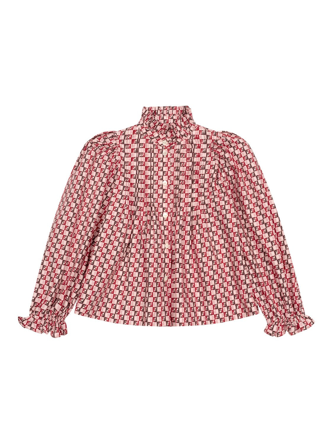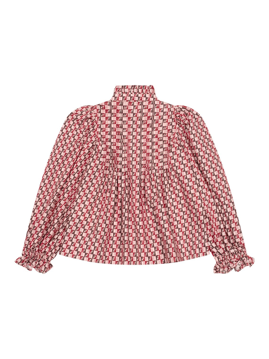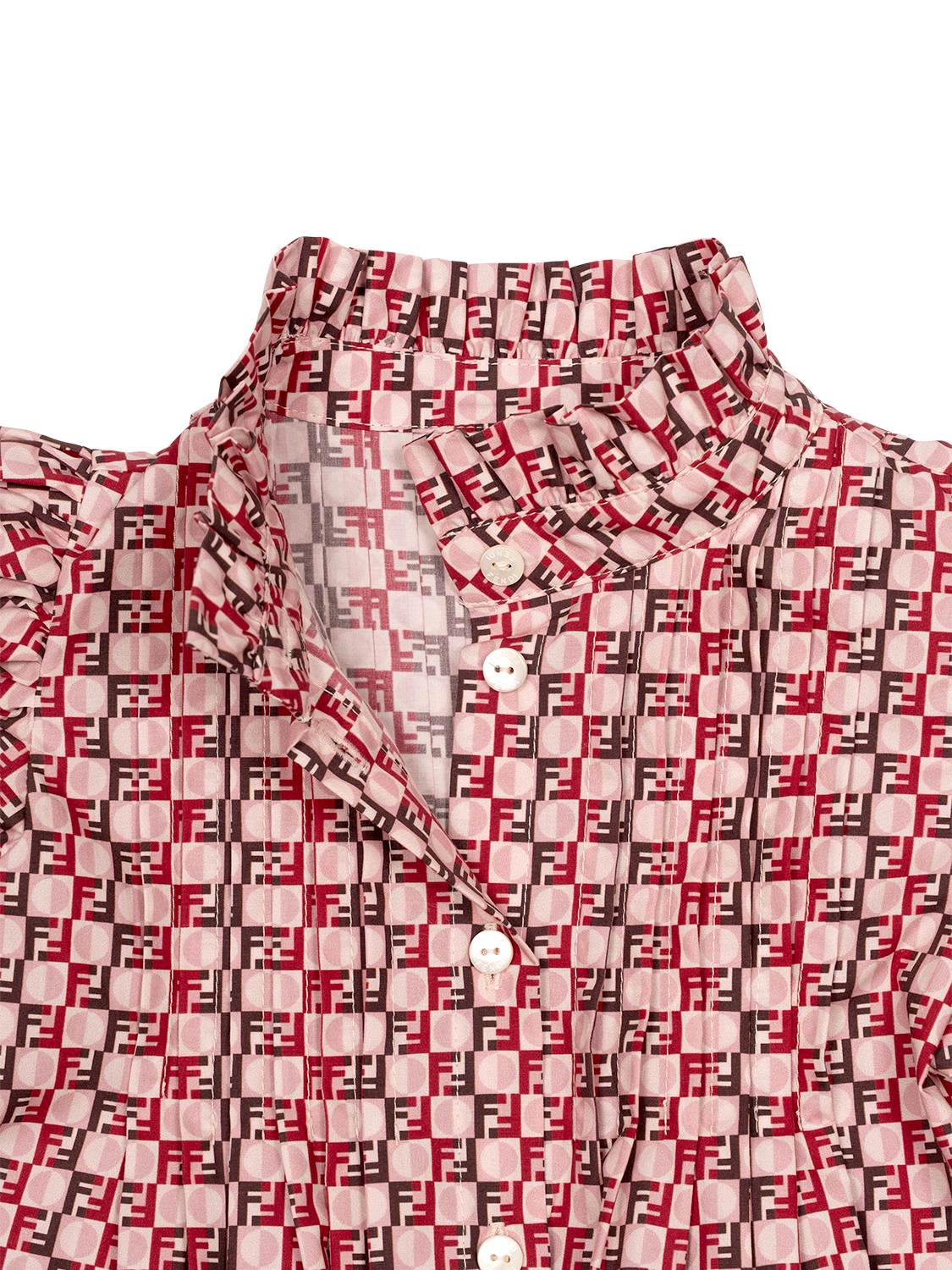 Diese edle Bluse von Fendi besticht mit feinen Biesen-Details auf Vorder- und Rückseite sowie einer raffinierten Interpretation des FF-Logos als Allover-Motiv in Rot- und Rosa-Tönen. Dank der Fertigung aus reiner Baumwolle verspricht das Modell ein traumhaftes Tragegefühl. Eine Bluse, die perfekt zu besonderen Anlässen passt und jedem Outfit das gewisse Etwas verleiht. Neben einem eleganten Rüschen-Stehkragen verfügt das Modell über lange Ärmel mit elastischen Rüschen-Bündchen, einen Knopfverschluss auf der Vorderseite sowie eine leicht ausgestellte Form. An der Seite wird von der ikonischen Logo-Stickerei in Rosa ein labeltypisches Statement gesetzt.