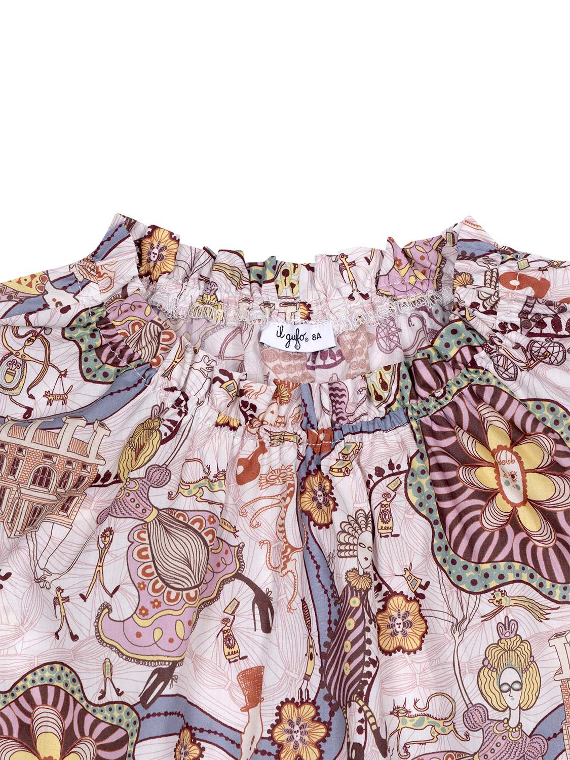 Diese Bluse in Rosa für Mädchen von Il Gufo besticht mit einem einzigartigen Allover-Print verschiedener Motive in zarter Farbgebung. Rüschen am Rundhalsausschnitt und den elastischen Ärmelbündchen unterstreichen den verspielten Charakter, während die Fertigung aus reiner Baumwolle höchsten Tragekomfort verspricht. Die ausgestellte Passform rundet das Gesamtbild harmonisch ab und erhält von einem Logo-Etikett an der Seitennaht ein labeltypisches Finish.