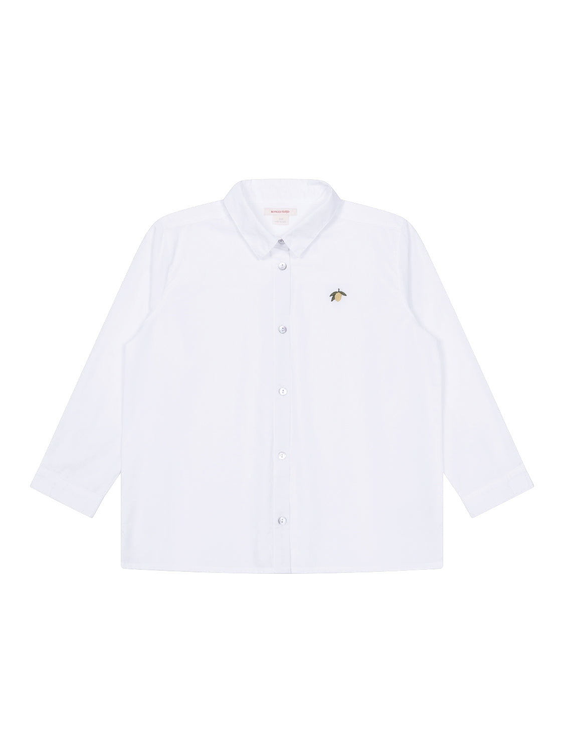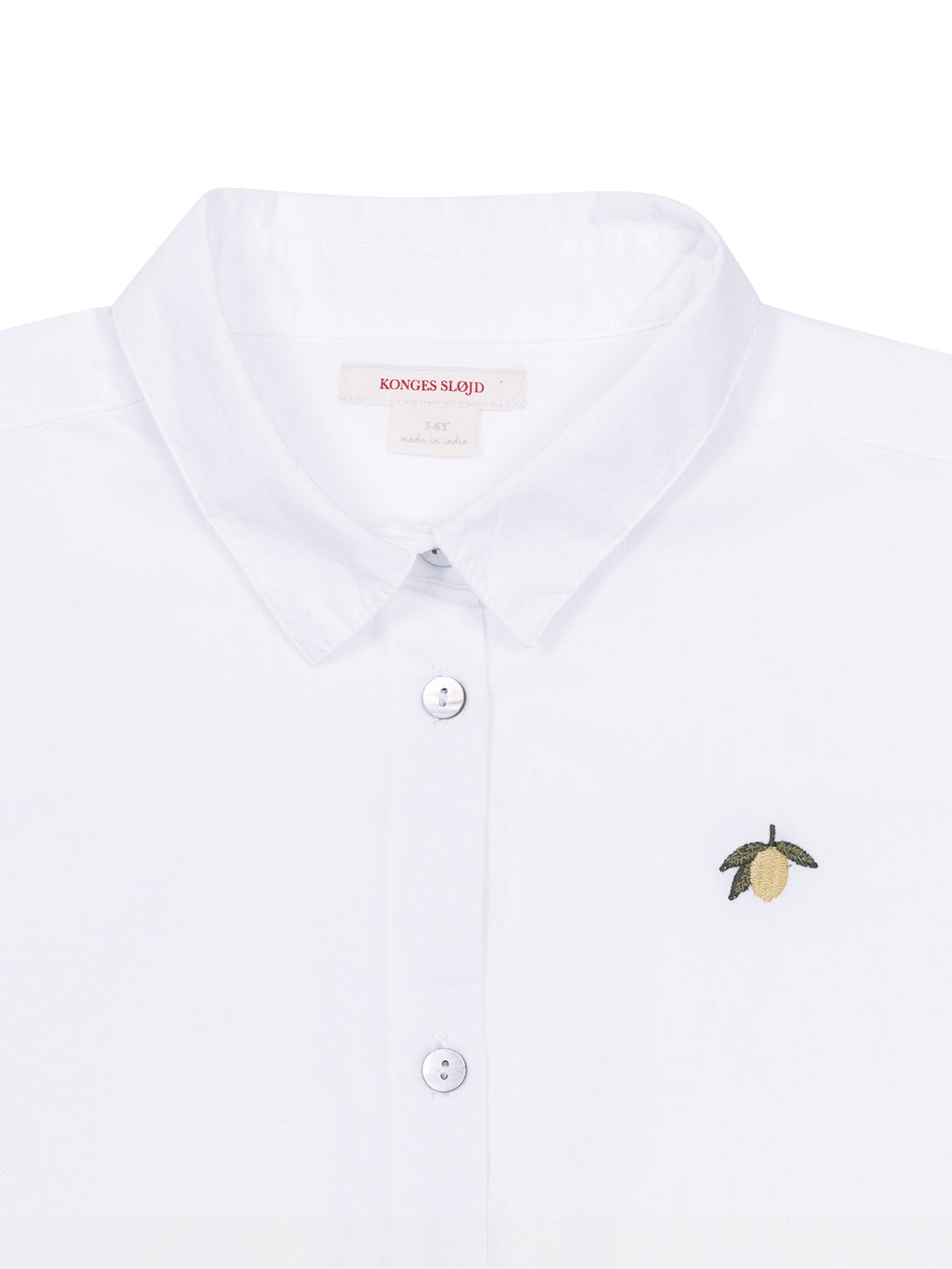 Das klassische Hemd Ray in Weiß von Konges Sløjd überzeugt mit zeitlosem Stil und liebevollen Details. Ausgestattet mit einem regulären Kragen, langen Ärmeln mit geknöpften Manschetten und edlen Knöpfen aus Perlmutt auf der Vorderseite. Auf der Brust verleiht eine kleine Zitronen-Stickerei dem Hemd den typischen Konges Sløjd Look mit besonders viel Charme.