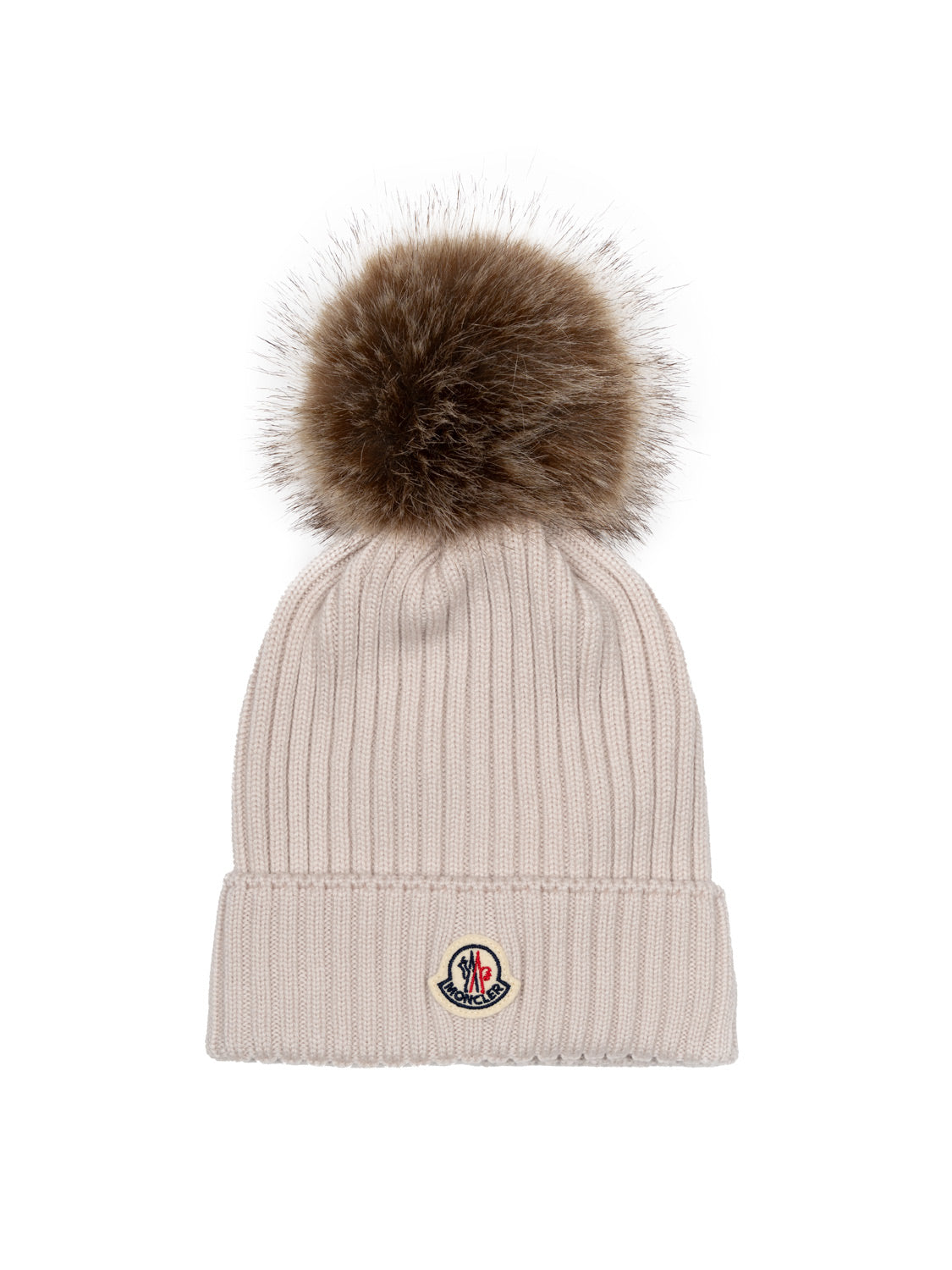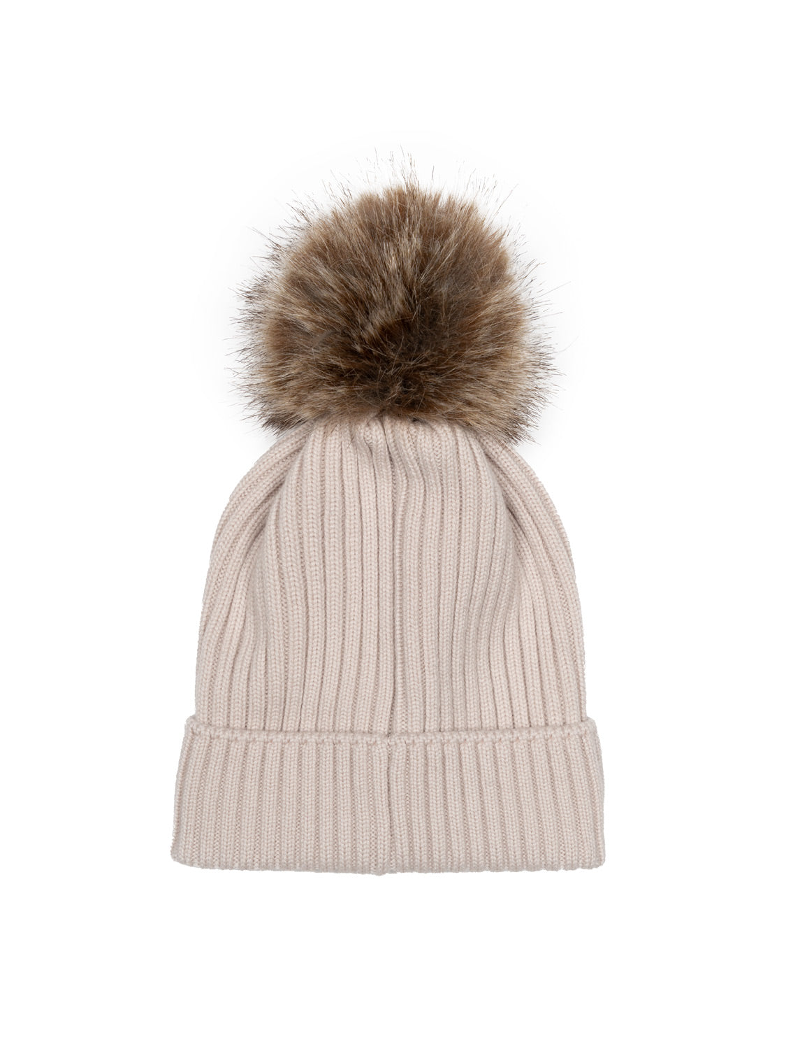 Mütze aus Merinowolle mit Bommel aus Kunstpelz - Creme