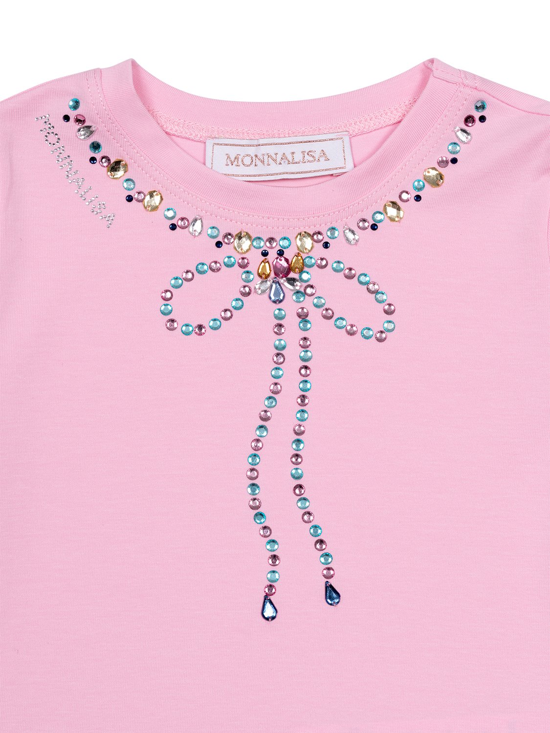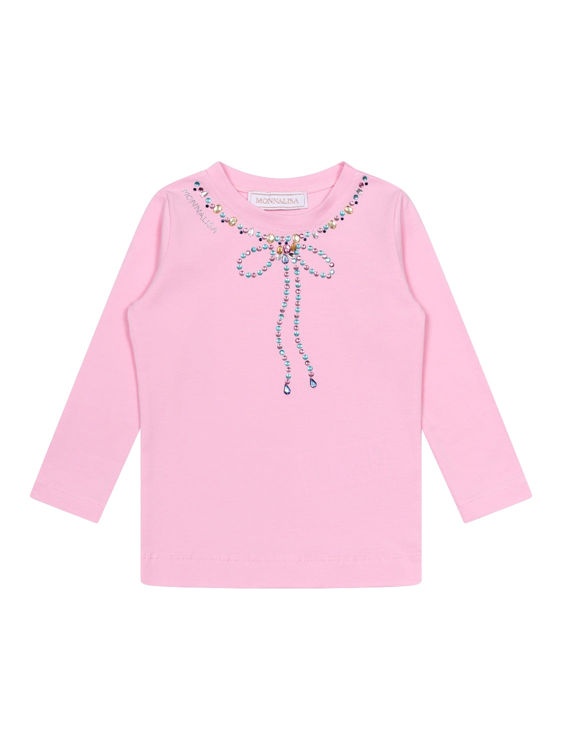Dieses bezaubernde T-Shirt in Rosa von Monnalisa zieht mit seiner verspielten Strassstein-Verzierung alle Blicke auf sich. Bunte Strasssteine bilden am Ausschnitt eine süße Schleife und werden von einem strassbesetzten Logo an der Schulter gekonnt ergänzt. Neben einem Rundhalsausschnitt verfügt das Modell über lange Ärmel sowie eine leicht ausgestellte Passform. Dank der Fertigung aus weichem Baumwolljersey verspricht das Shirt ein traumhaftes Tragegefühl.