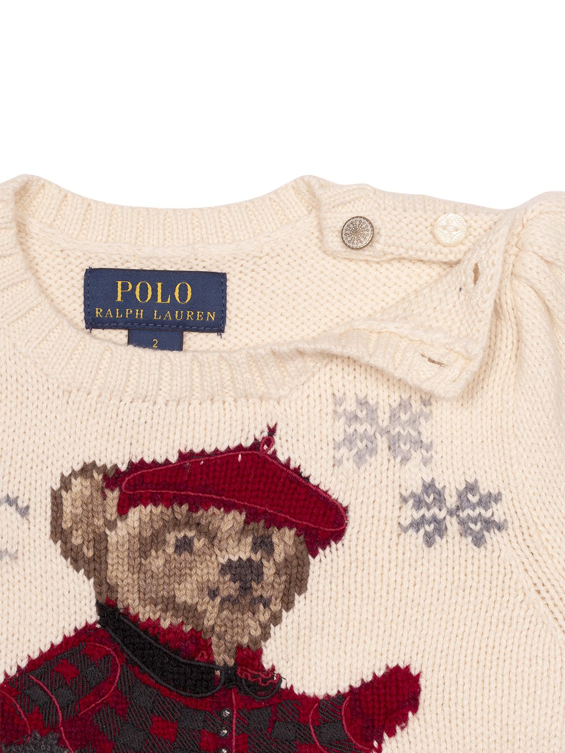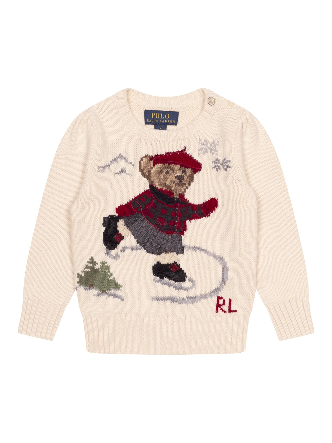 Dieser bezaubernde Strickpullover in Creme von Ralph Lauren präsentiert auf der Vorderseite das ikonische Polo-Bären-Maskottchen in einer winterlichen Schlittschuh-Szene. Die raffinierte Strickintarsie erhält von gestickten Details den letzten Schliff. Dank der Herstellung aus kuschelweicher, glatt gestrickter Baumwolle verspricht das Modell ein traumhaftes Tragegefühl. Zudem ist der edle Pullover mit einem Rippstrick-Rundhalsausschnitt, einem praktischen Knopfverschluss an der Schulter, langen Puffärmeln mit Rippstrick-Bündchen, einer normalen Passform sowie einem Rippstrick-Saum ausgestattet. Von der charakteristischen Monogramm-Strickintarsie am vorderen Saum wird das Gesamtbild gekonnt vollendet.